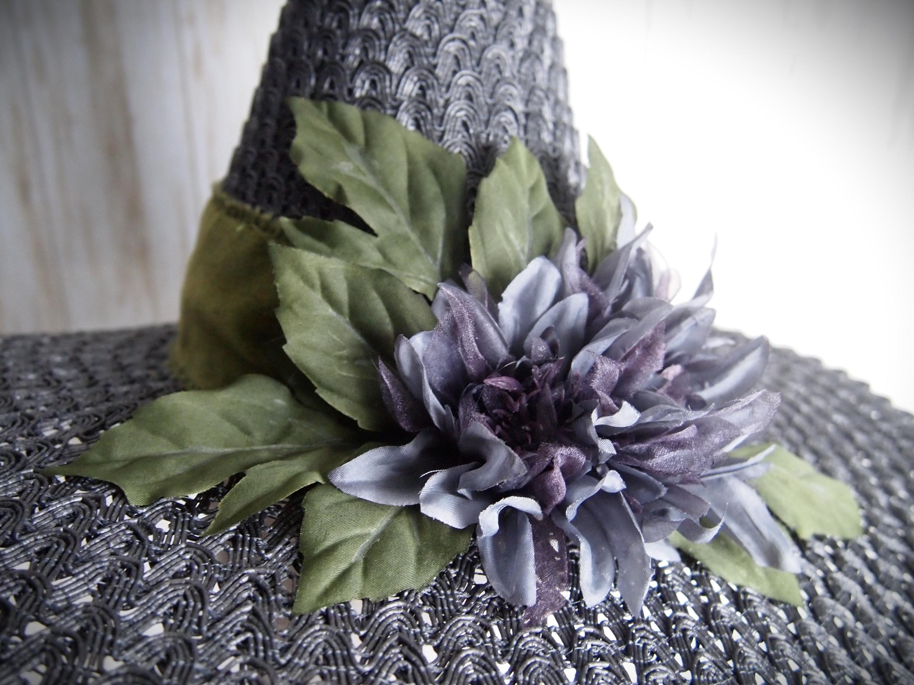 This cutie is adorned with an olive green band, gray variegated floral with a warm lavender hint, and foliage for texture!