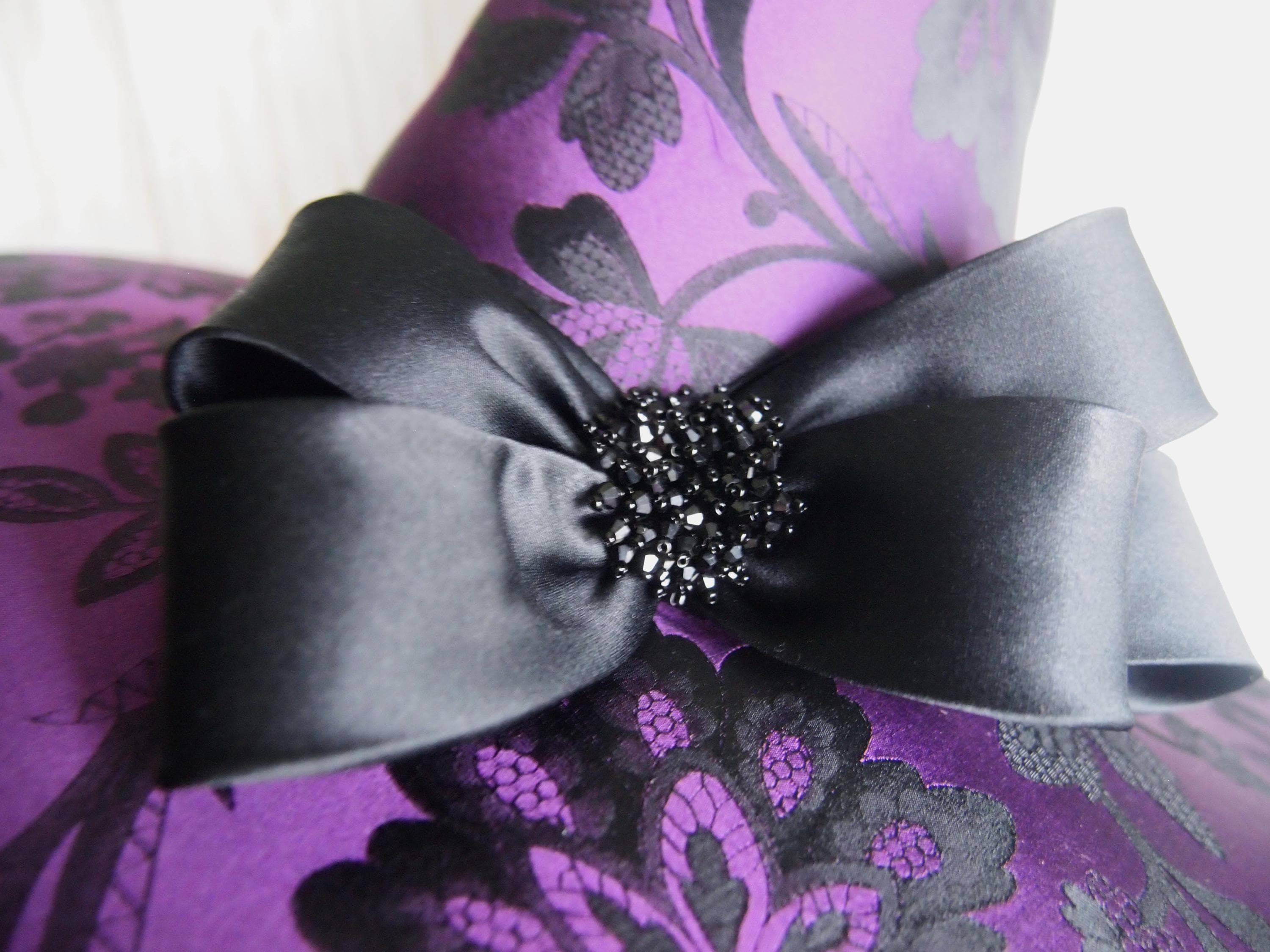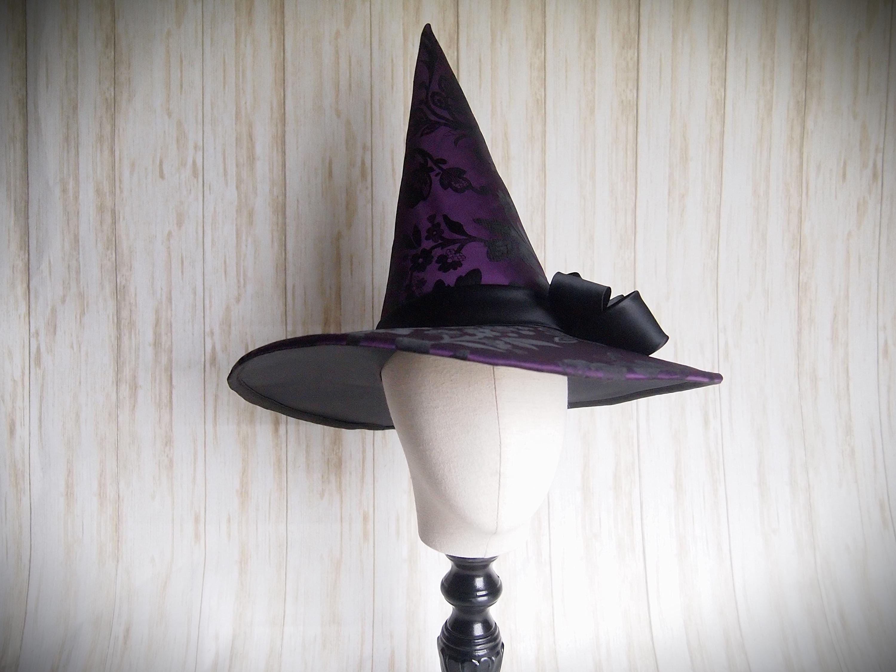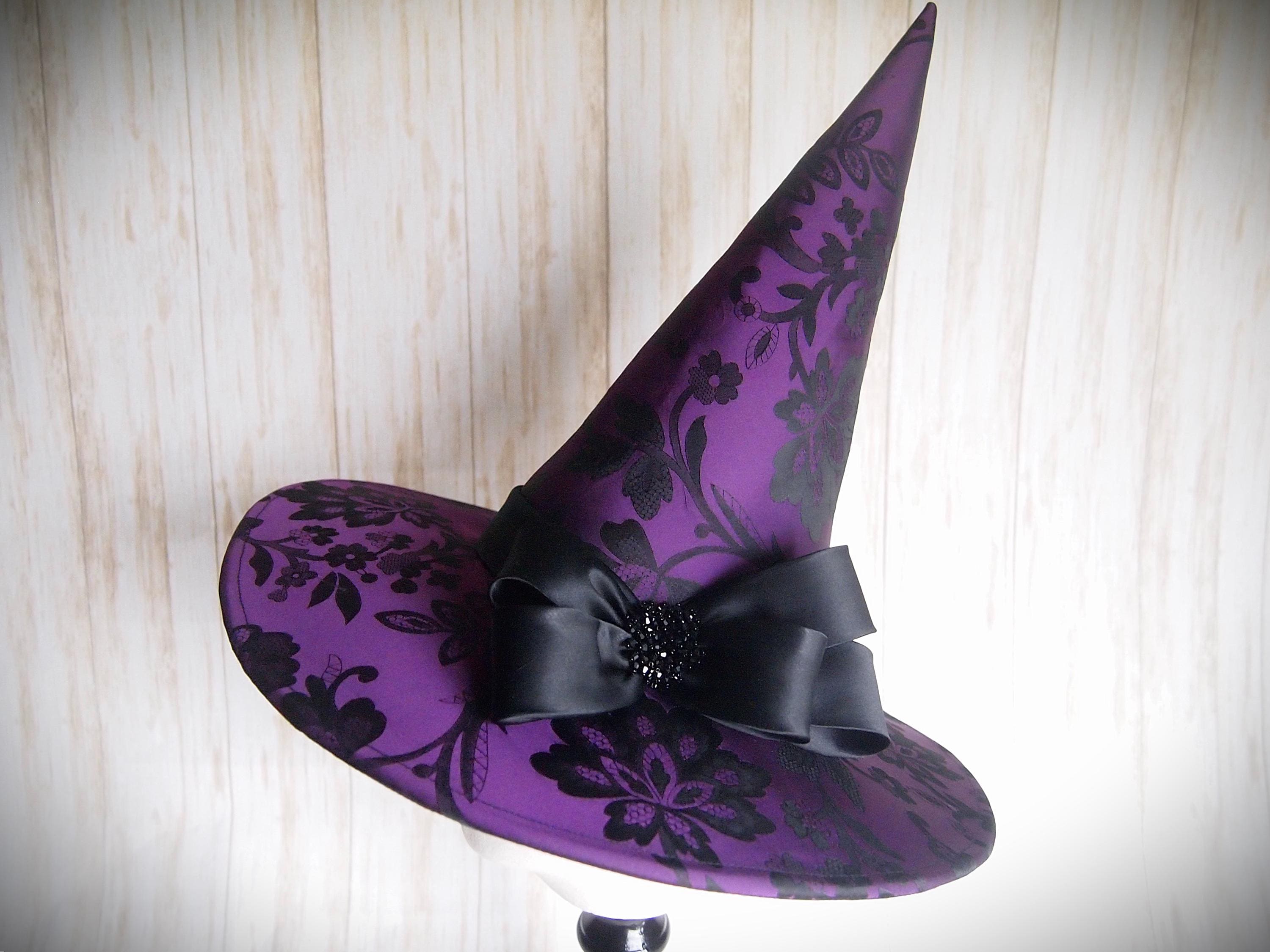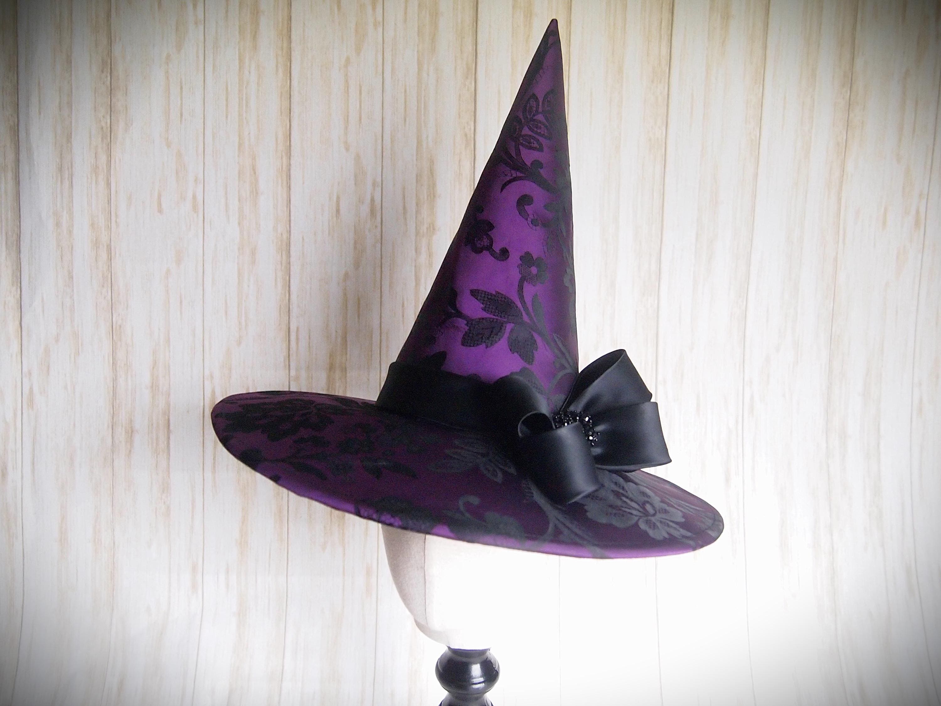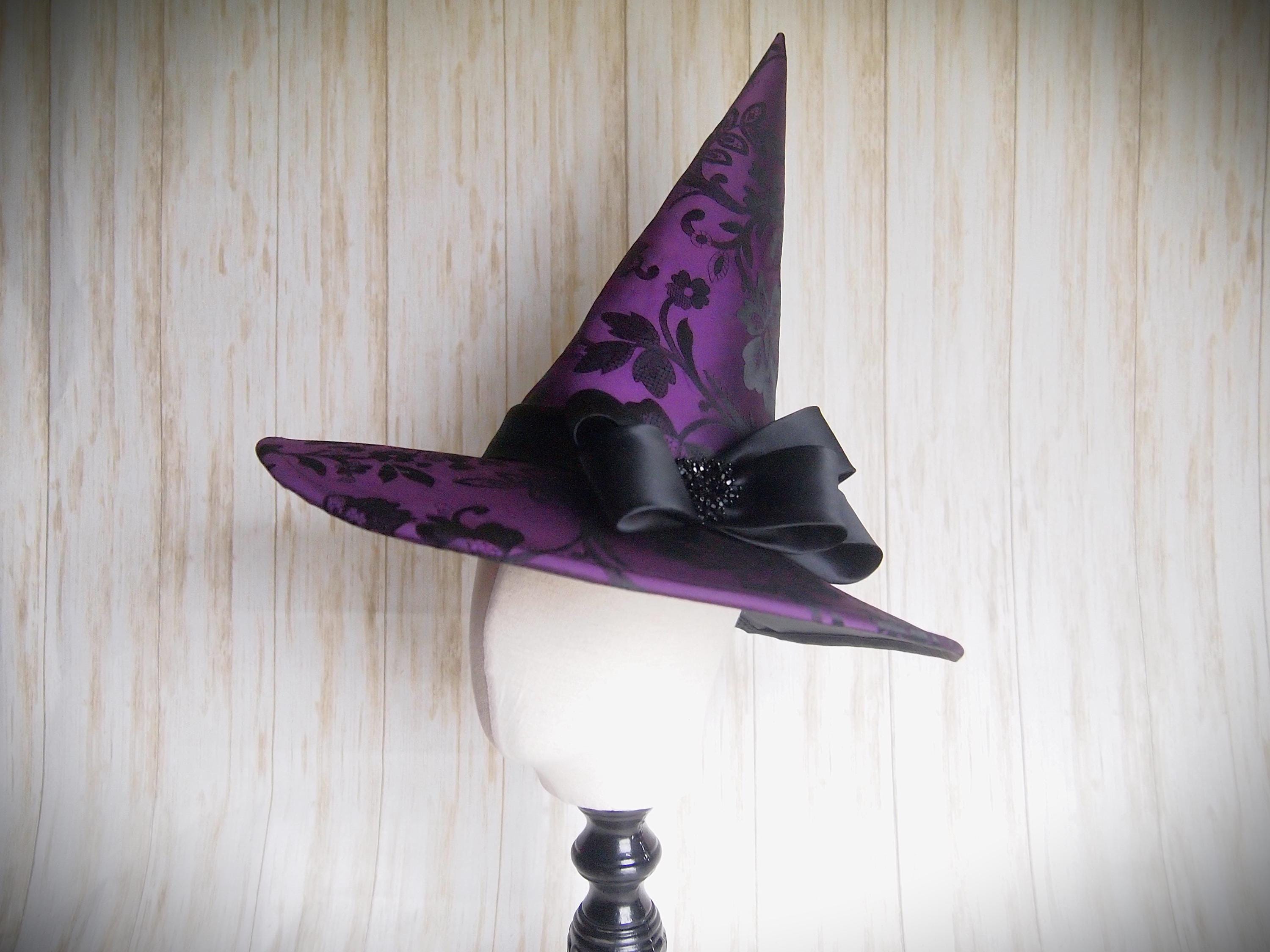 Purple and black Brocade Witch Hat with black band and black beaded details.