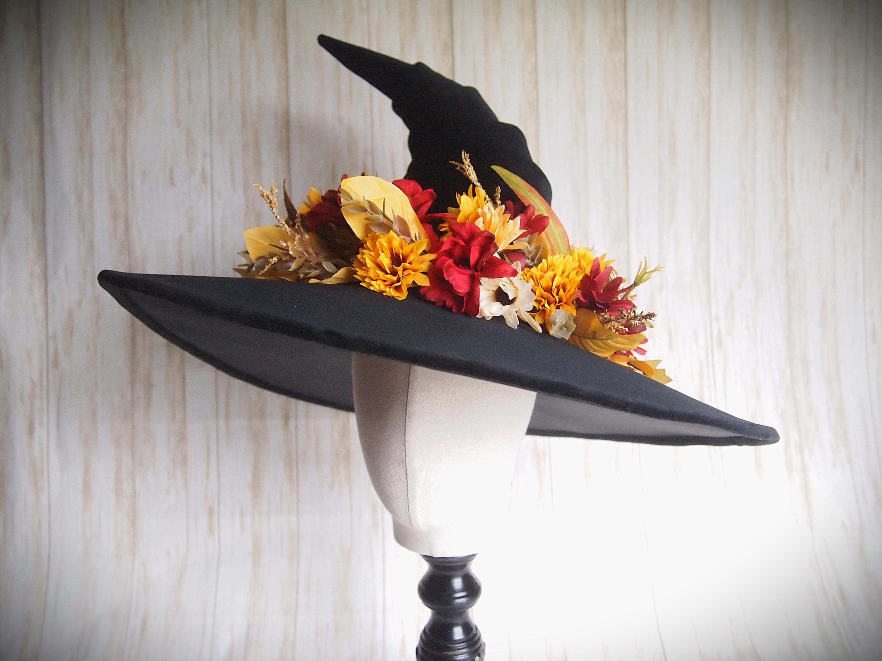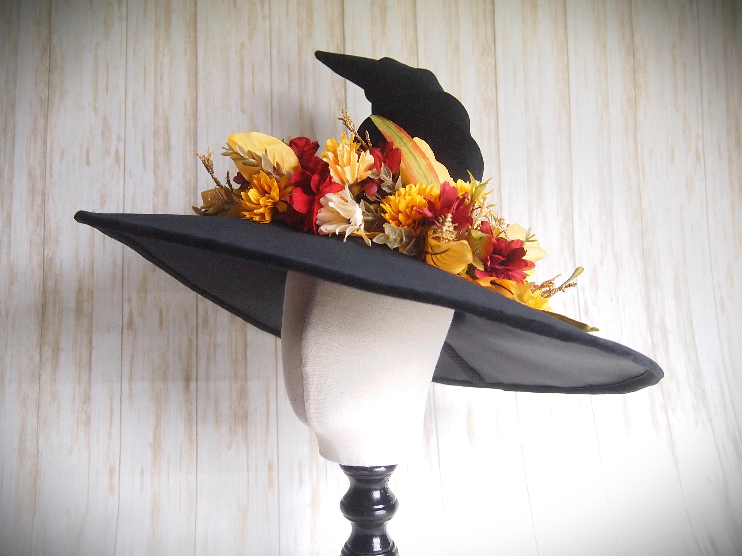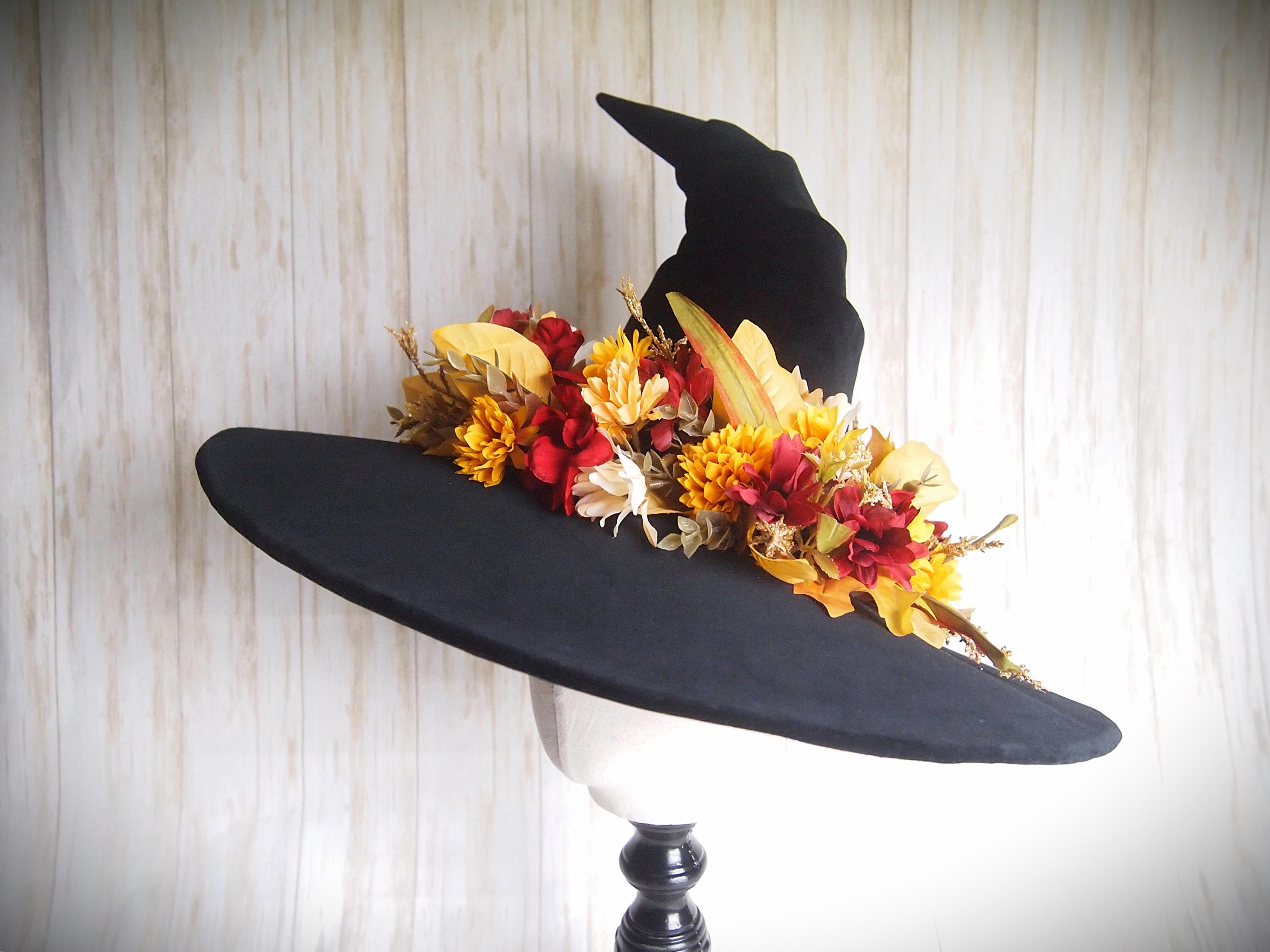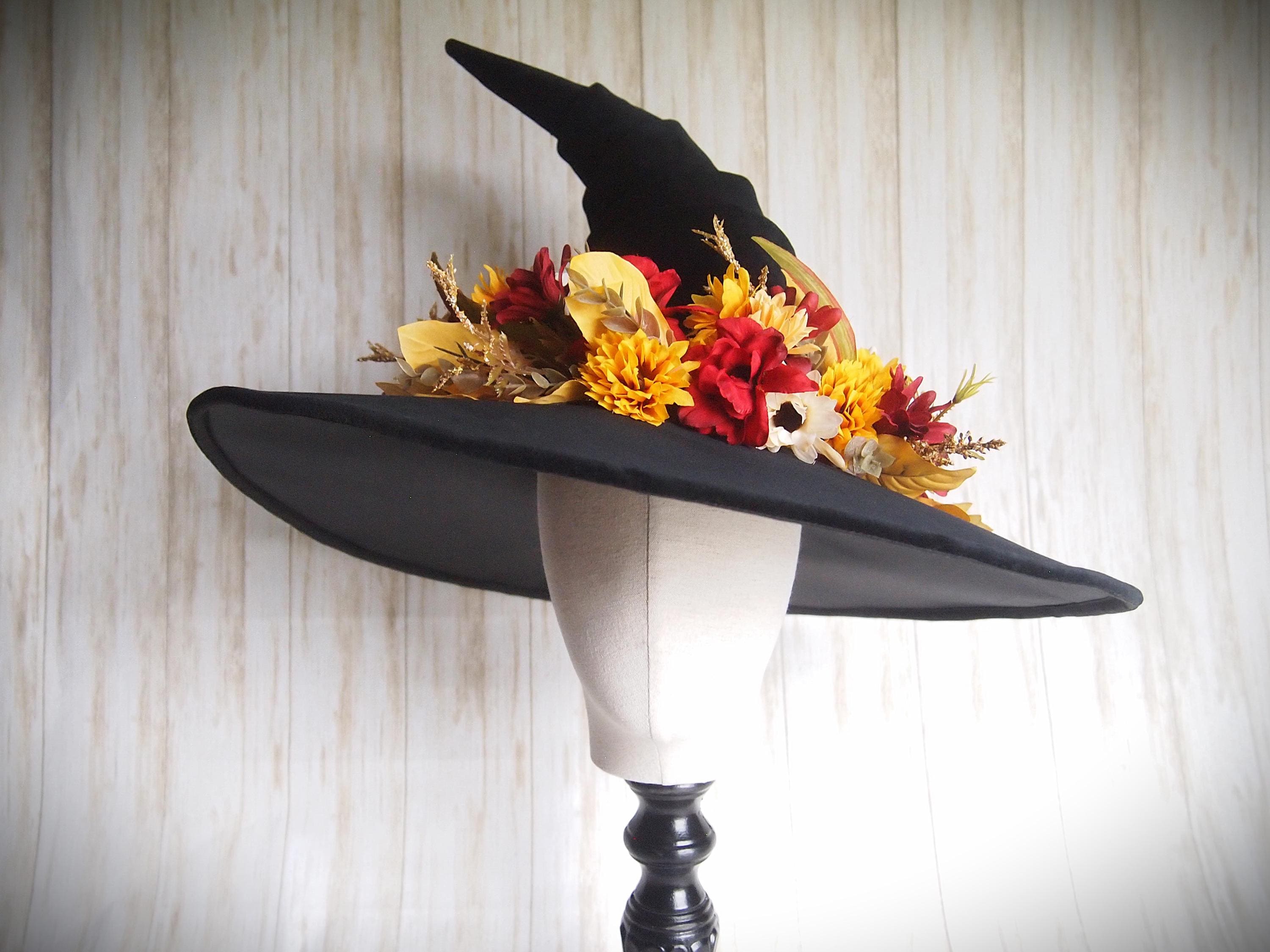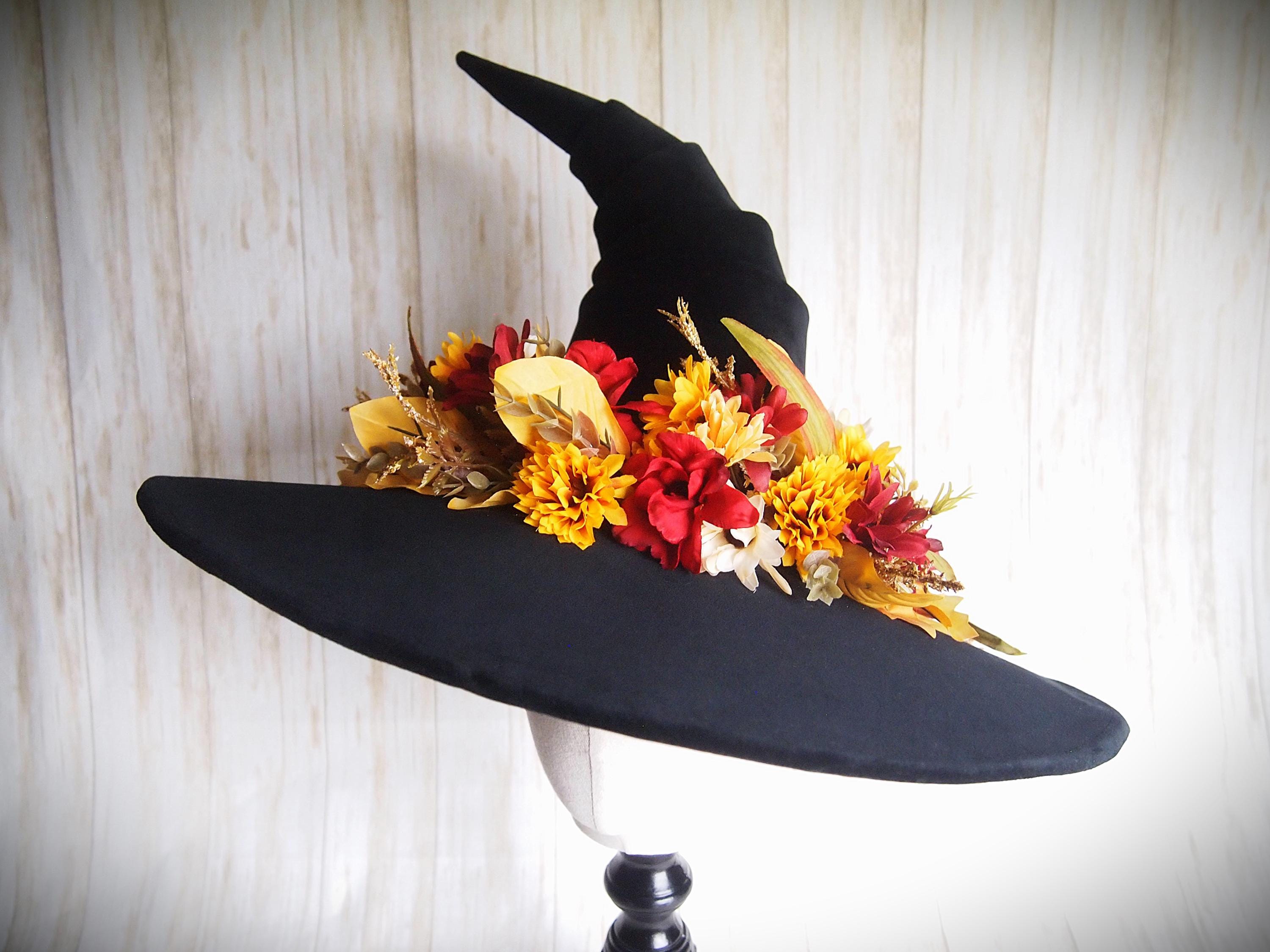 Our hand crafted Black velveteen Witch Hat encircled with flowers and foliage.