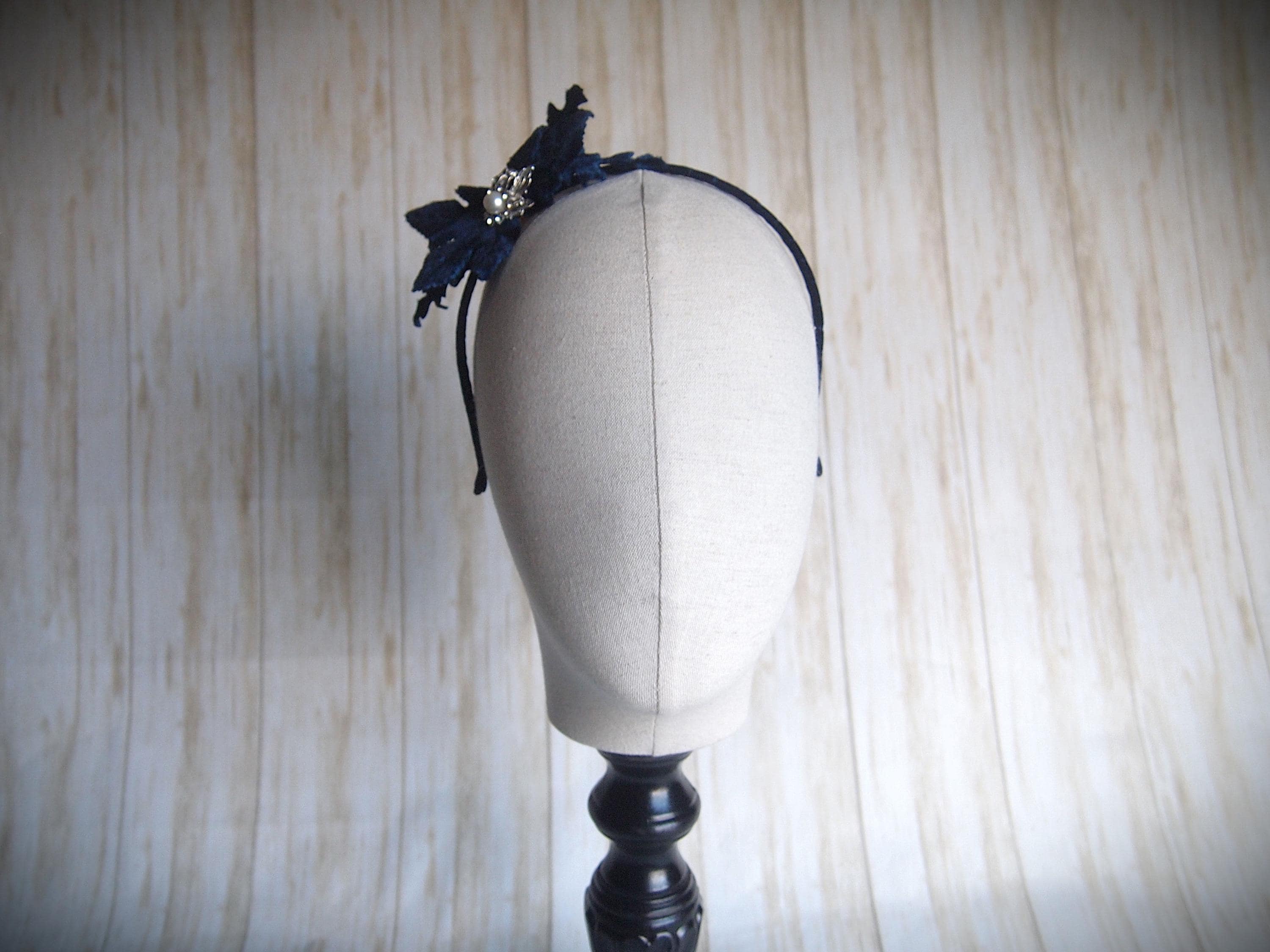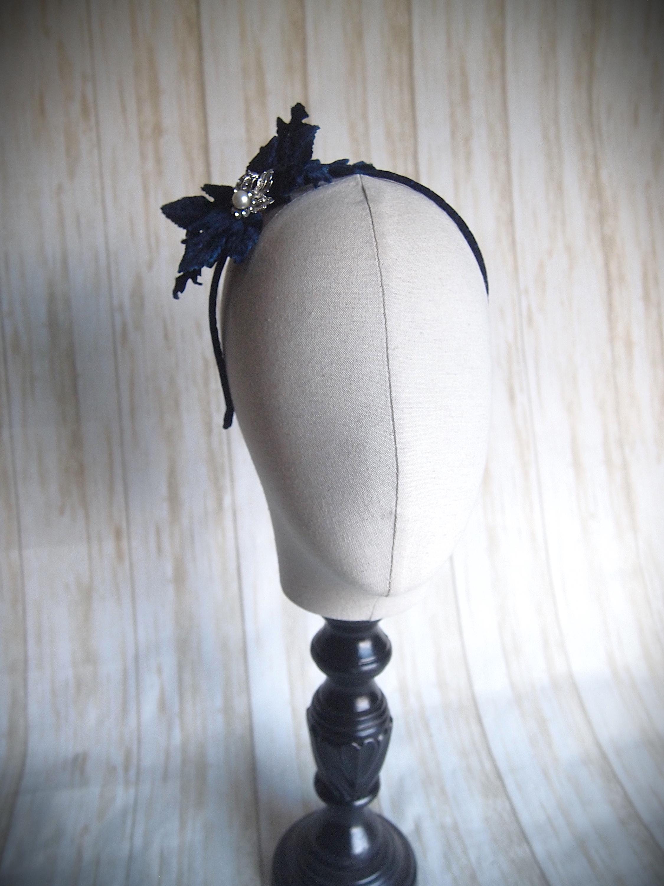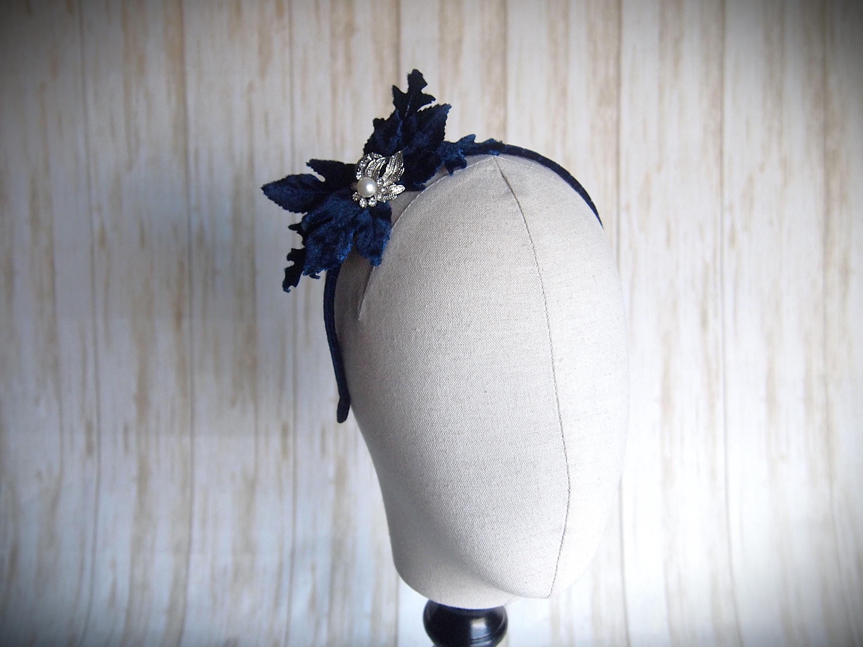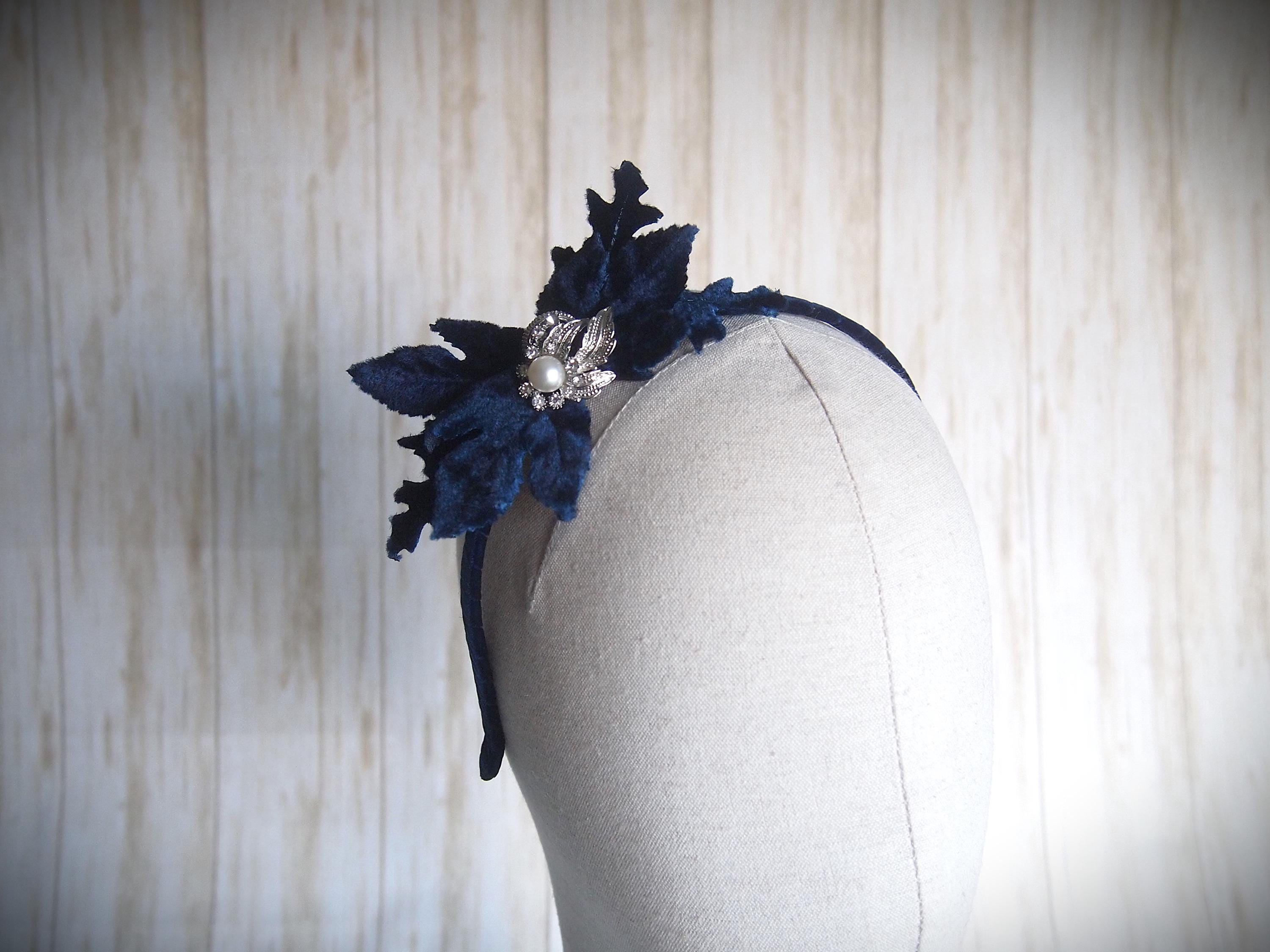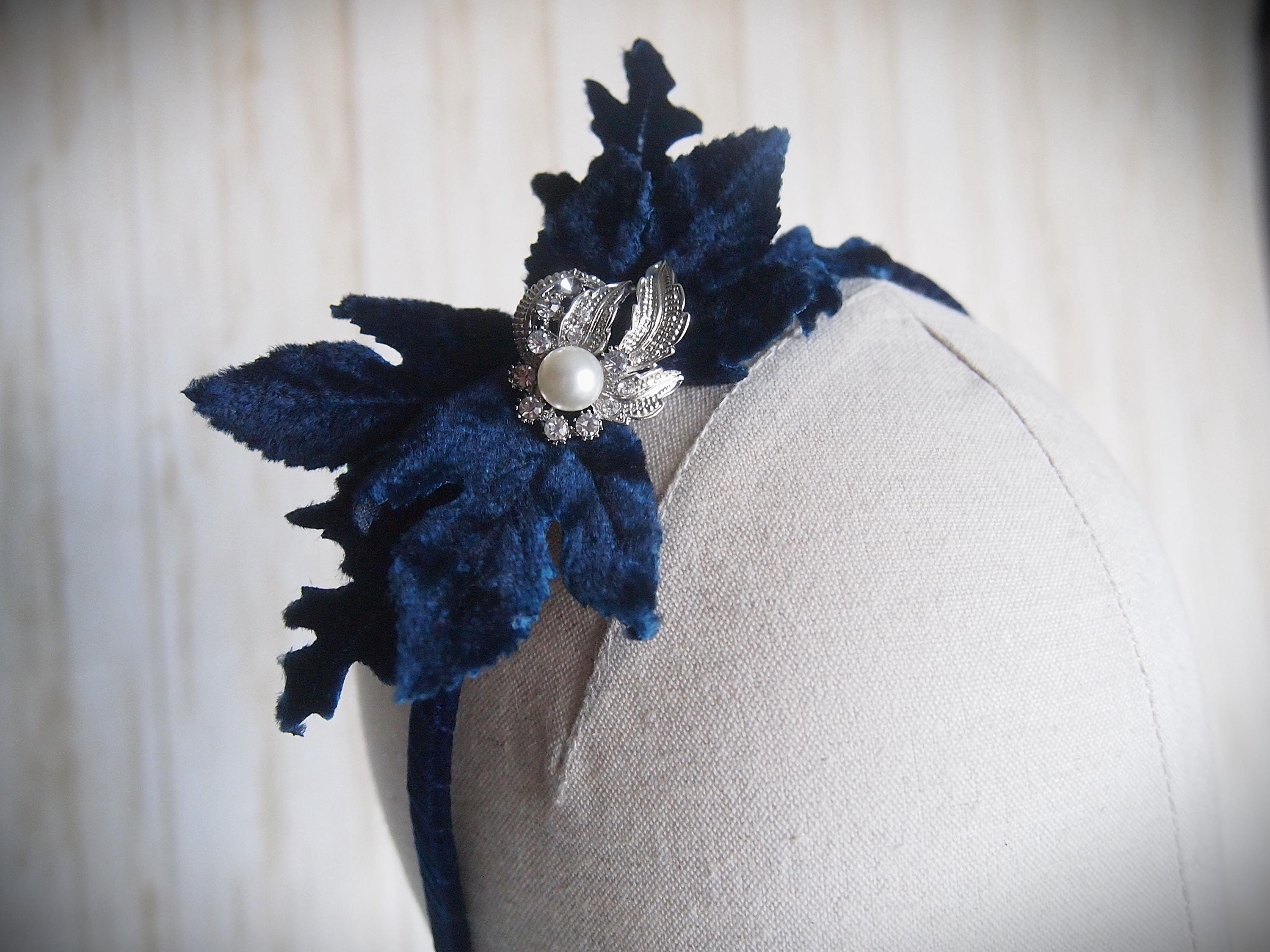 Handmade velvet headband with vintage velvet leaves on one side and a rhinestone and pearl centerpiece. Very 1920's vibes!