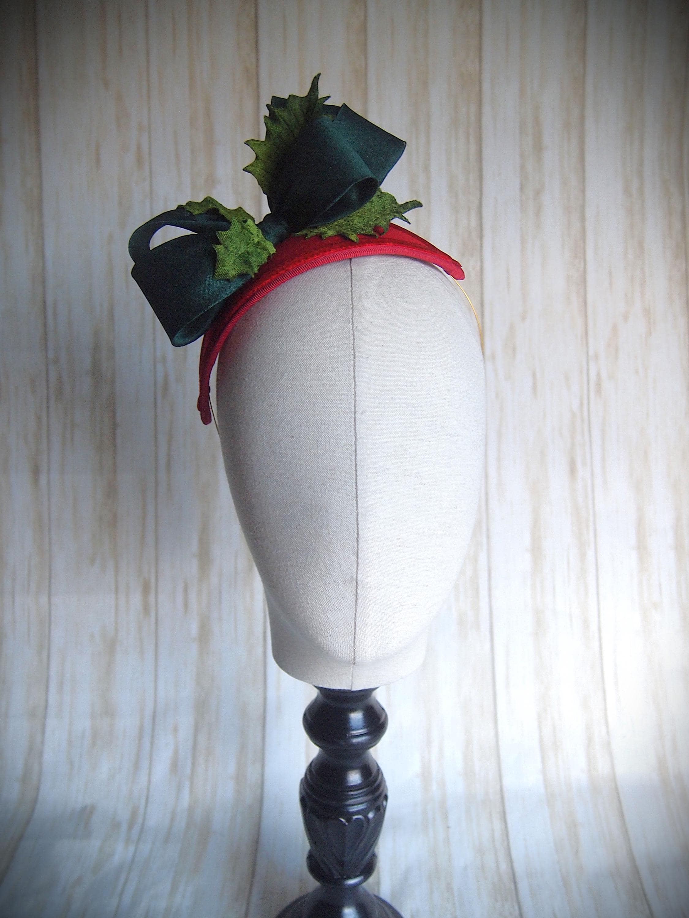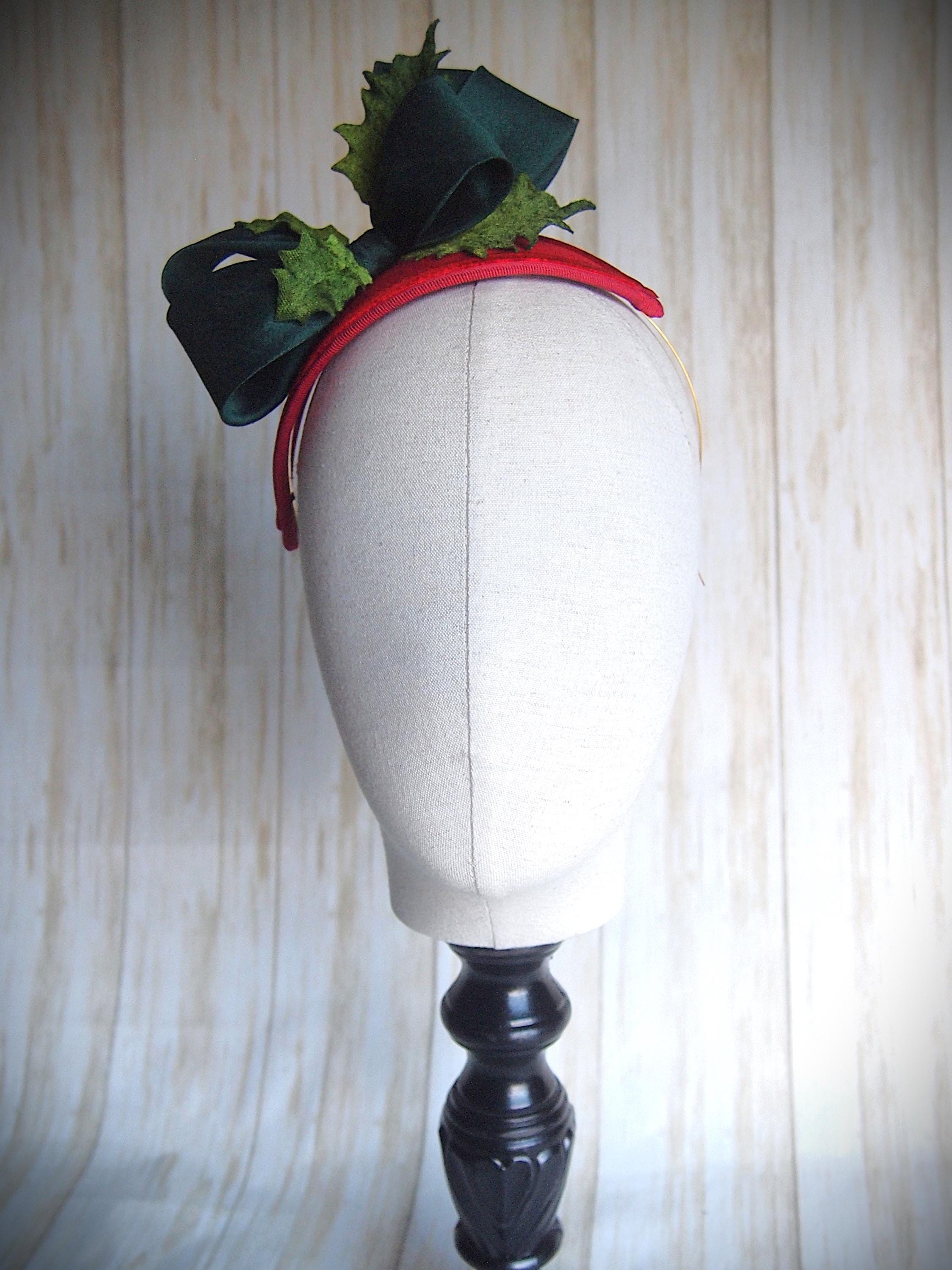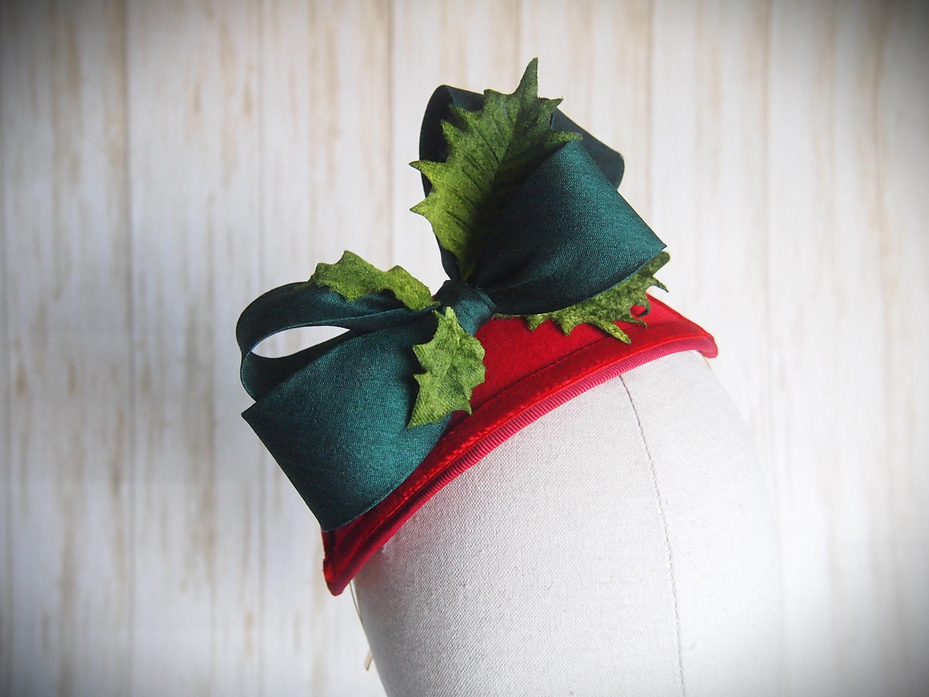Made with a hand made red wool felt base with velvet edge and adorned with a faux silk bow, and velvet holly leaves.