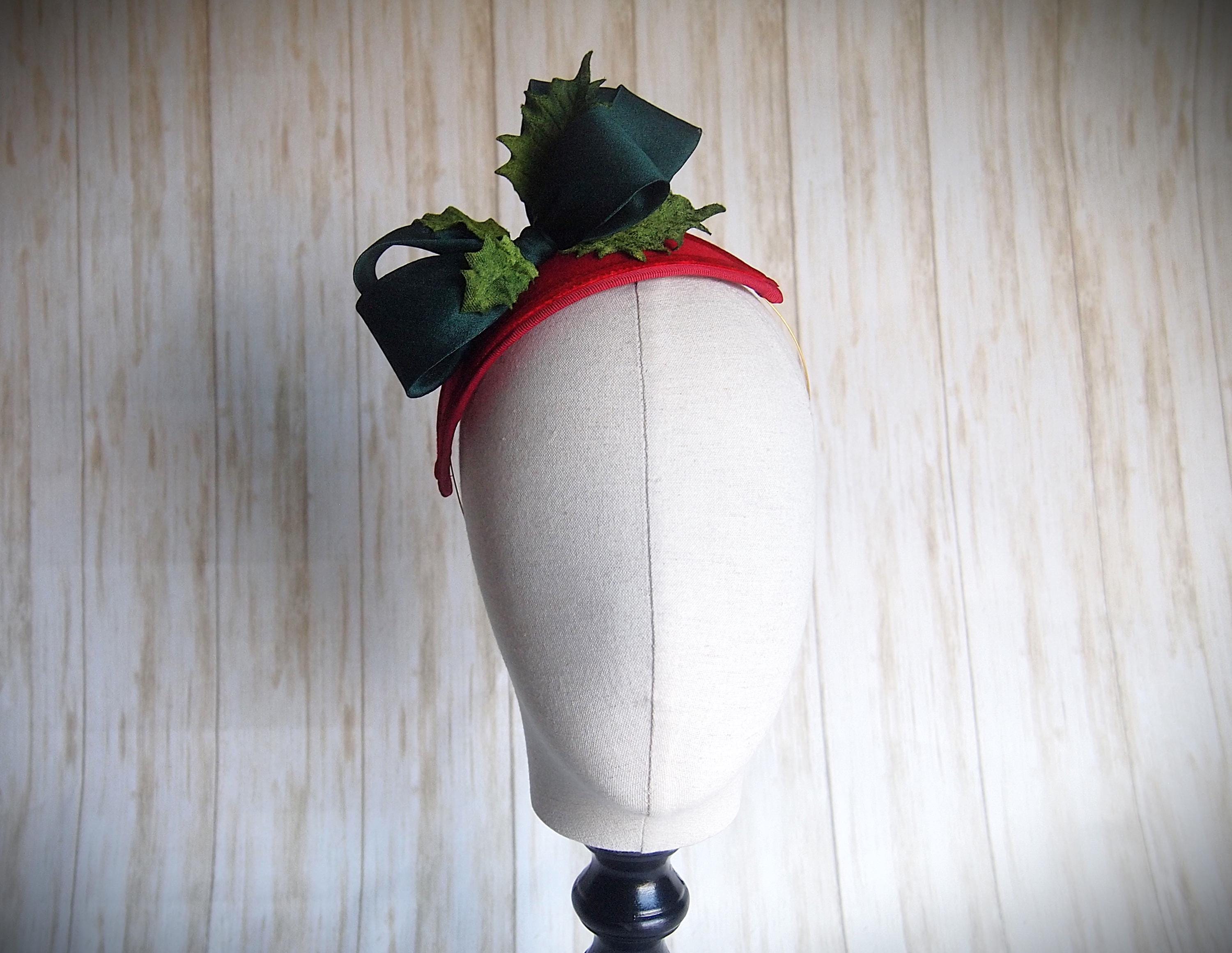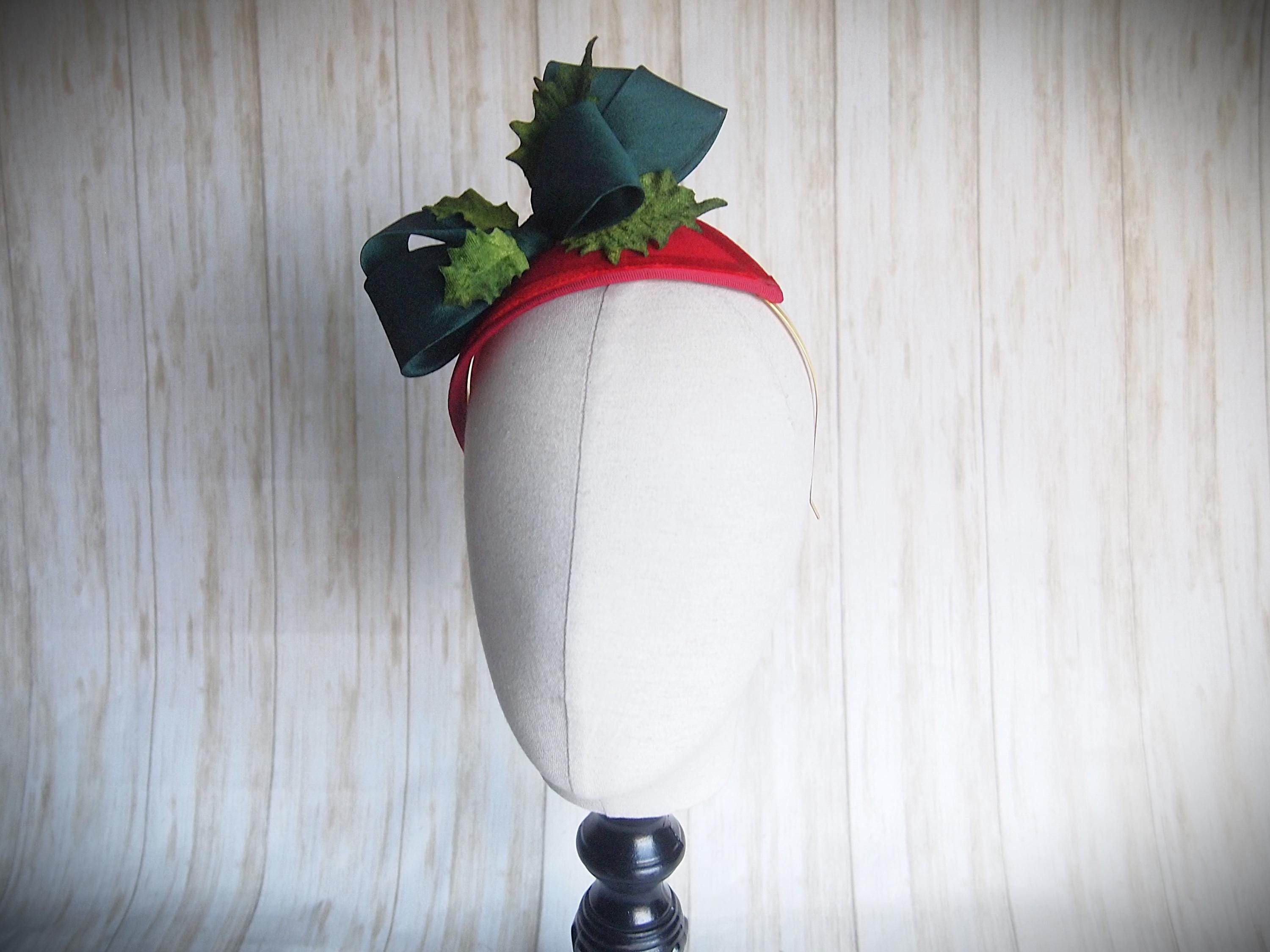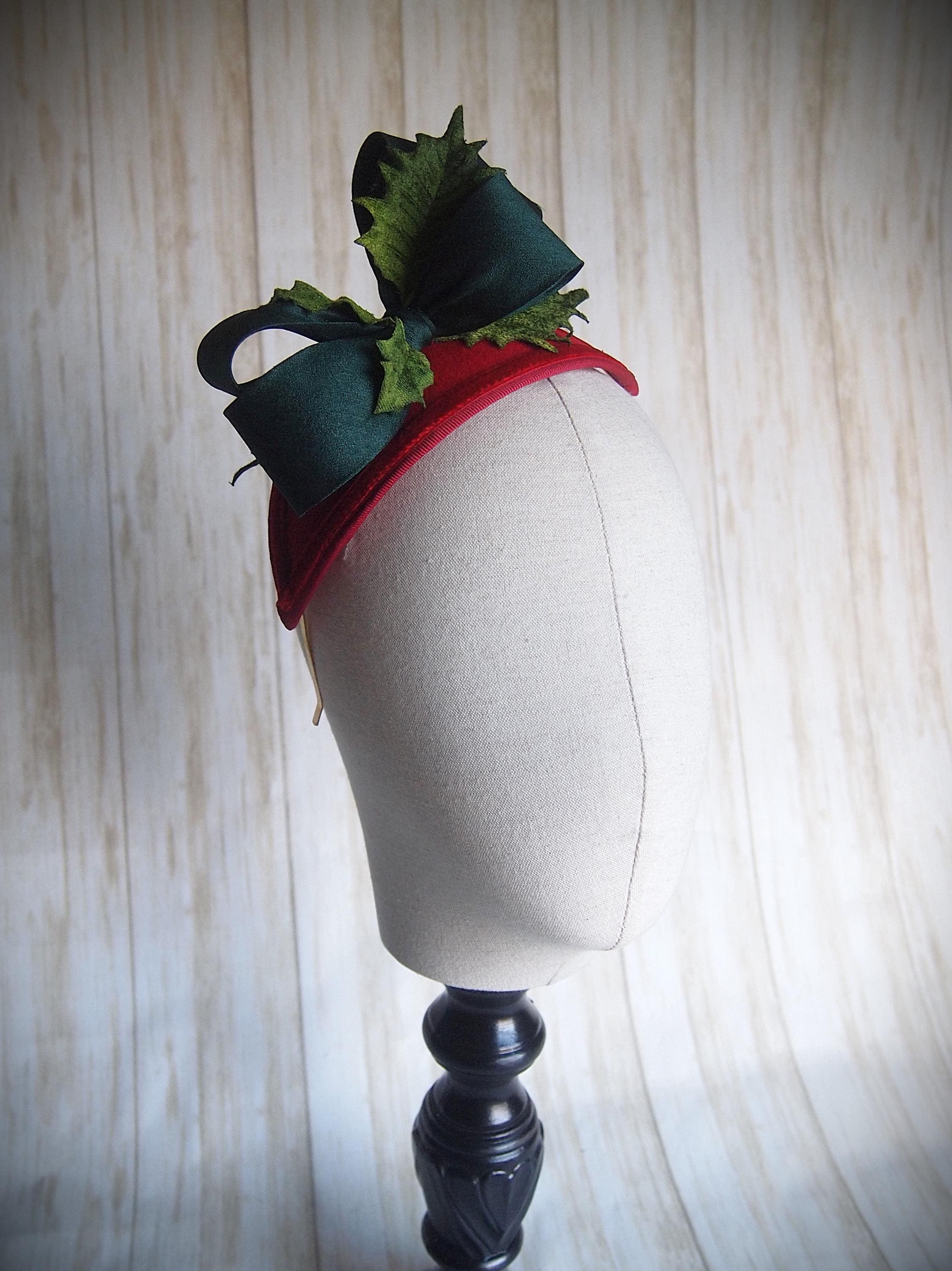 Made with a hand made red wool felt base with velvet edge and adorned with a faux silk bow, and velvet holly leaves.