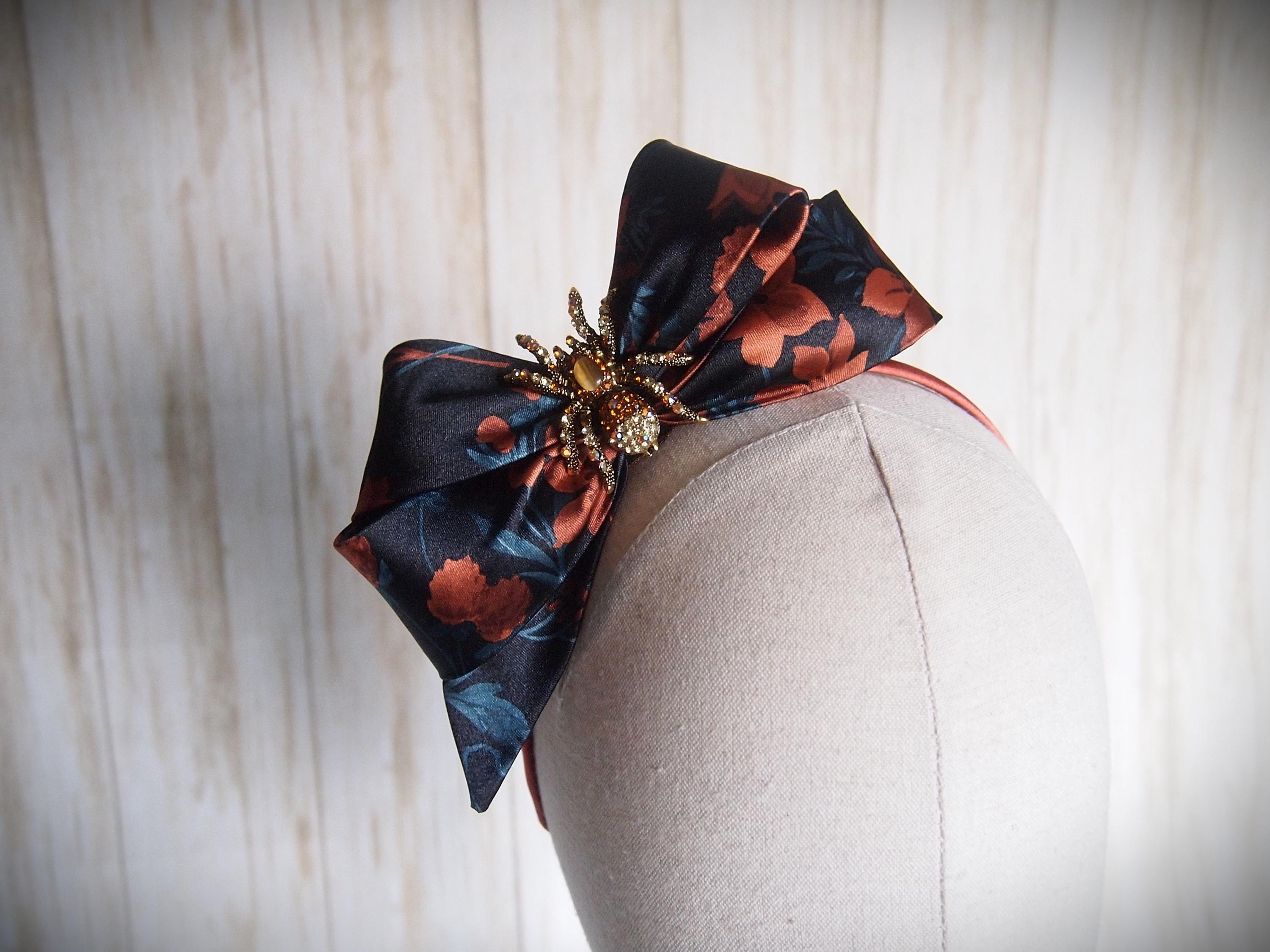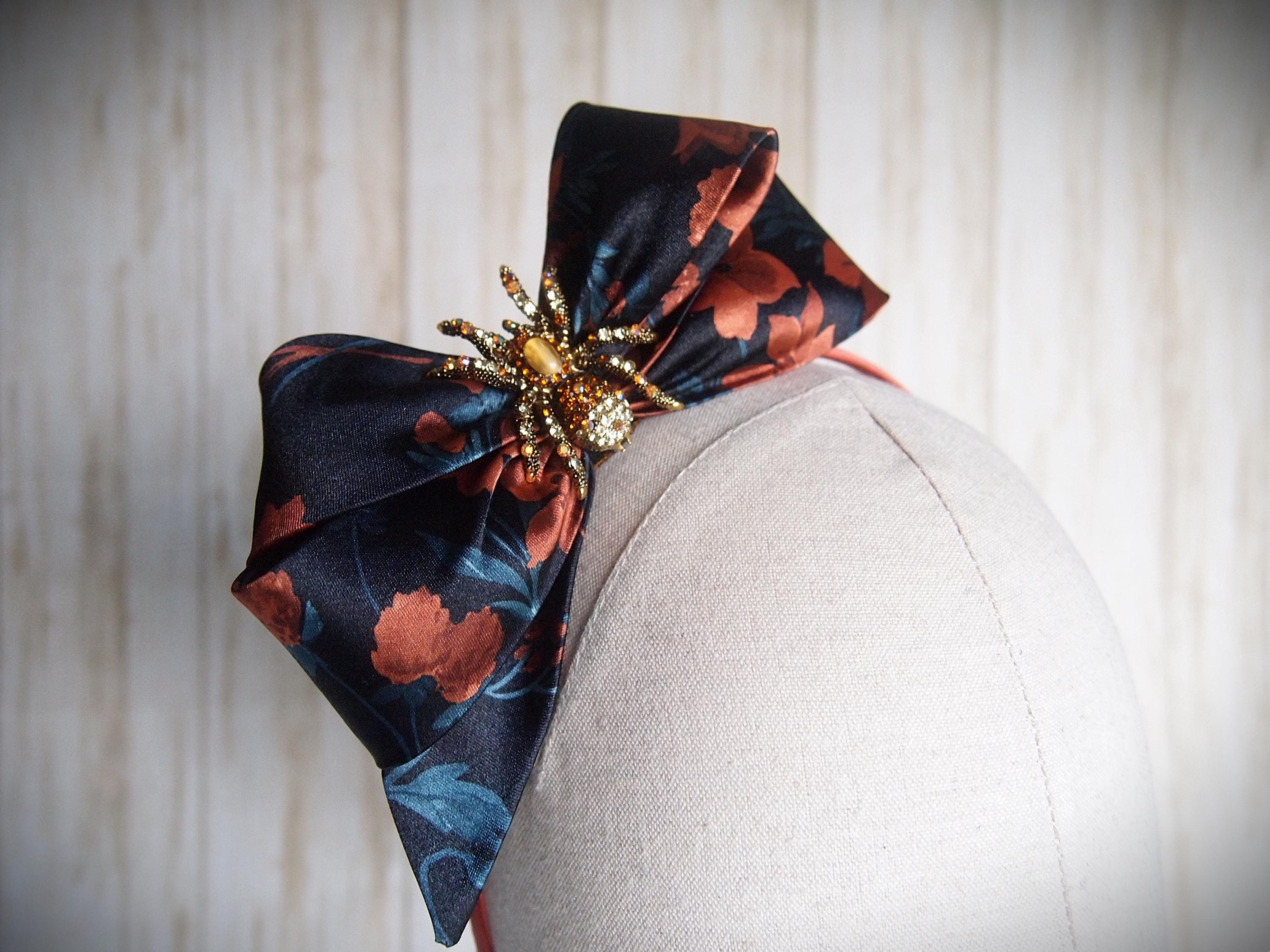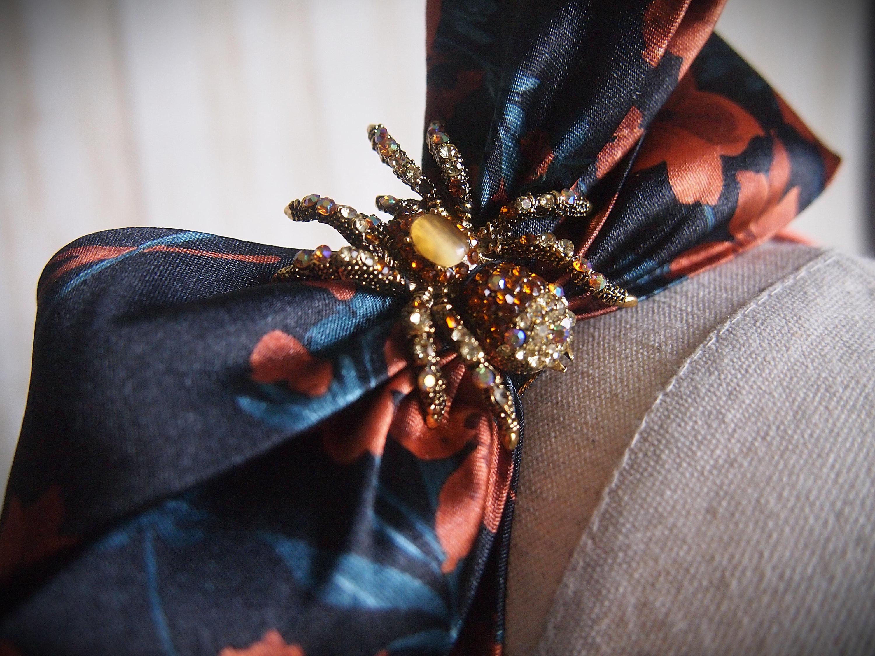 Made with a rust and teal floral satin and rhinestone spider detail!
