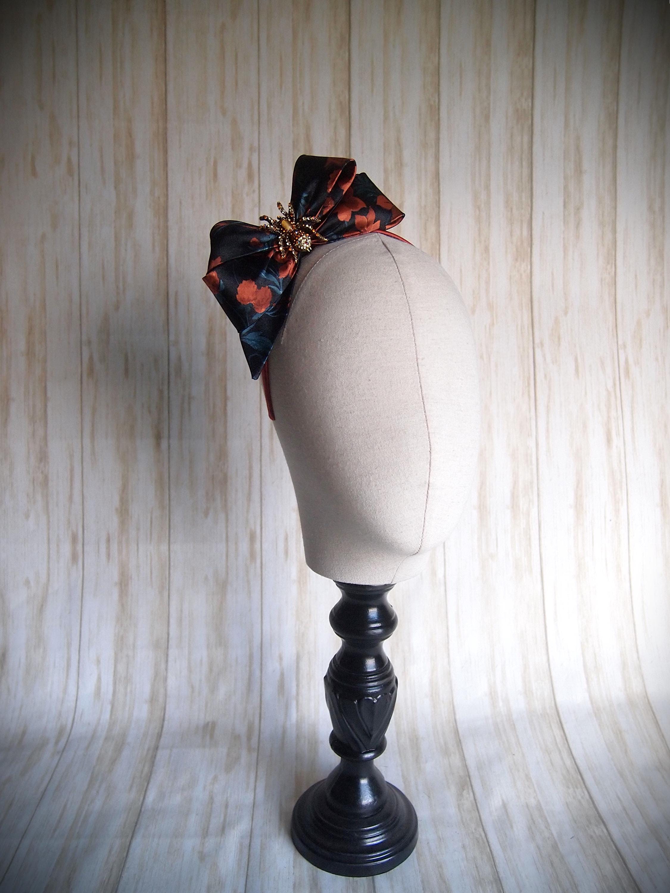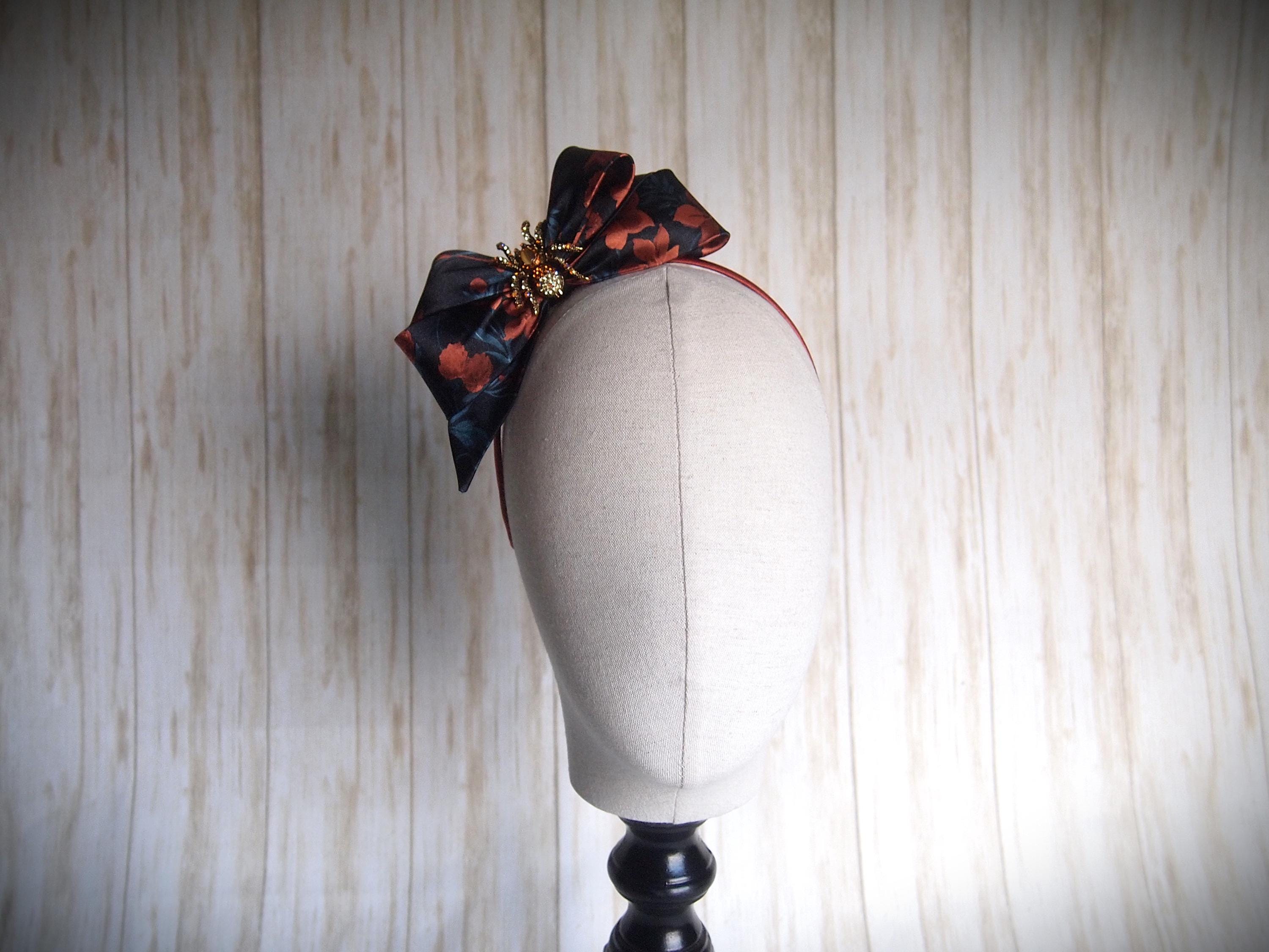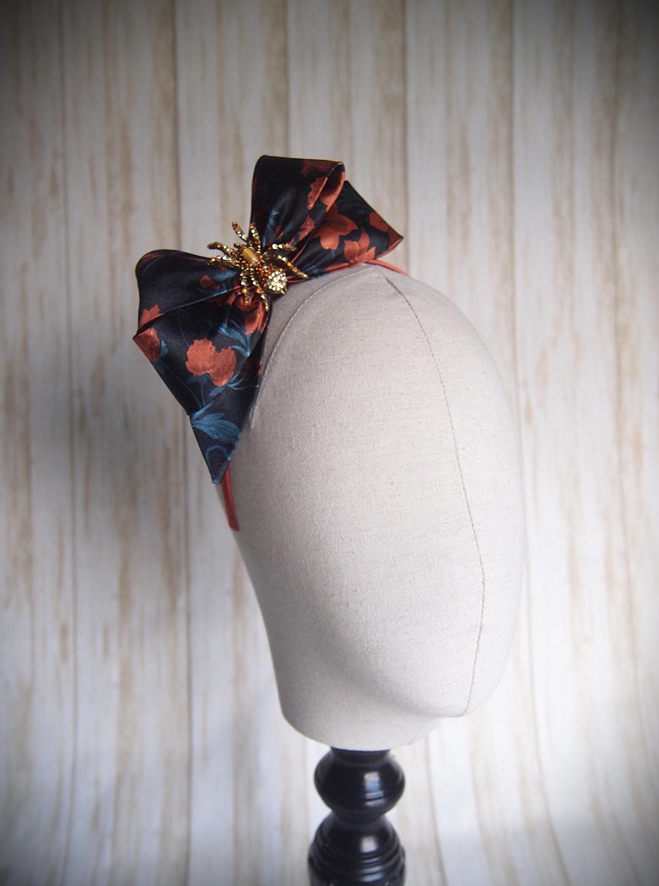 Made with a rust and teal floral satin and rhinestone spider detail!
