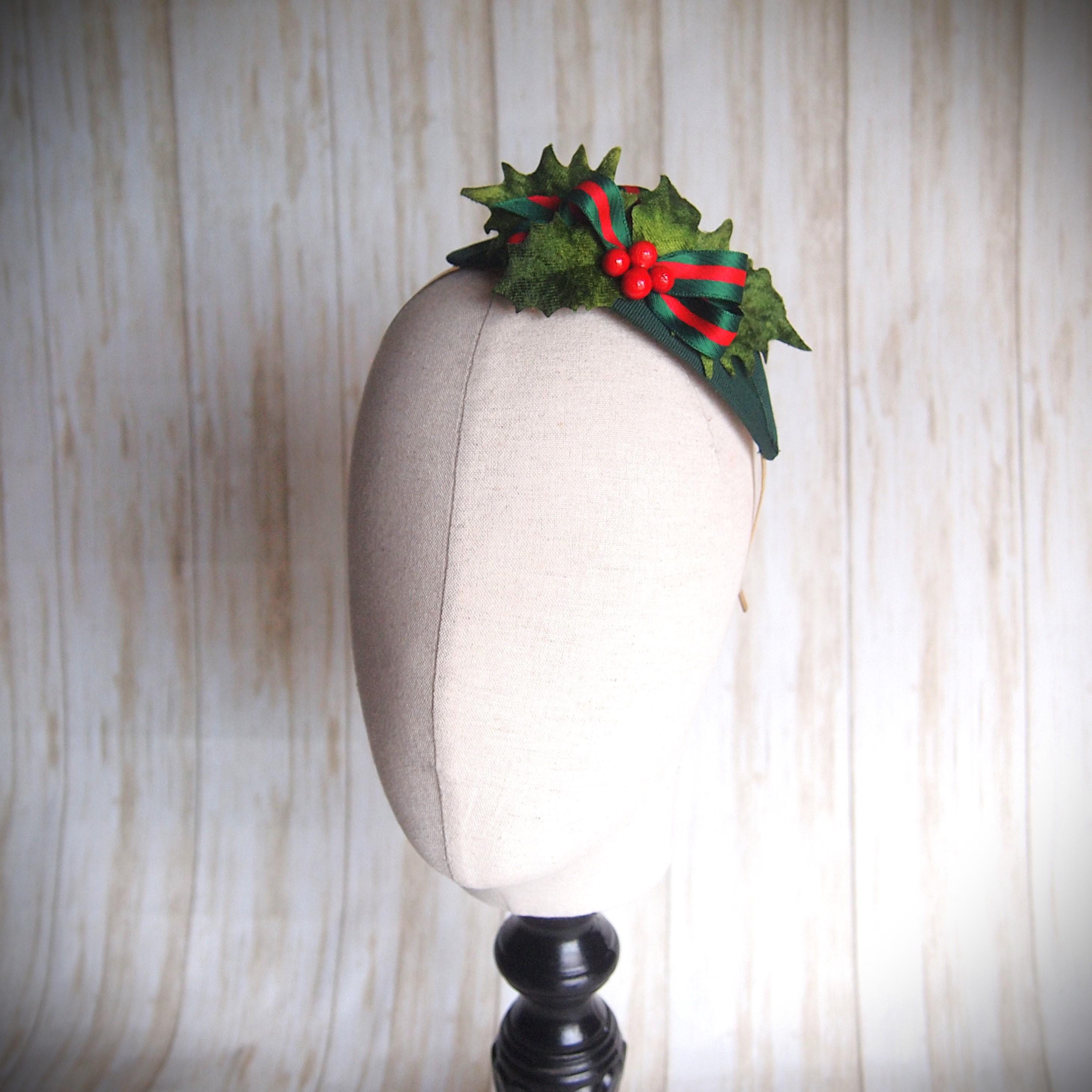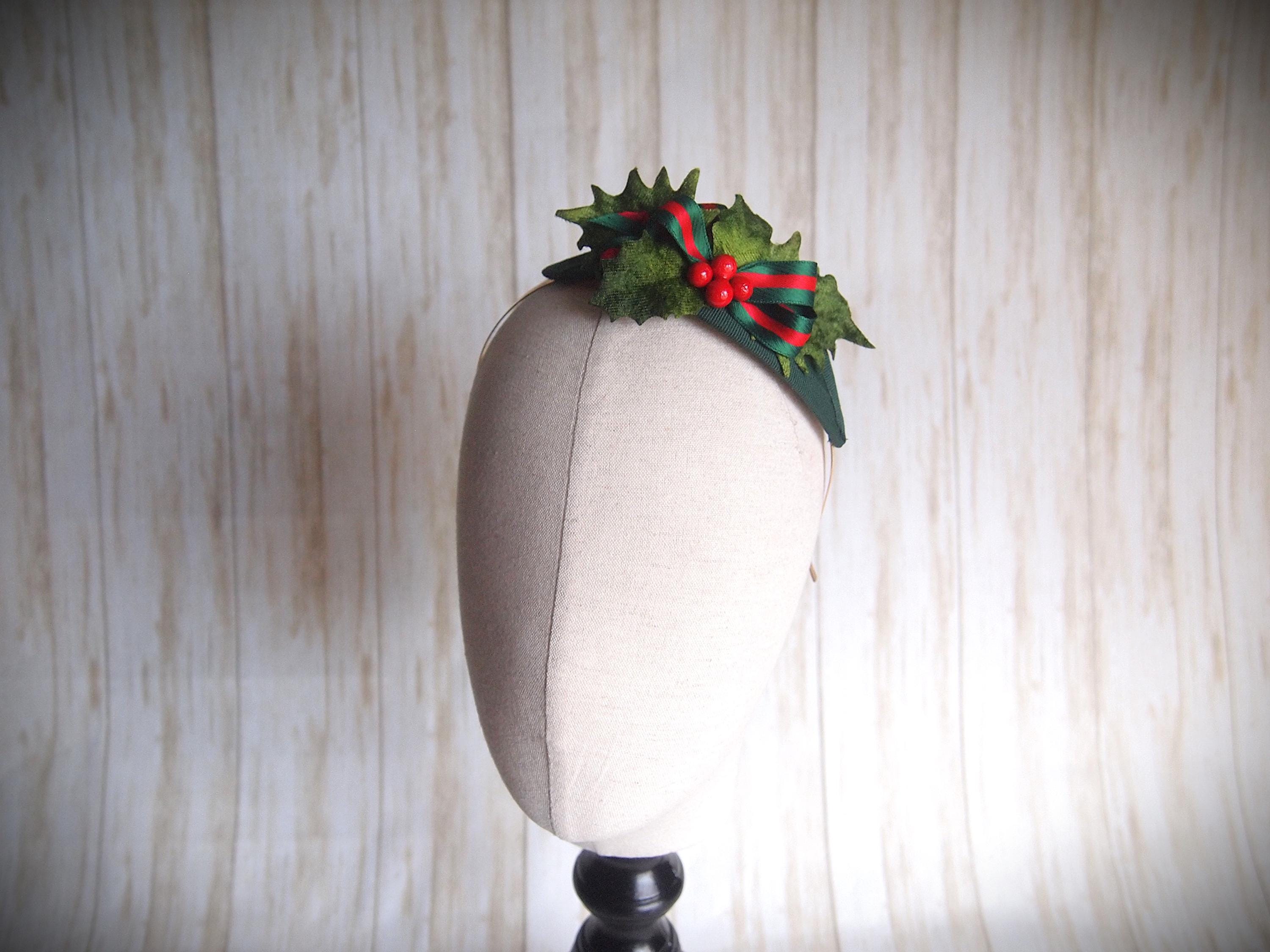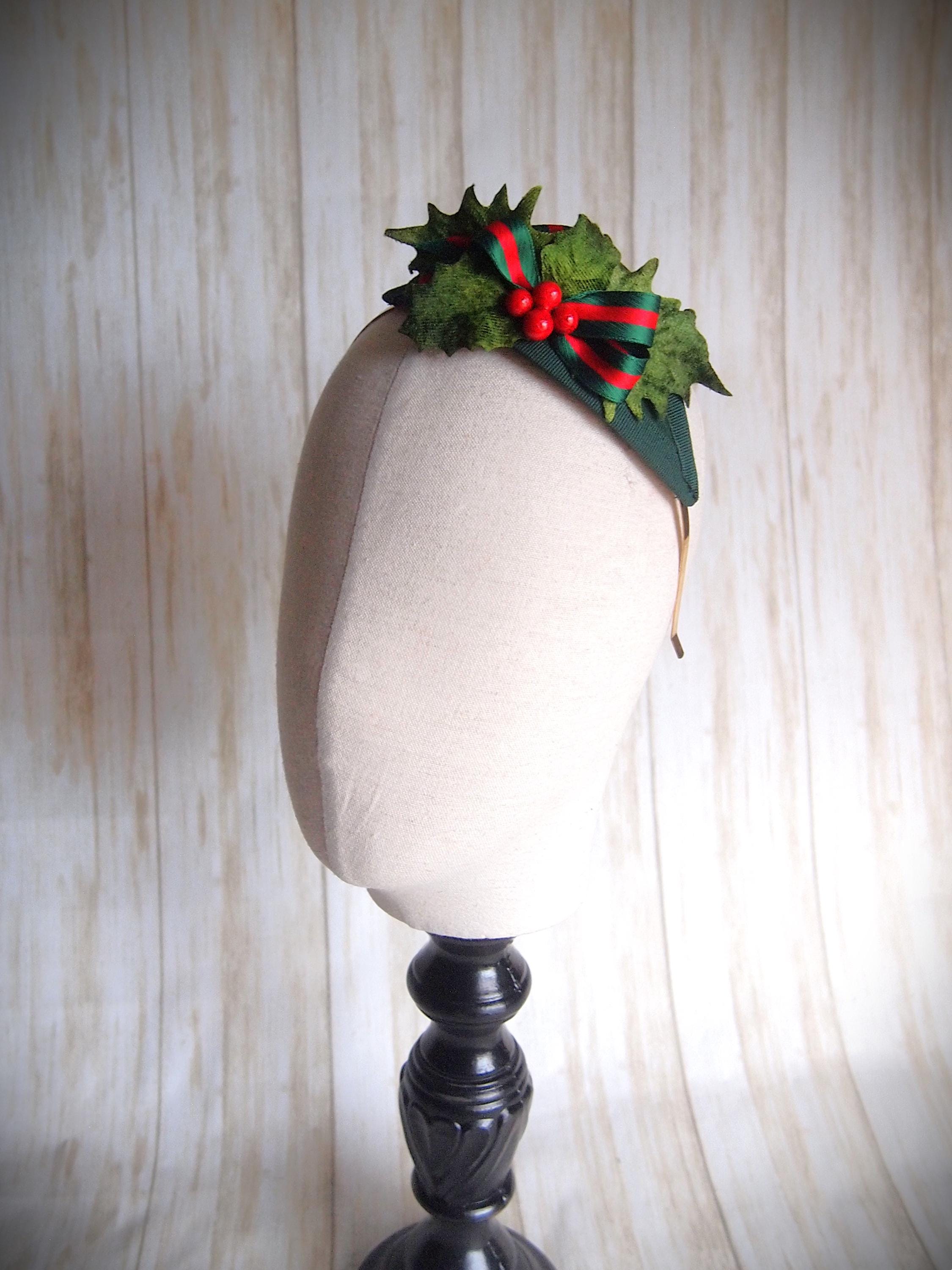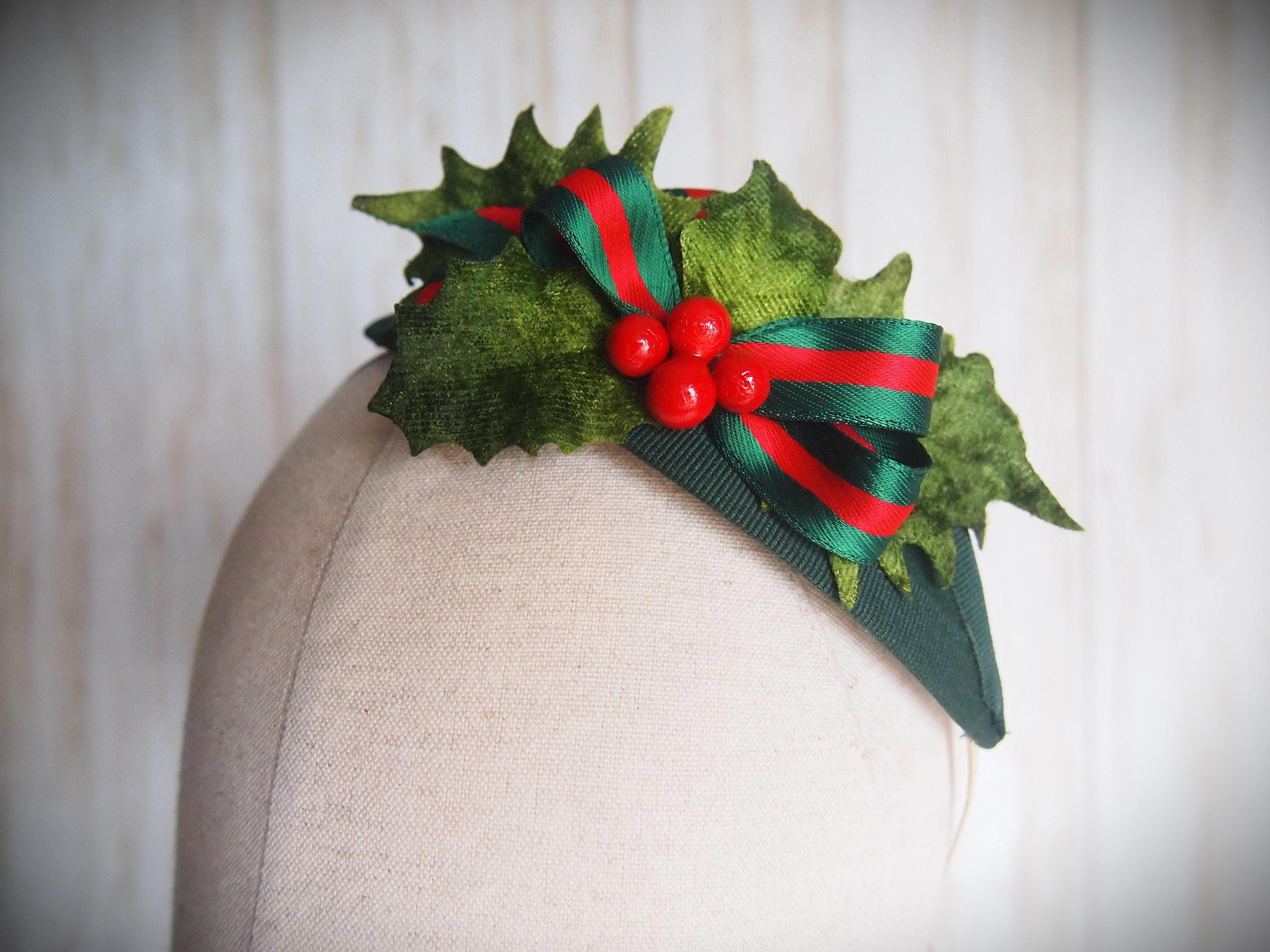 Made with a hand made red wool felt base and adorned with a satin bow, and velvet holly leaves.
