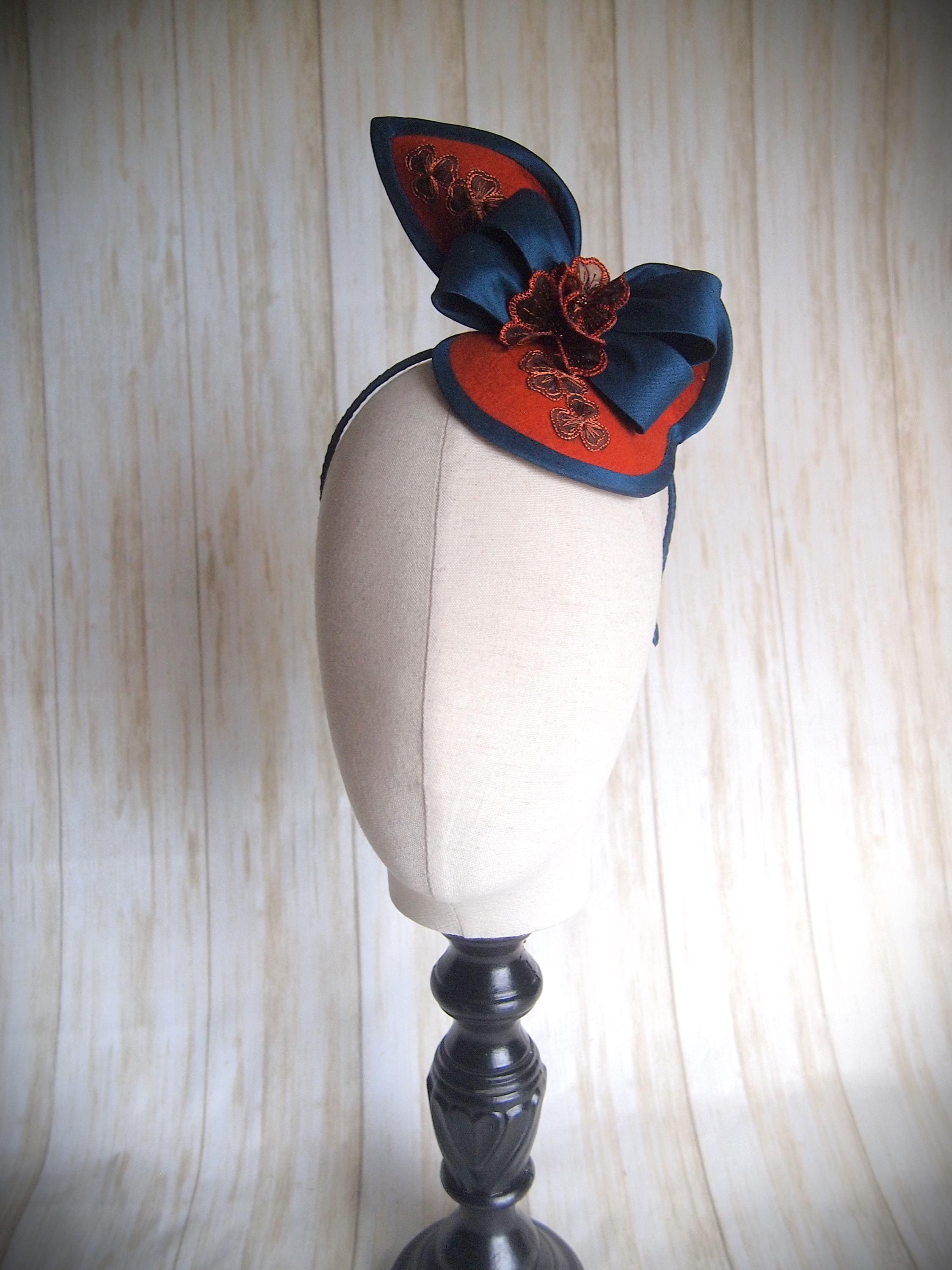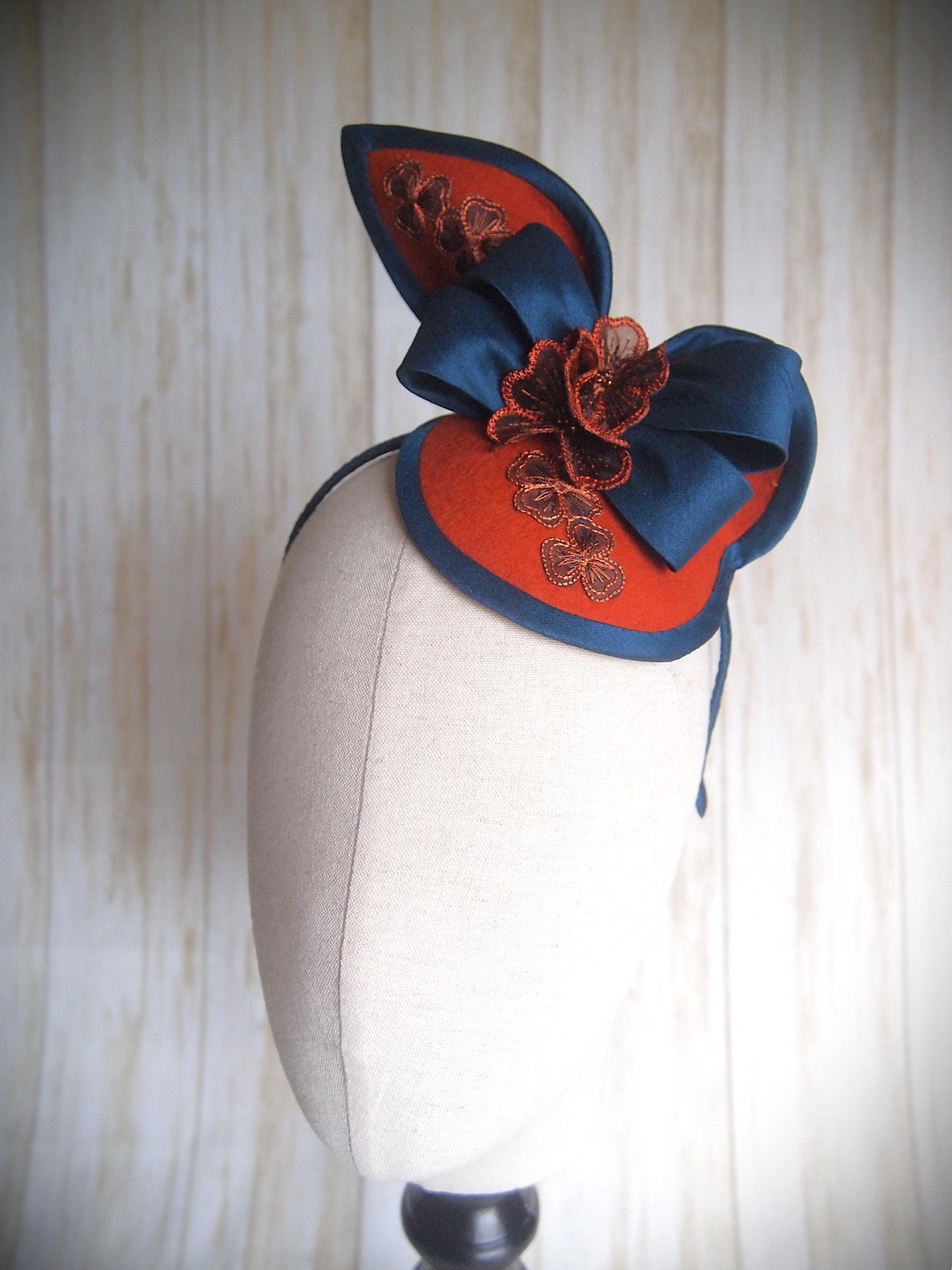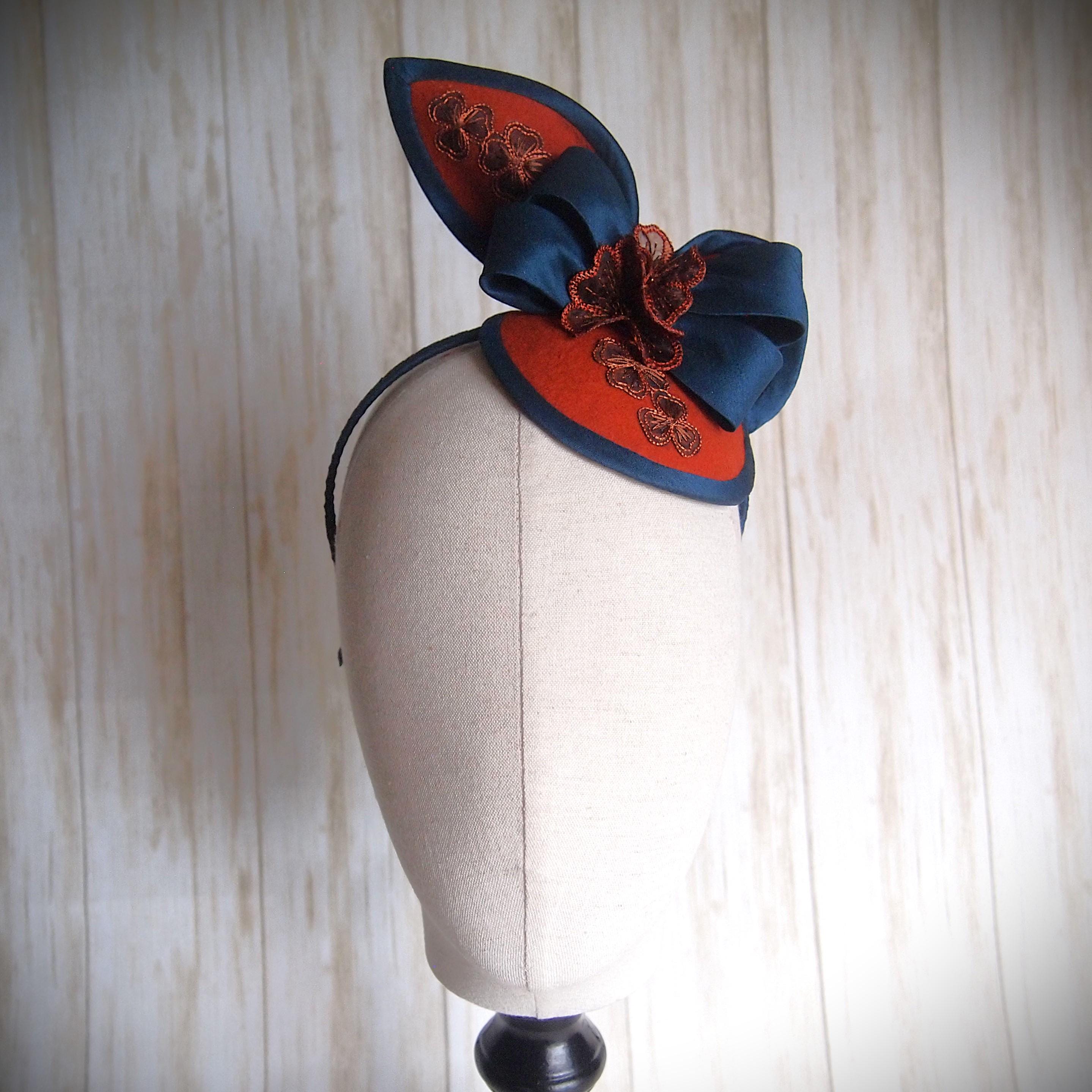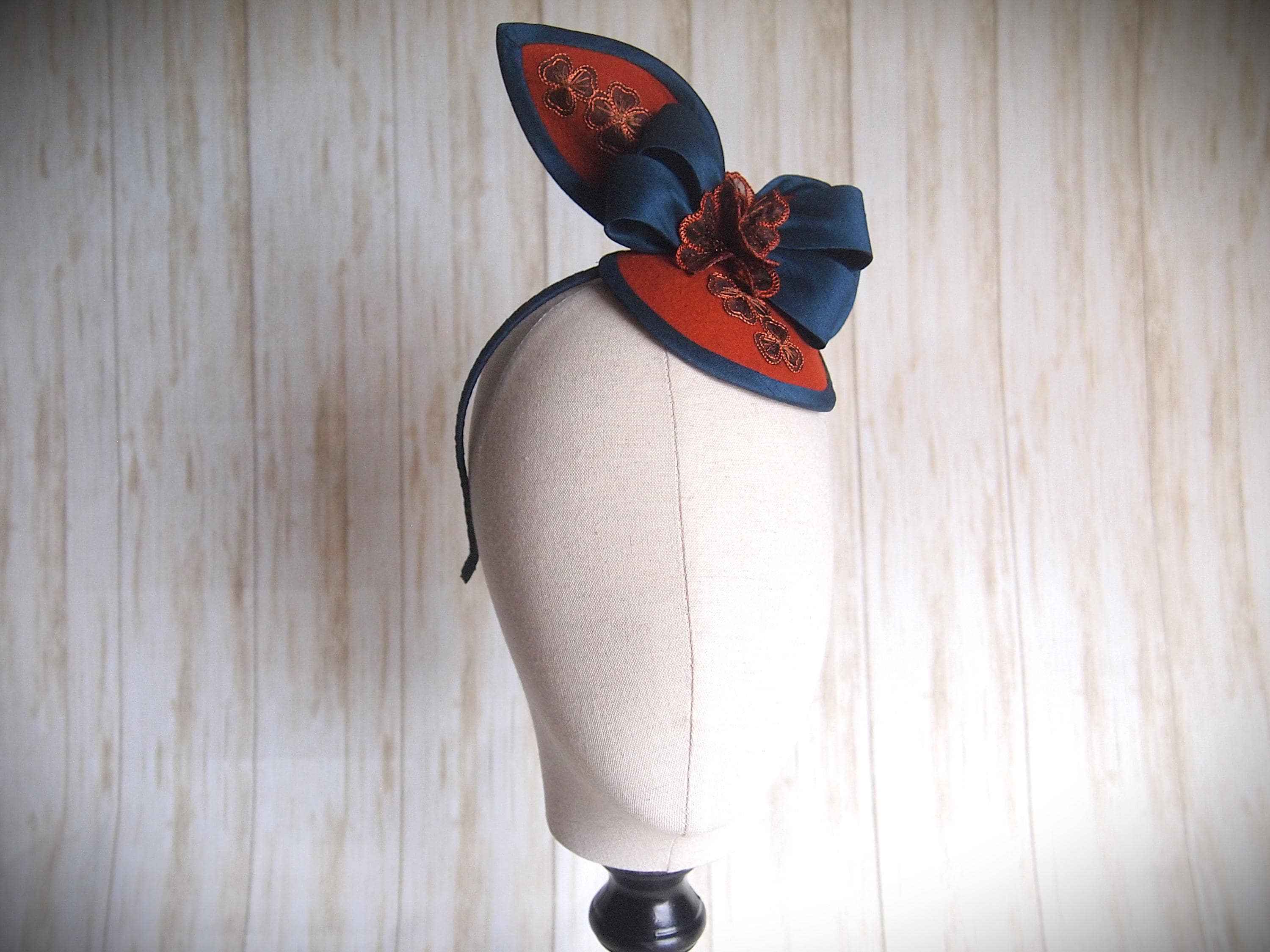 A hand made rust wool felt base with faux silk edge is adorned with a teal faux silk bow and sheer rust embroidered flowers!