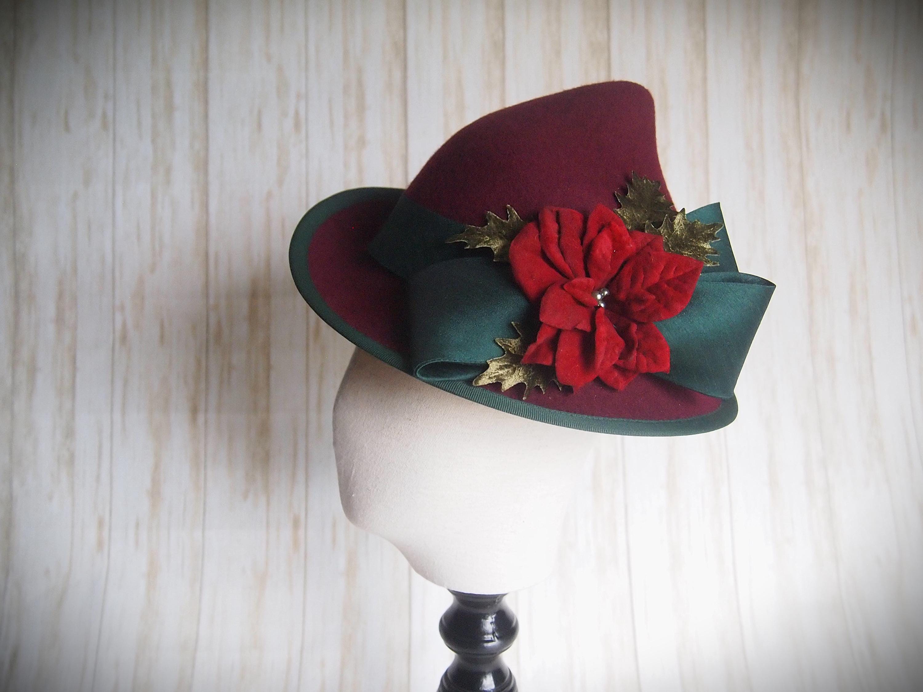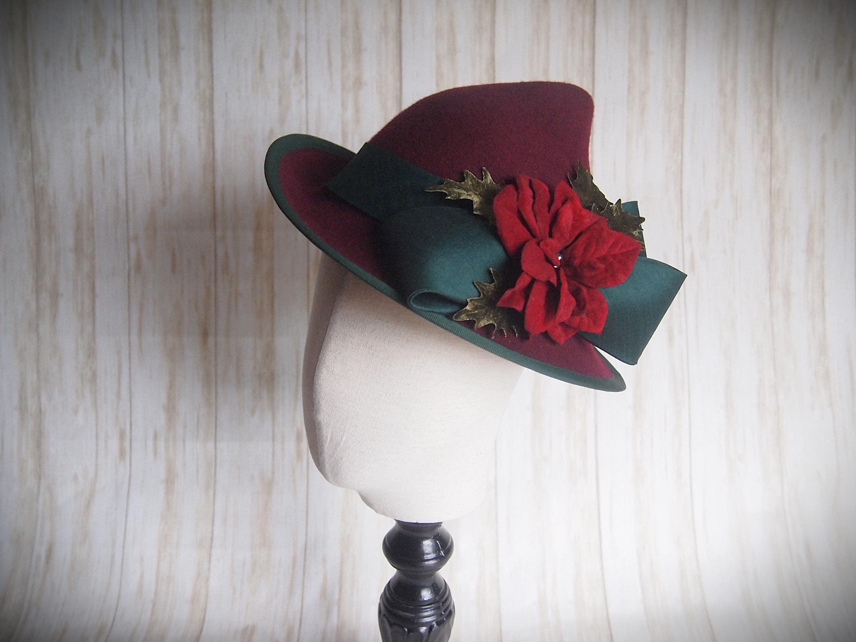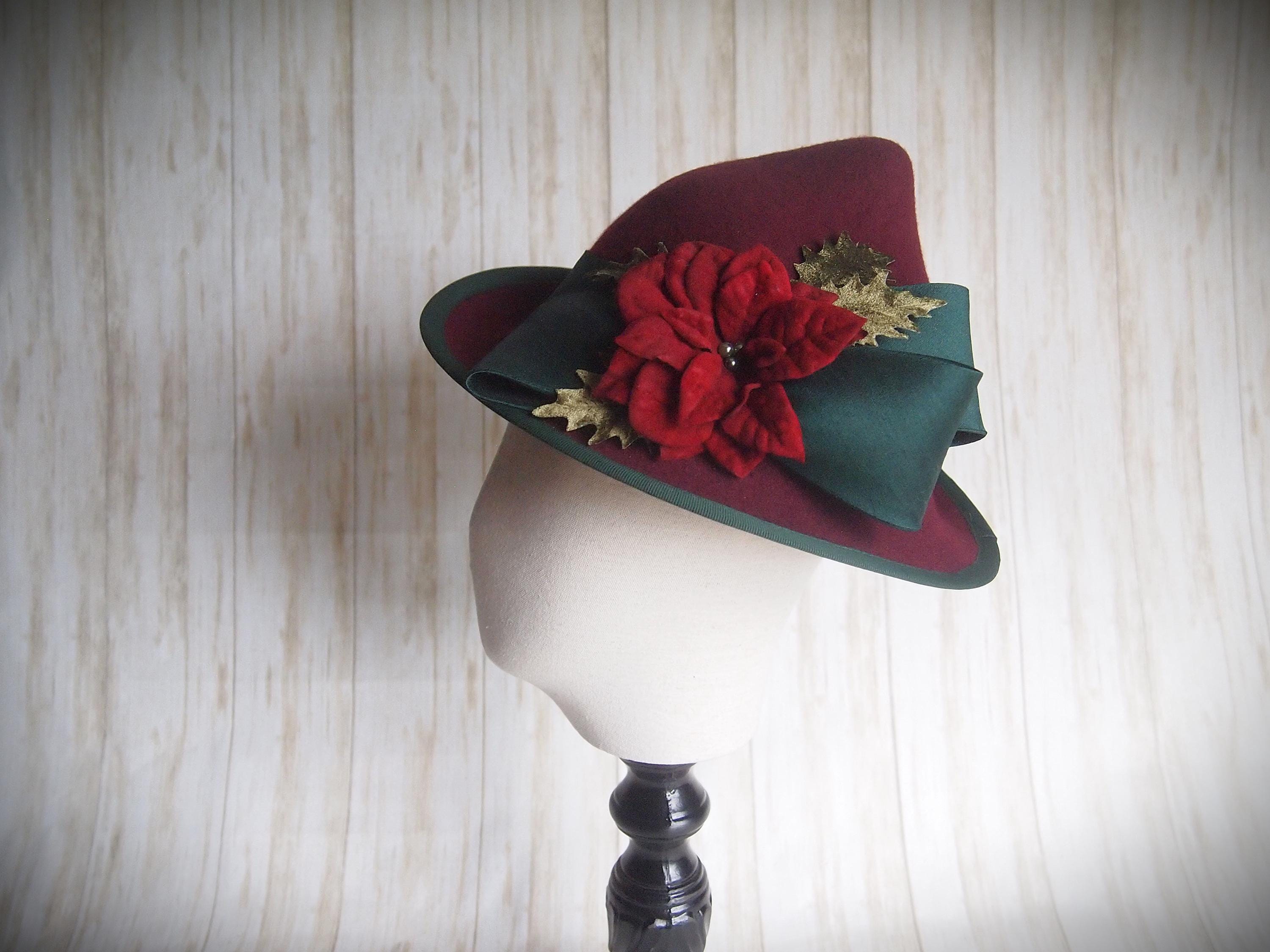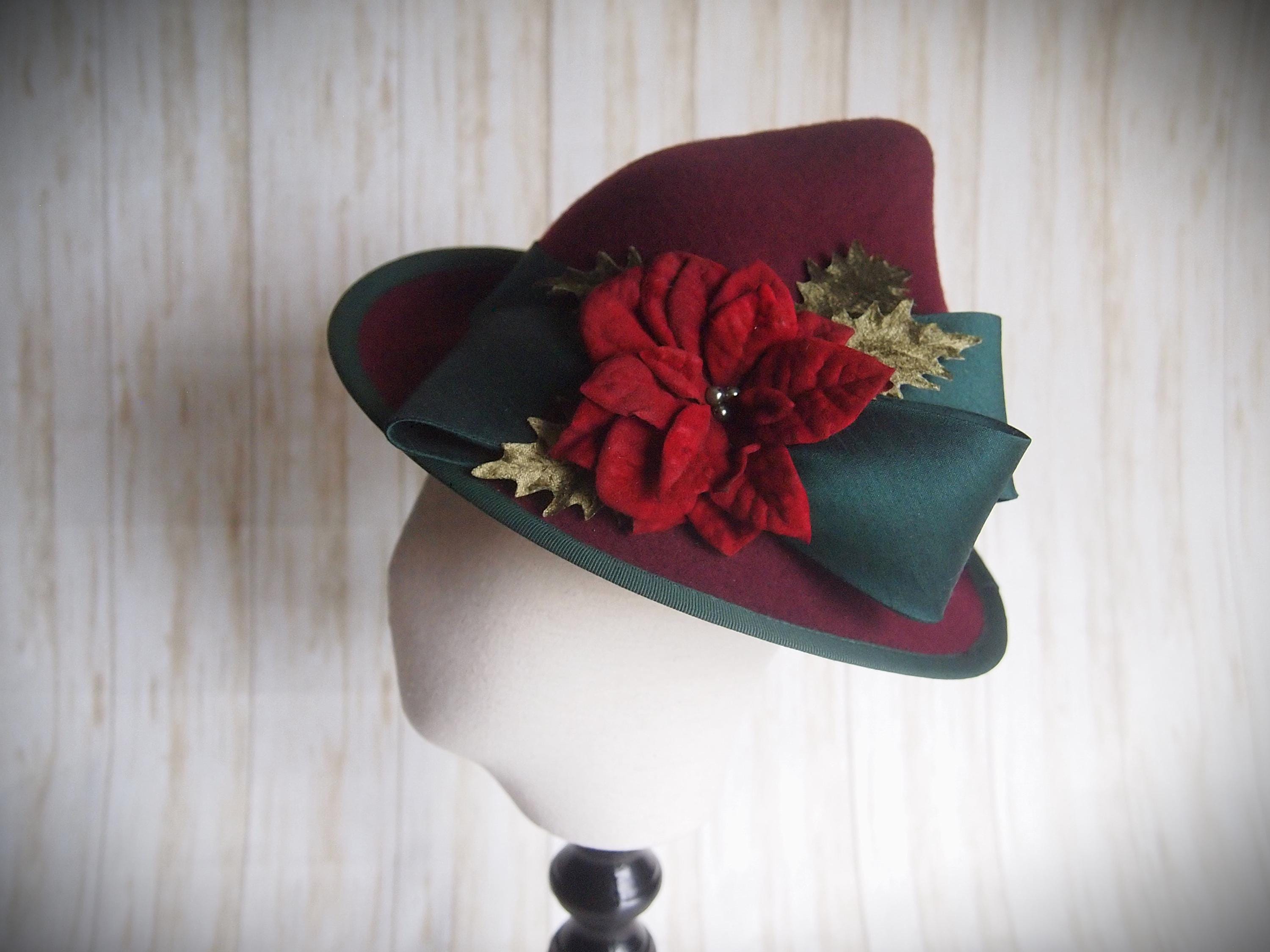 Hand blocked Burgundy cloche hat with green grosgrain edge, and velvety poinsettia with a hand beaded center!