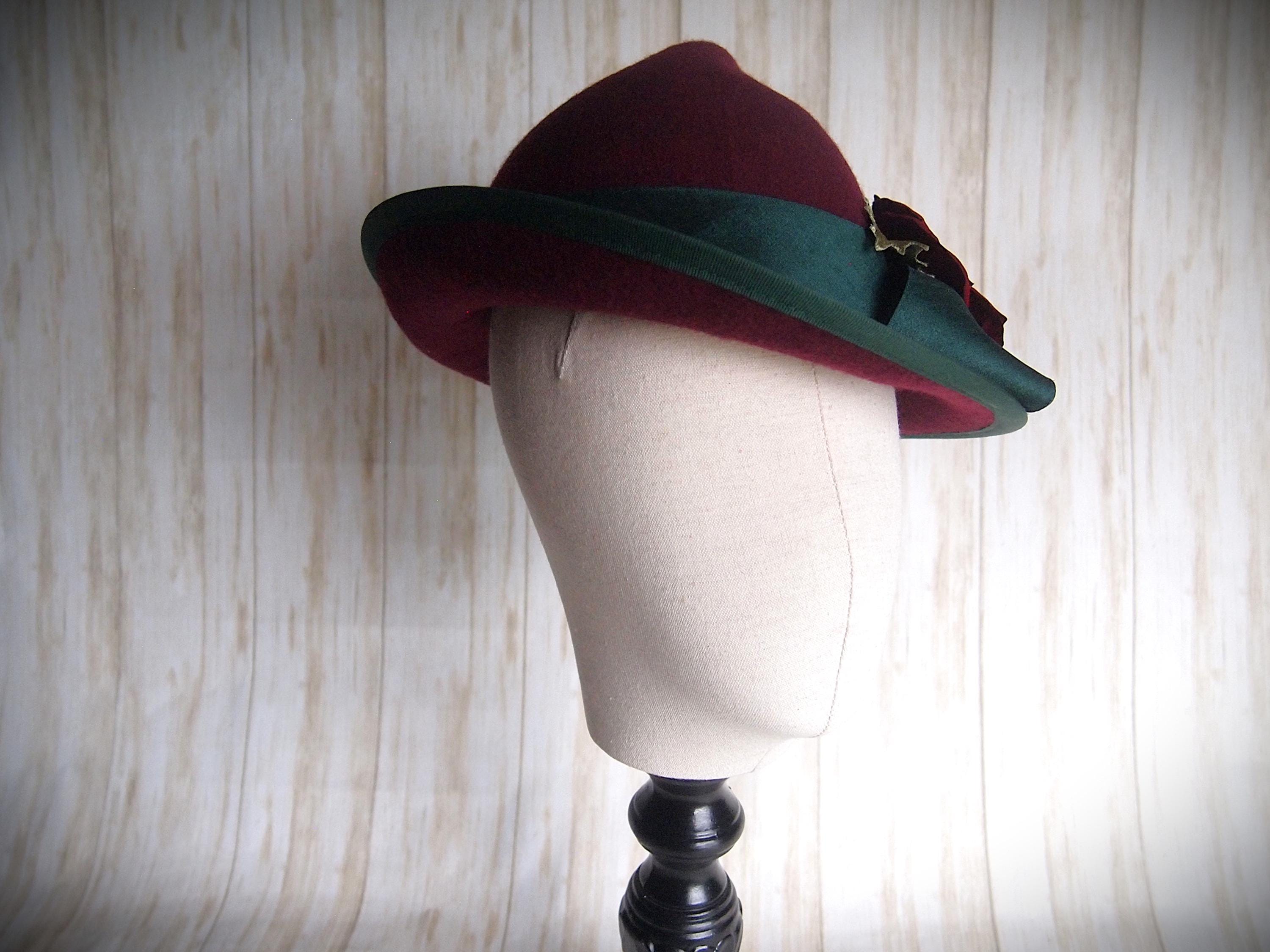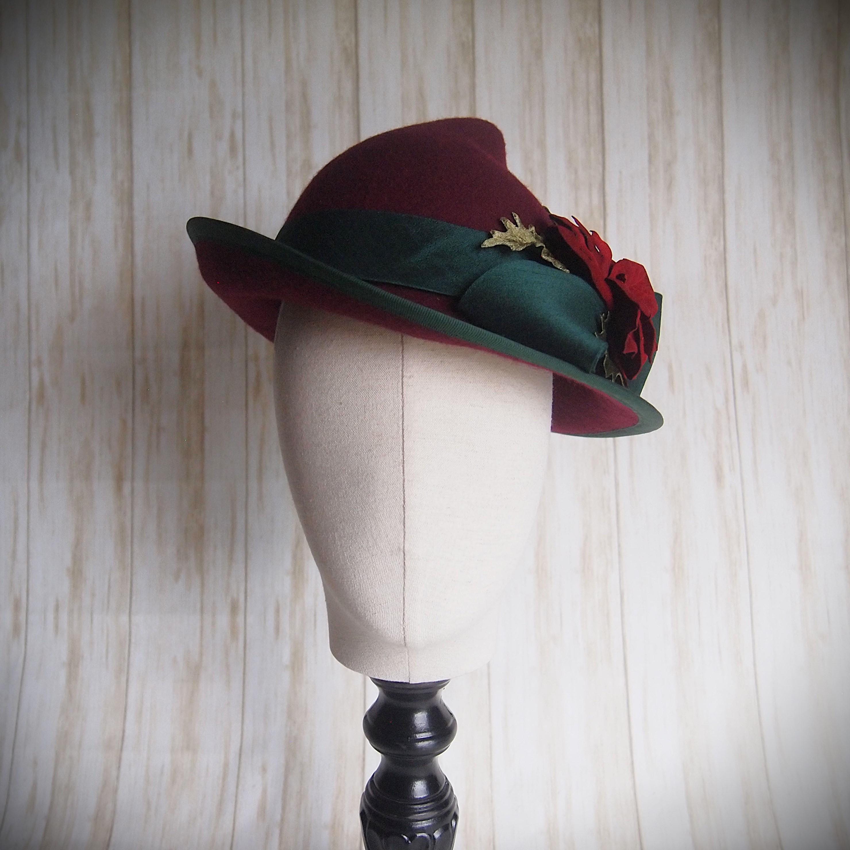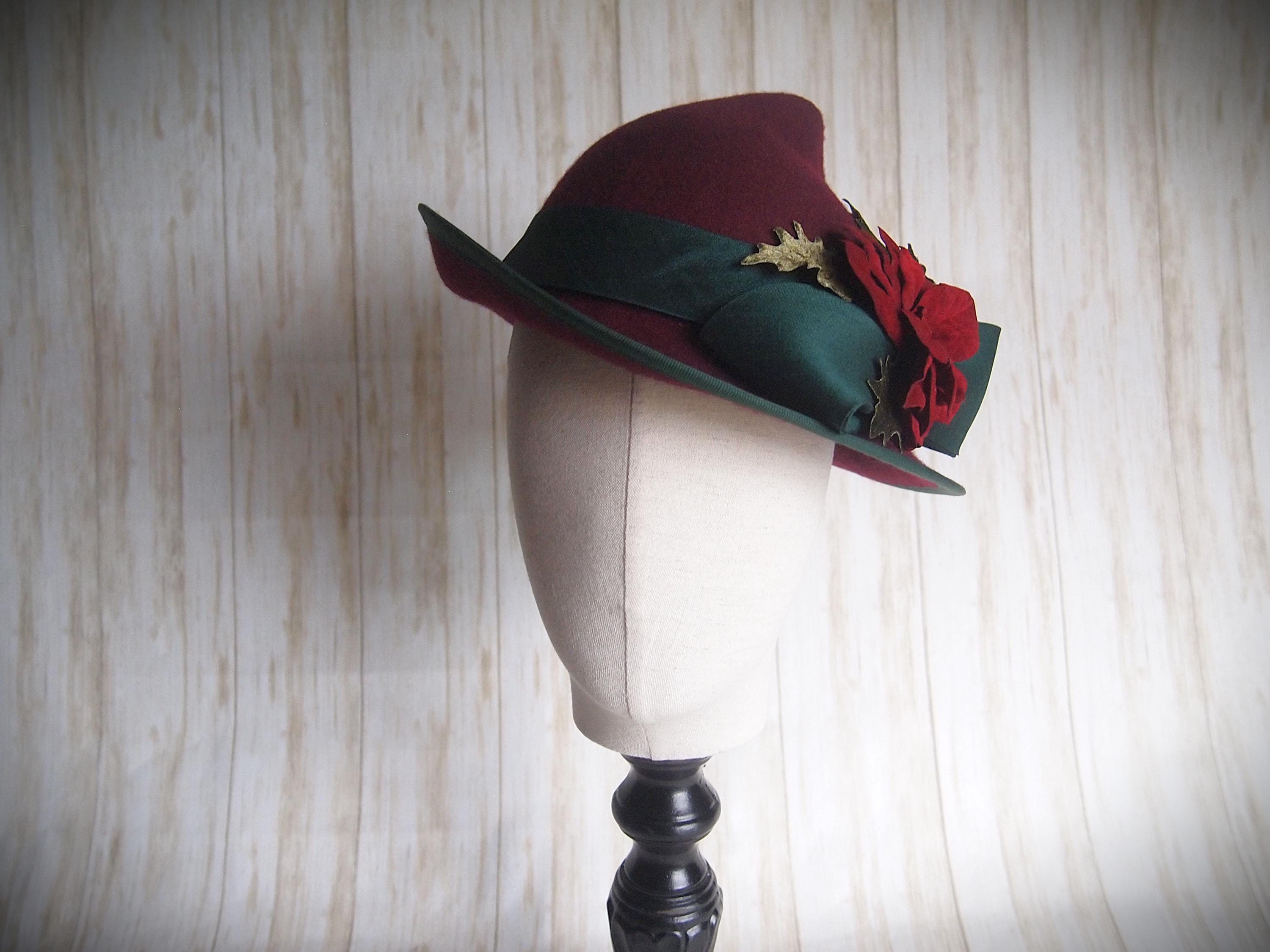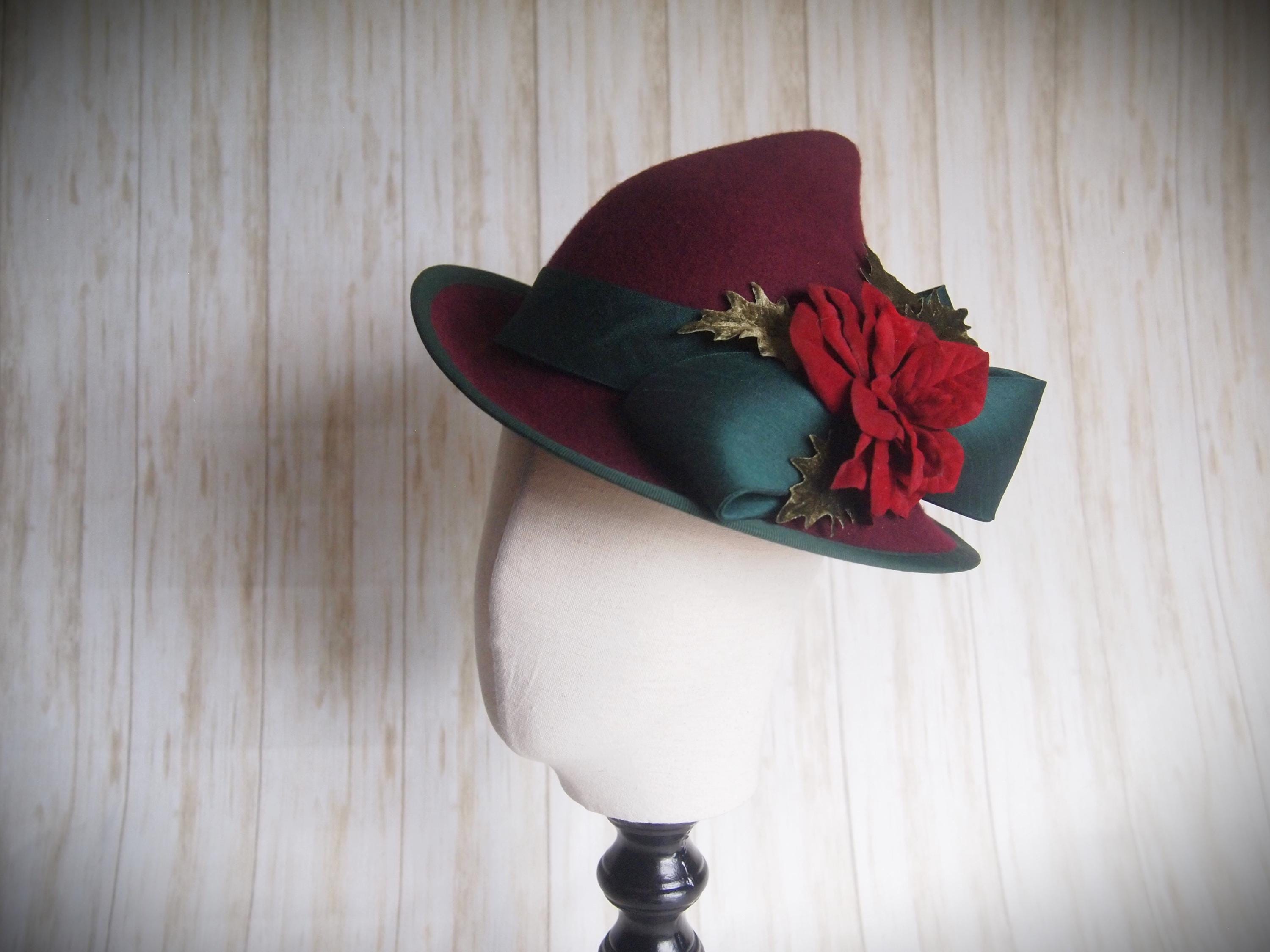 Hand blocked Burgundy cloche hat with green grosgrain edge, and velvety poinsettia with a hand beaded center!