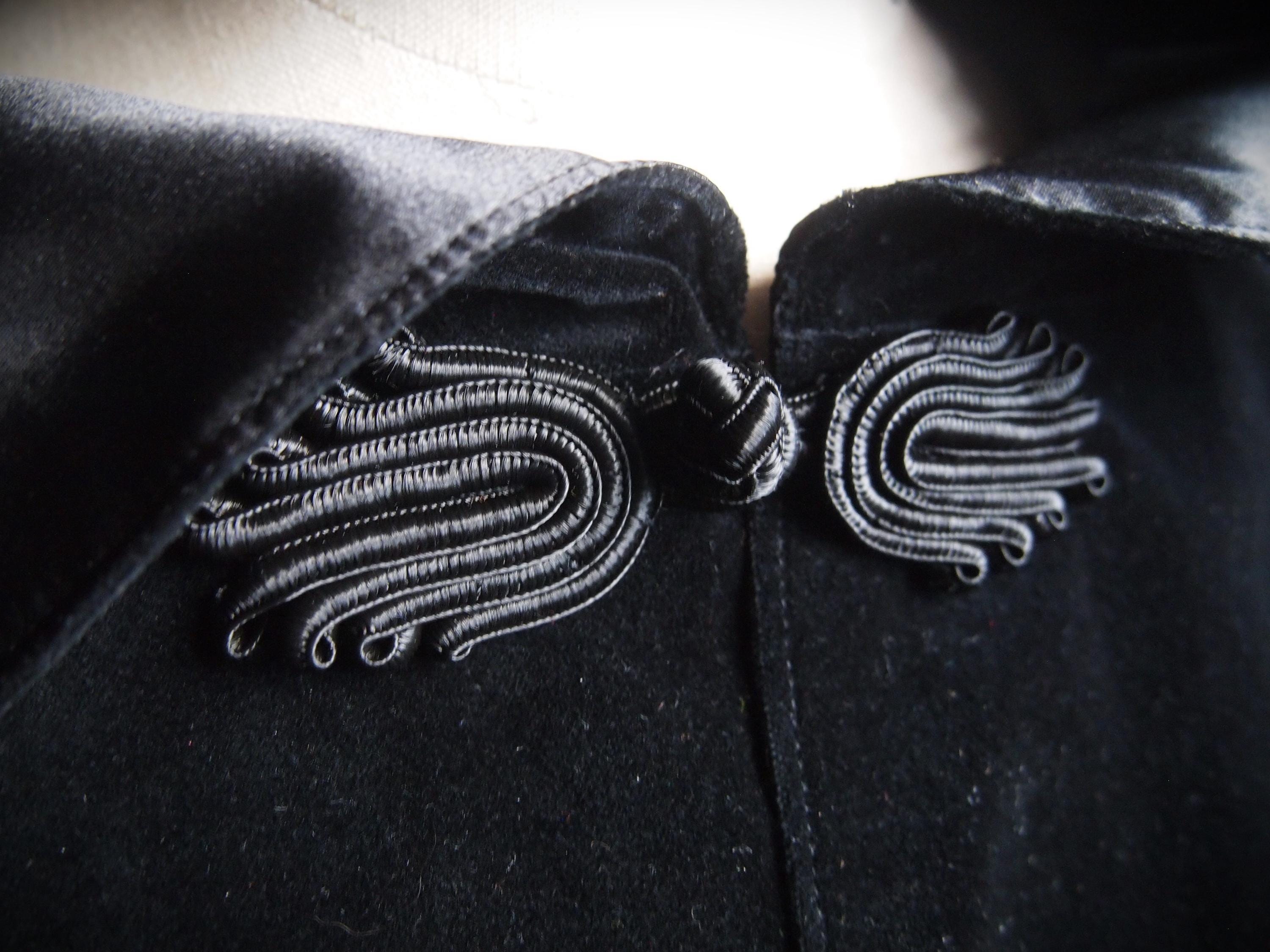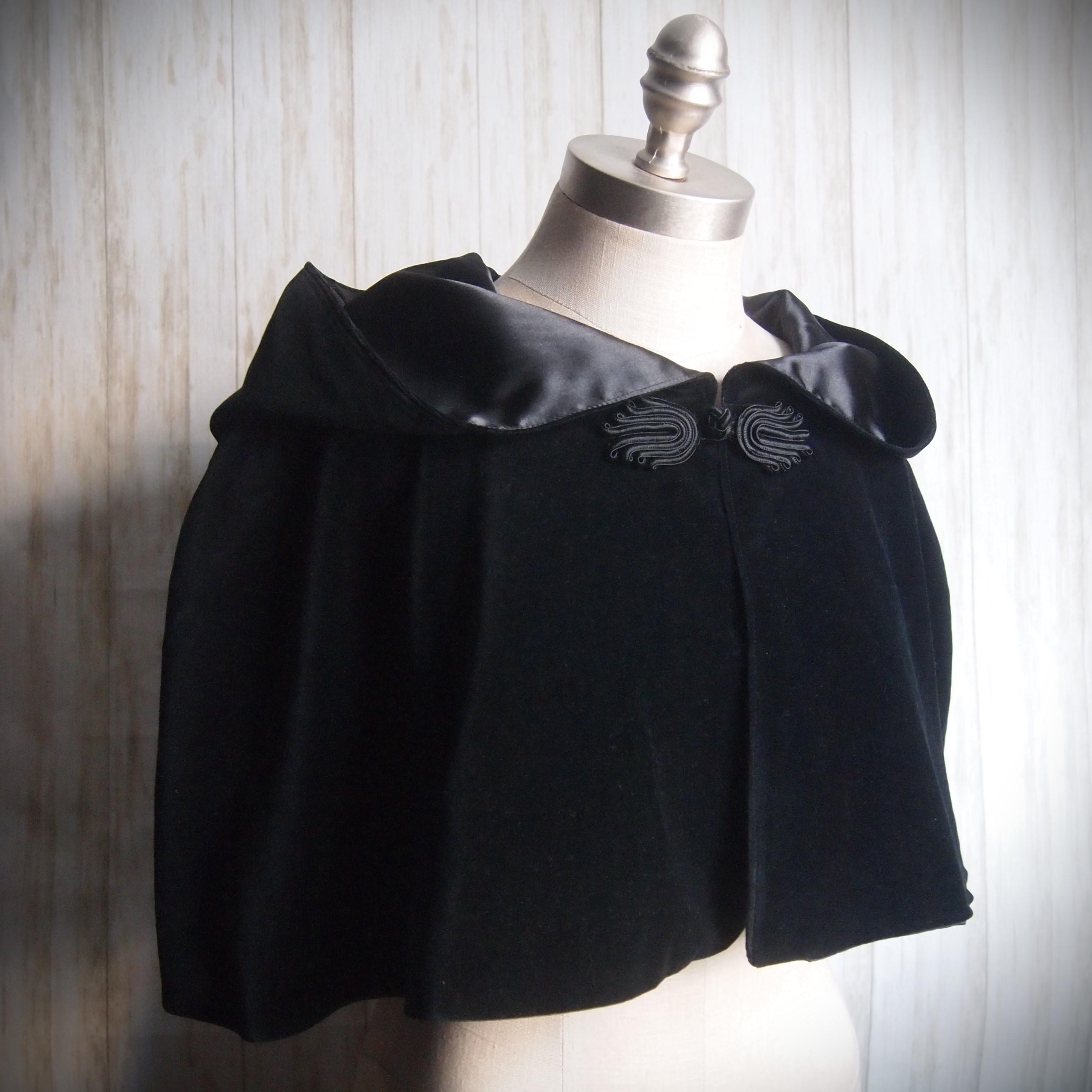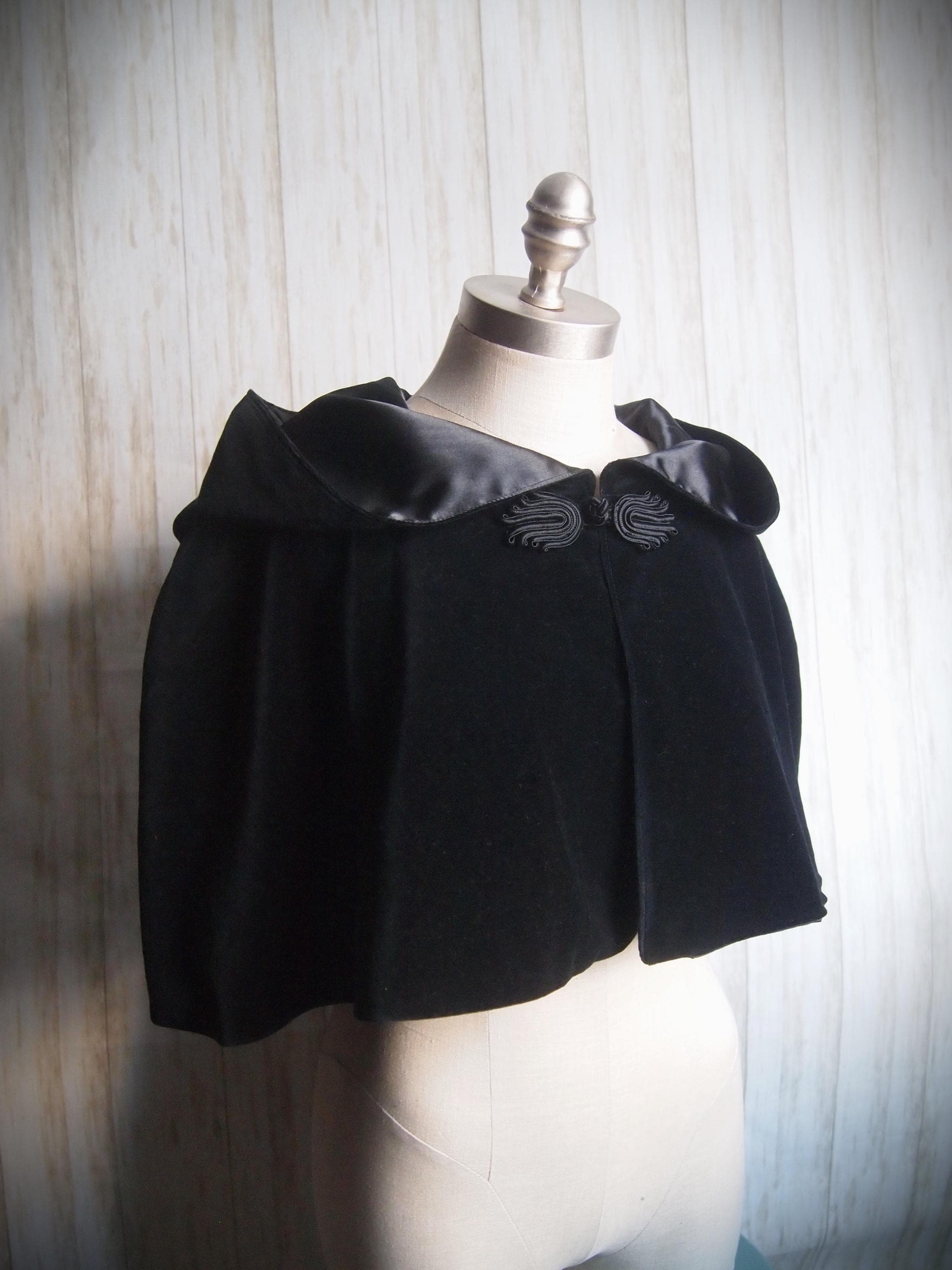 Handmade black velveteen cape. Soft cotton velveteen outer and satin lining with frog closure. Comes to about the elbow and is sloped at the back. Would look great with leggings and boots!!!!