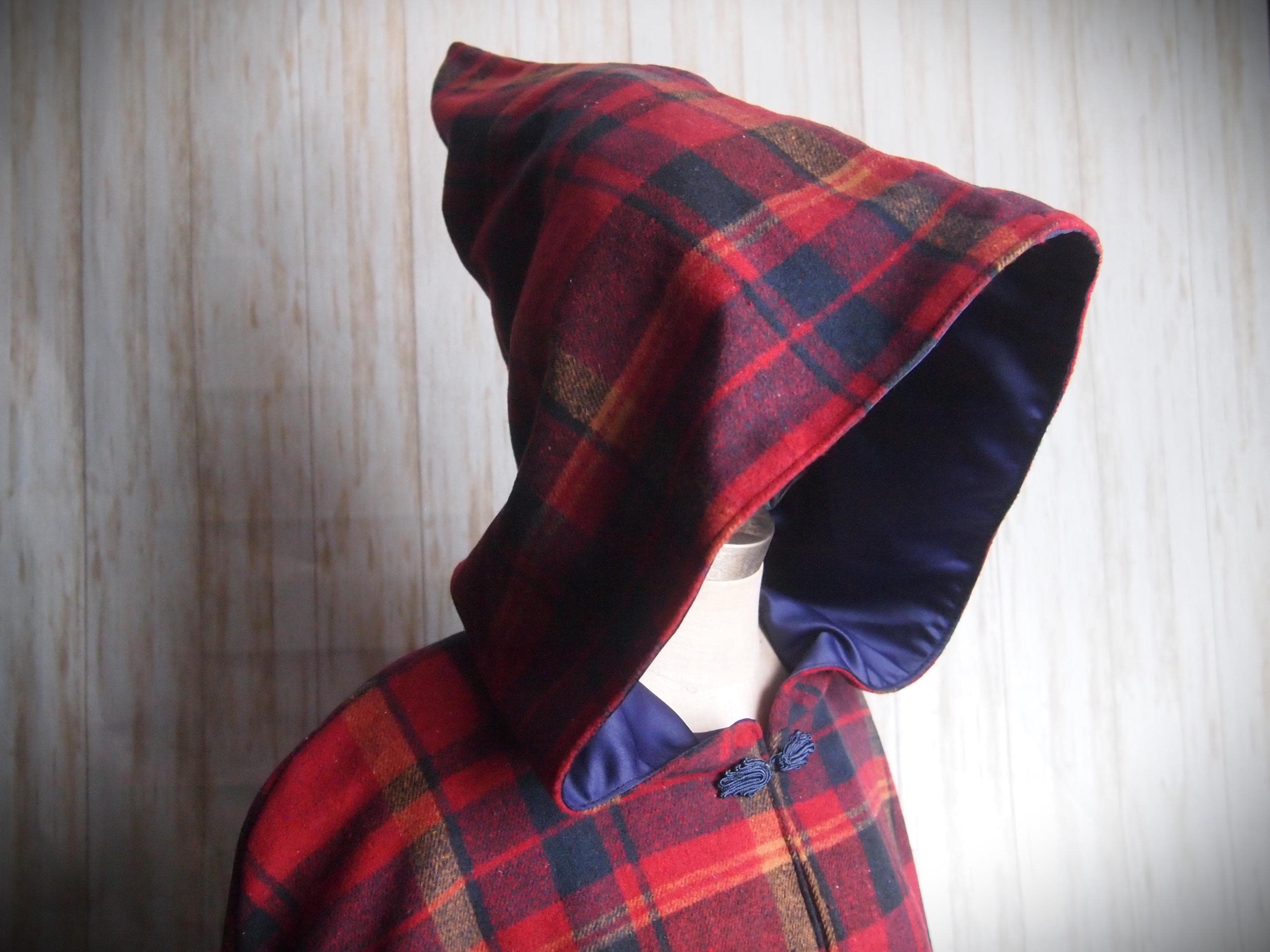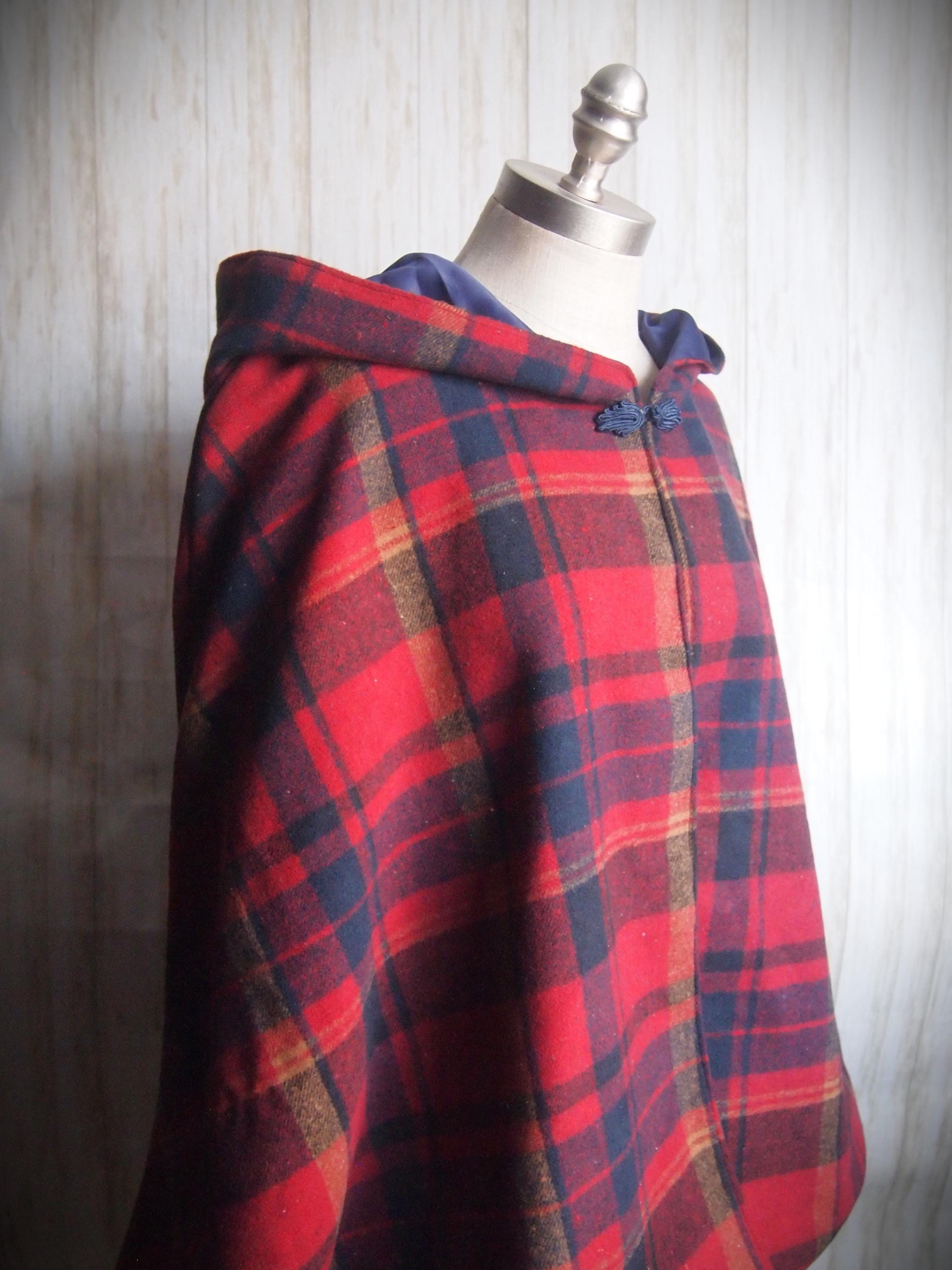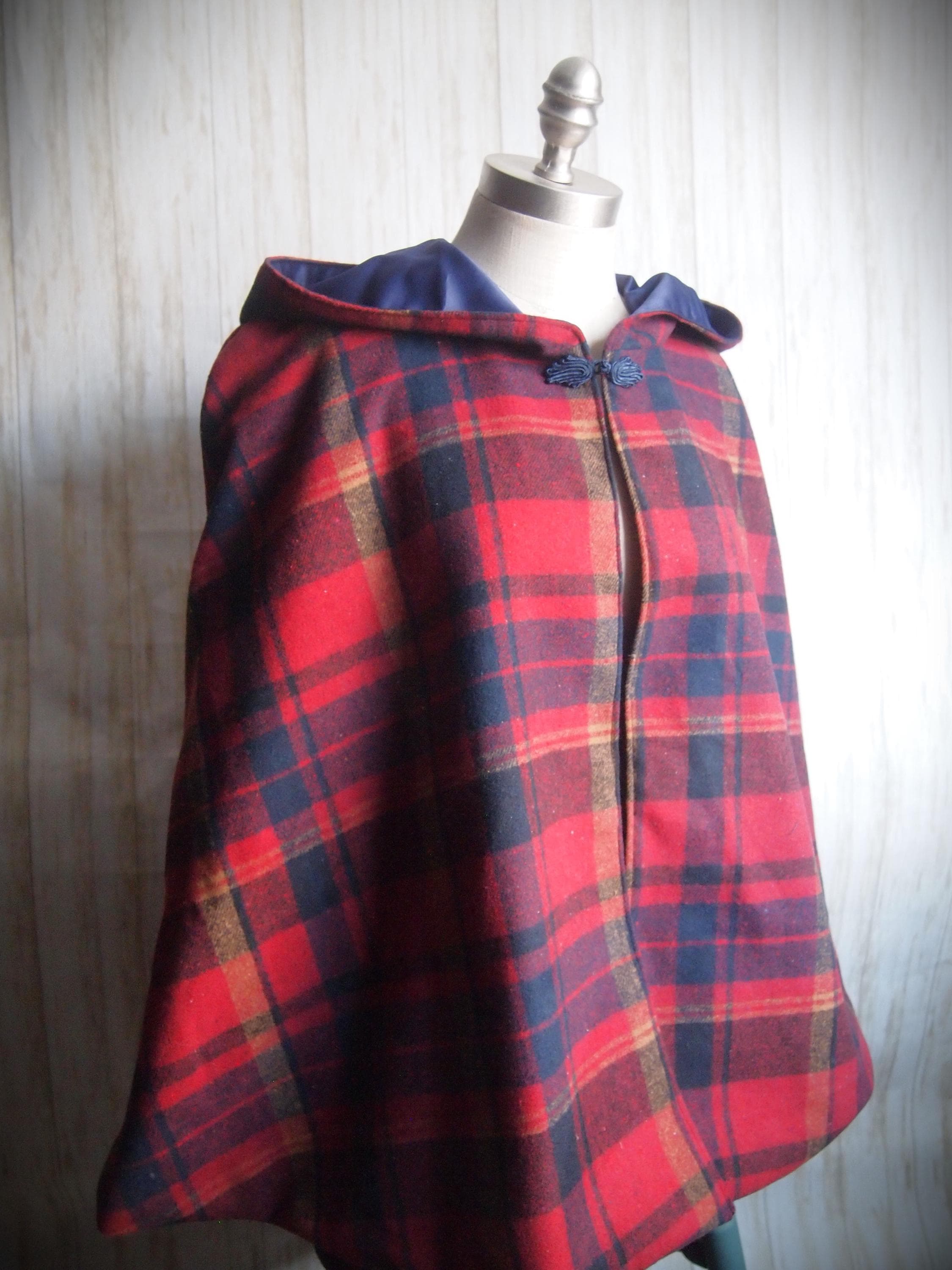 Handmade hooded plaid cape with blue frog closure. Thick brushed cotton outer shell and navy blue poly satin lining. Comes to just below the wrists, and is sloped at the back. Would look great with leggings and boots!!!!