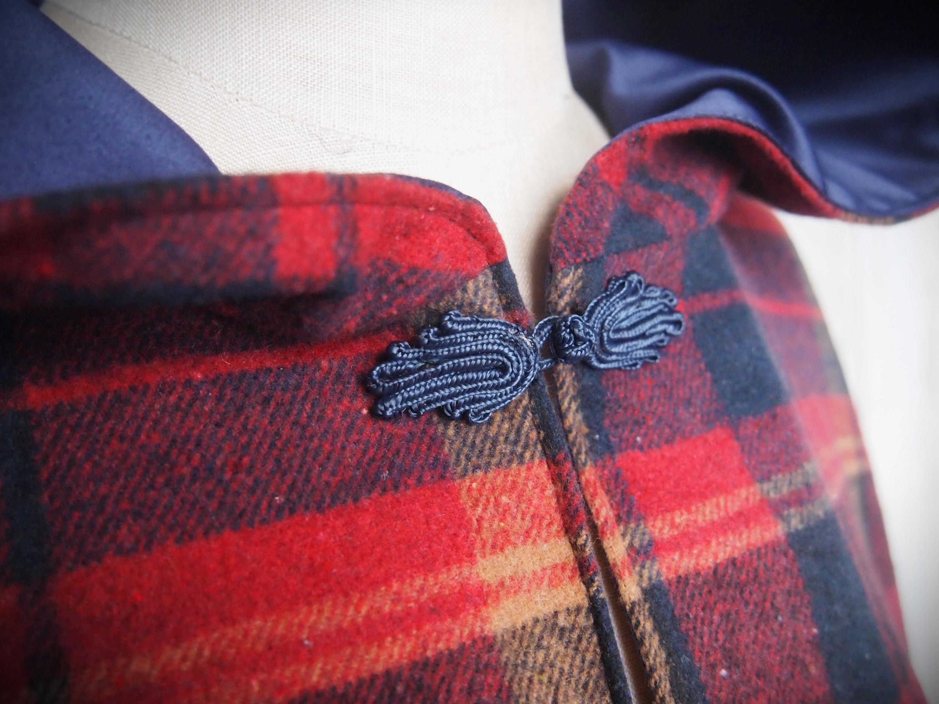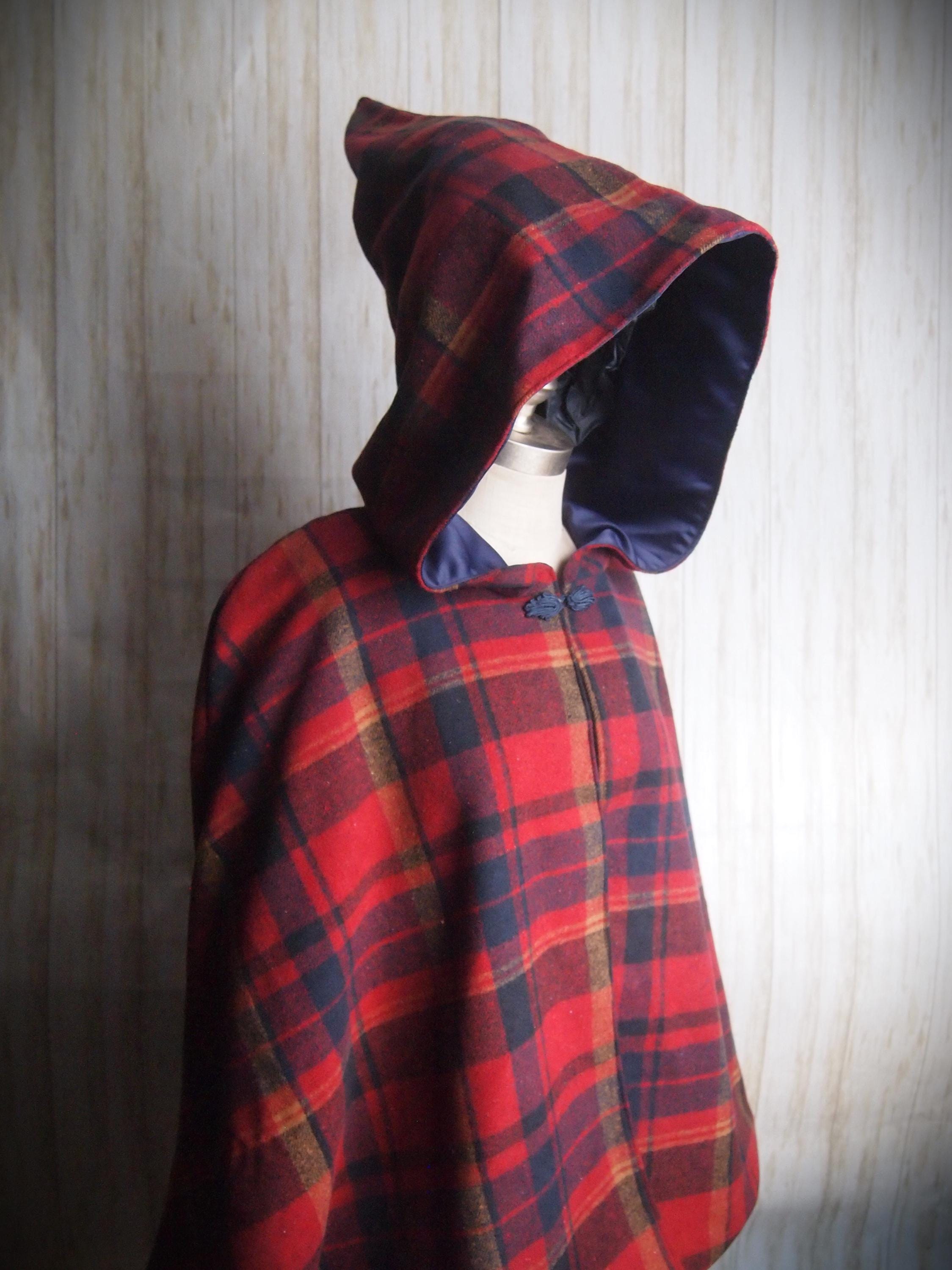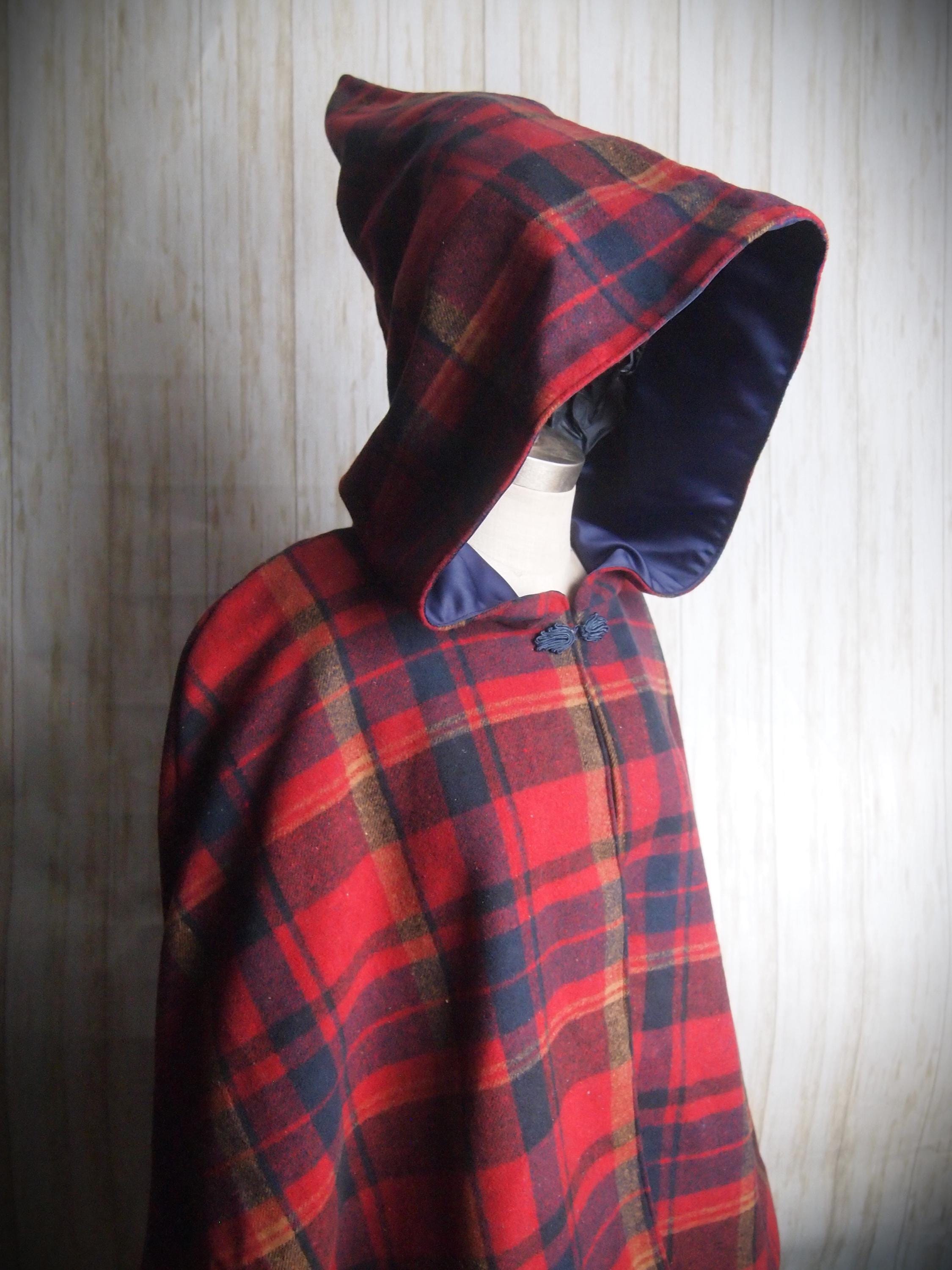 Handmade hooded plaid cape with blue frog closure. Thick brushed cotton outer shell and navy blue poly satin lining. Comes to just below the wrists, and is sloped at the back. Would look great with leggings and boots!!!!