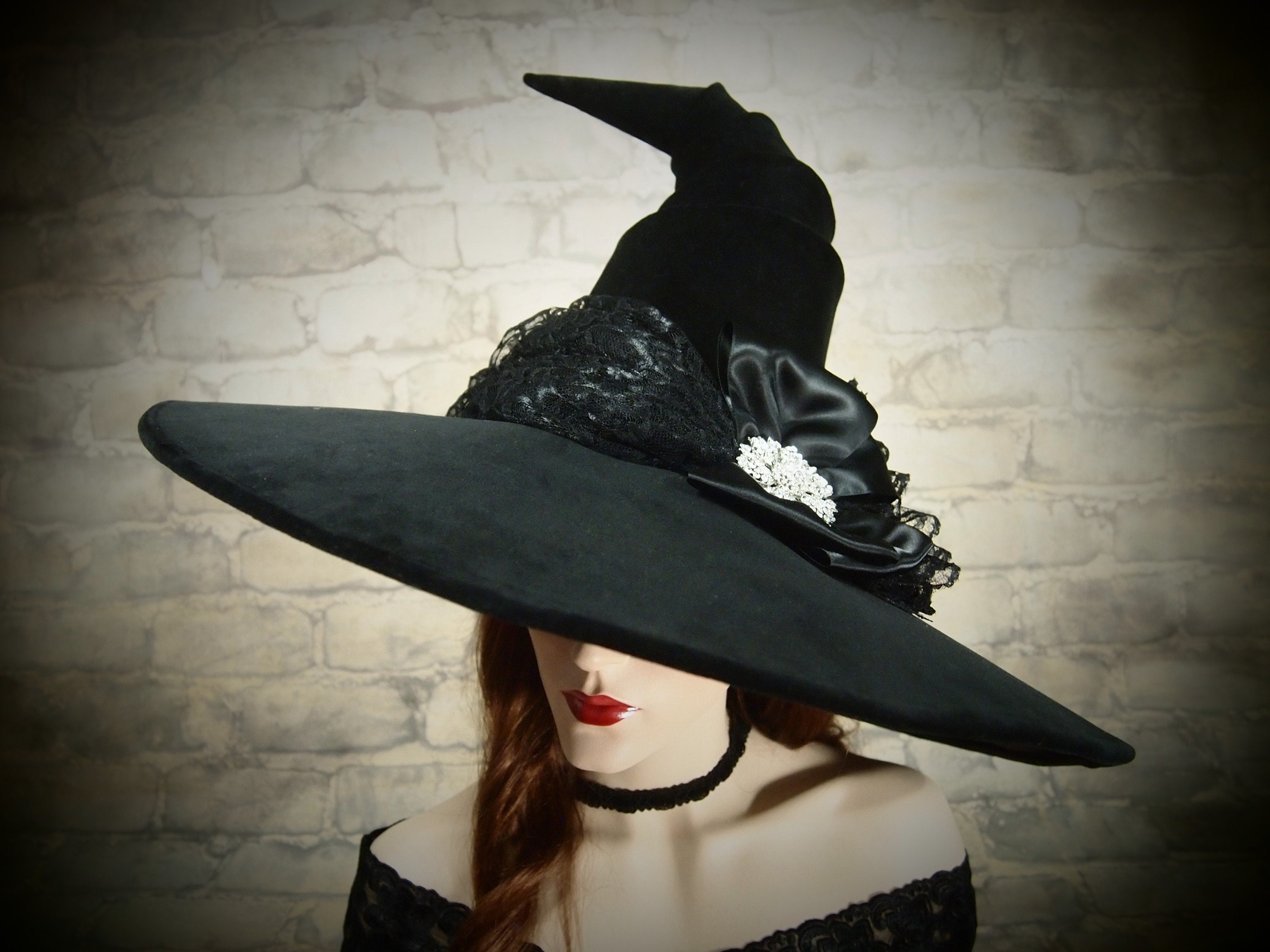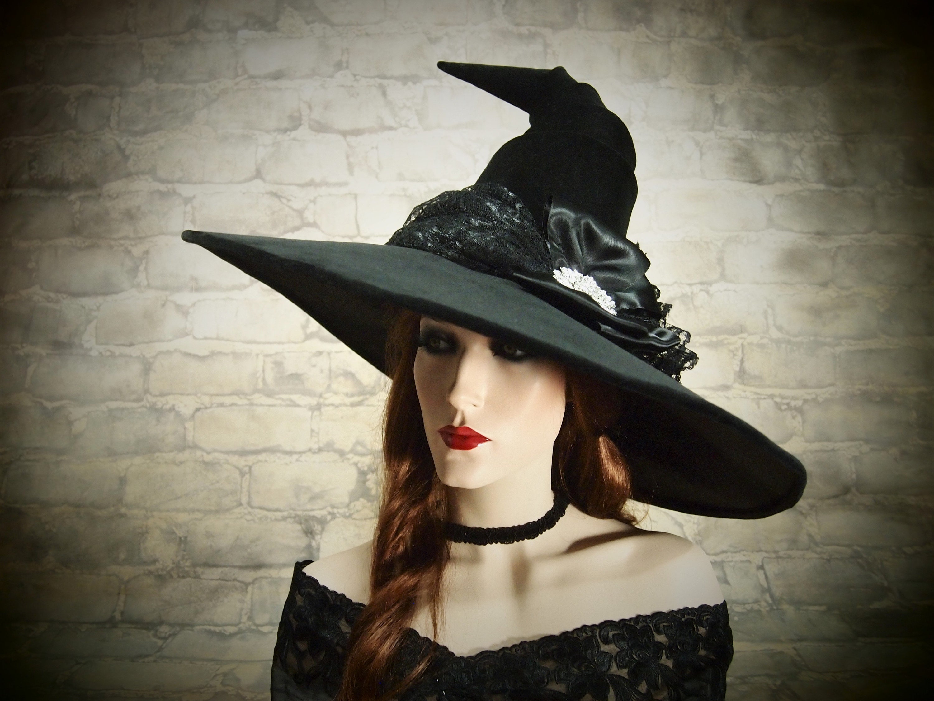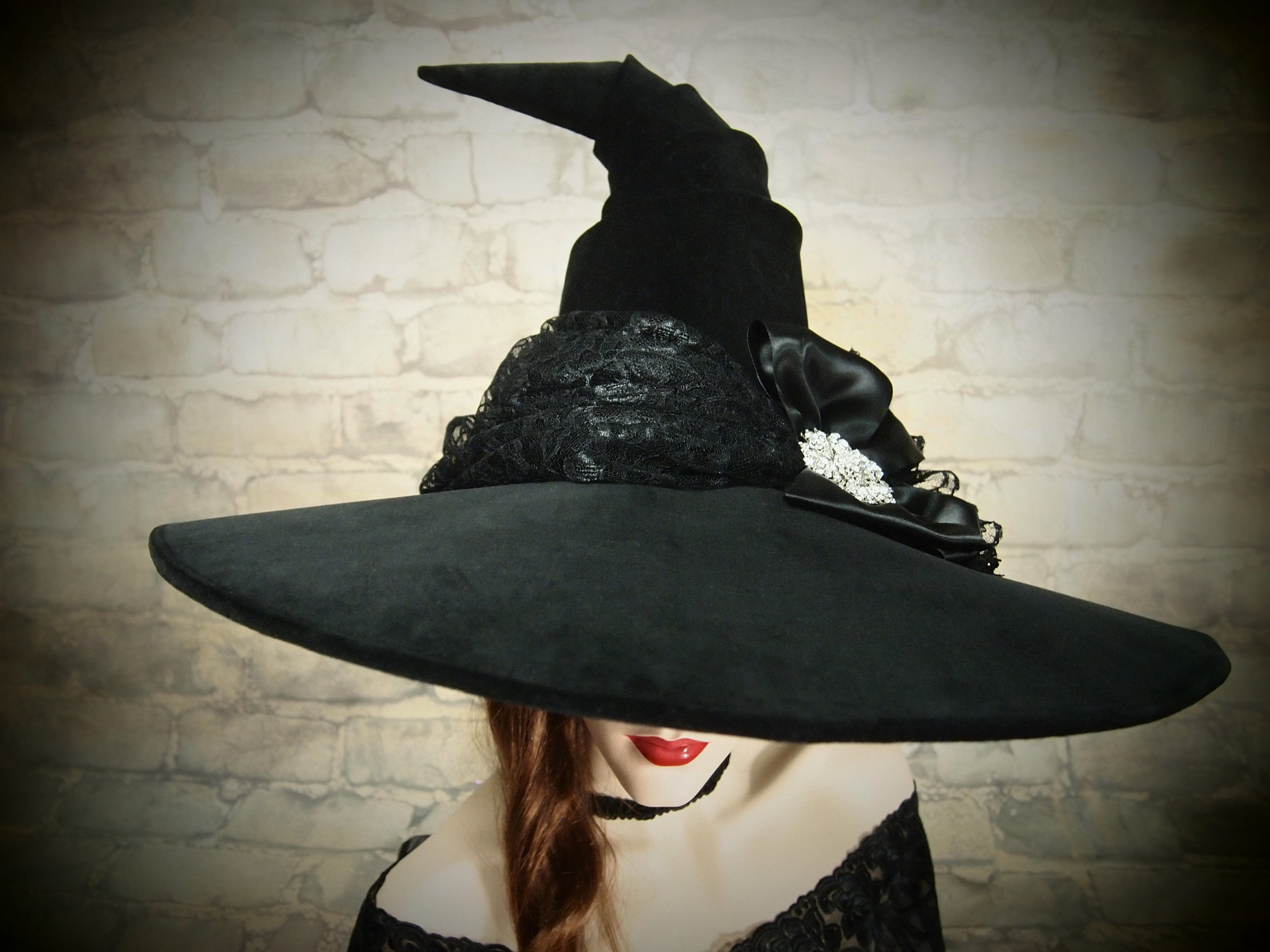 Simply said, Quality. Don't be fooled by other hand made witch hats, my husband and I are fully trained Milliners and every hat we offer is made by us in our workshop. Our hat bases are designed and made (again, by us) completely from scratch with industrial level equipment and supplies to ensure the base hat is the highest quality and structure available. Our hats are sturdy, structured and keep their shape. Yep! NO FLIMSY HAT BASES! We then decorate each and every one into a work of art as unique as the Witch who wears it. We take pride in our work and create every piece with the love, care. We hope you enjoy our hats as much as we do!