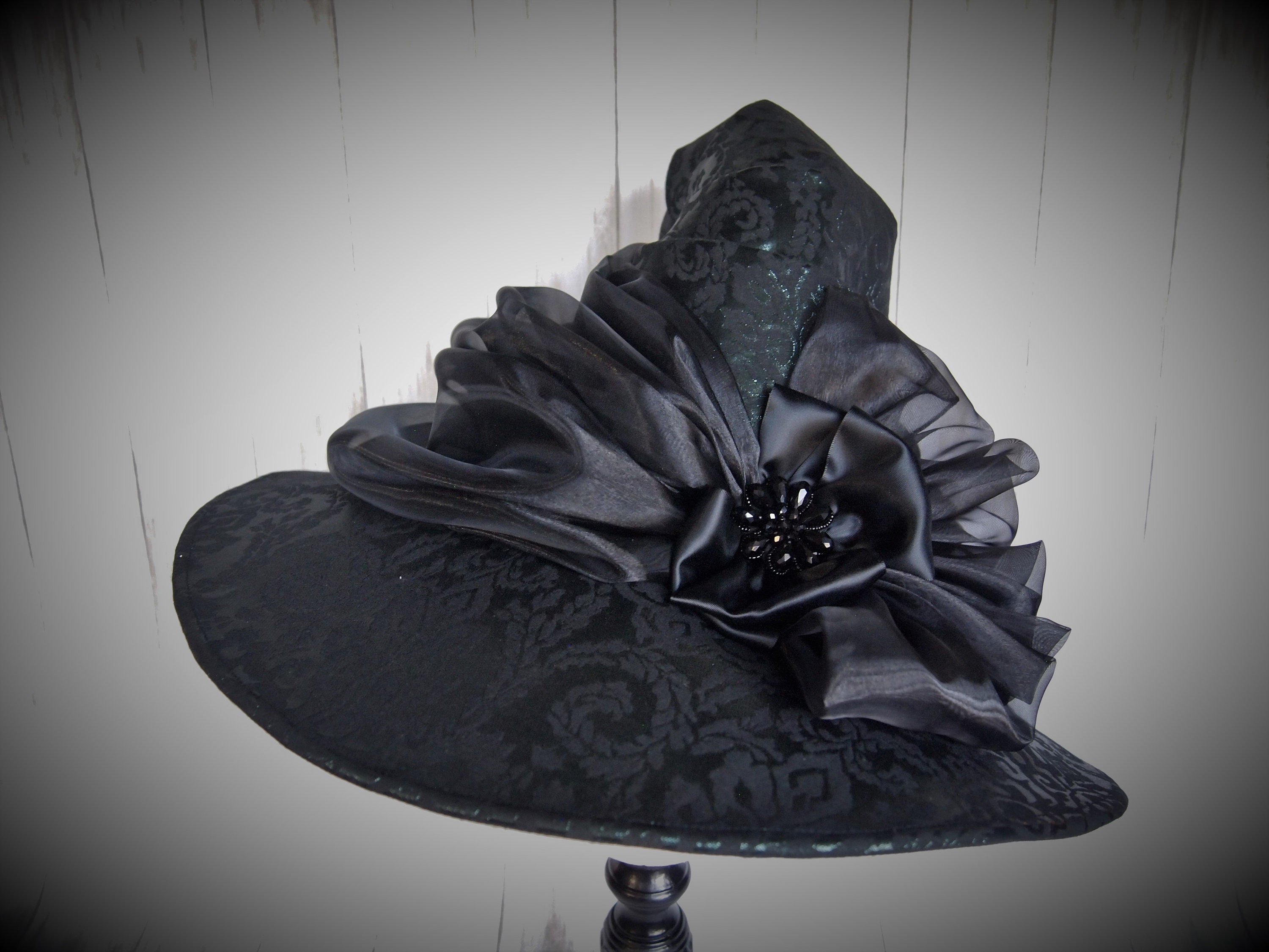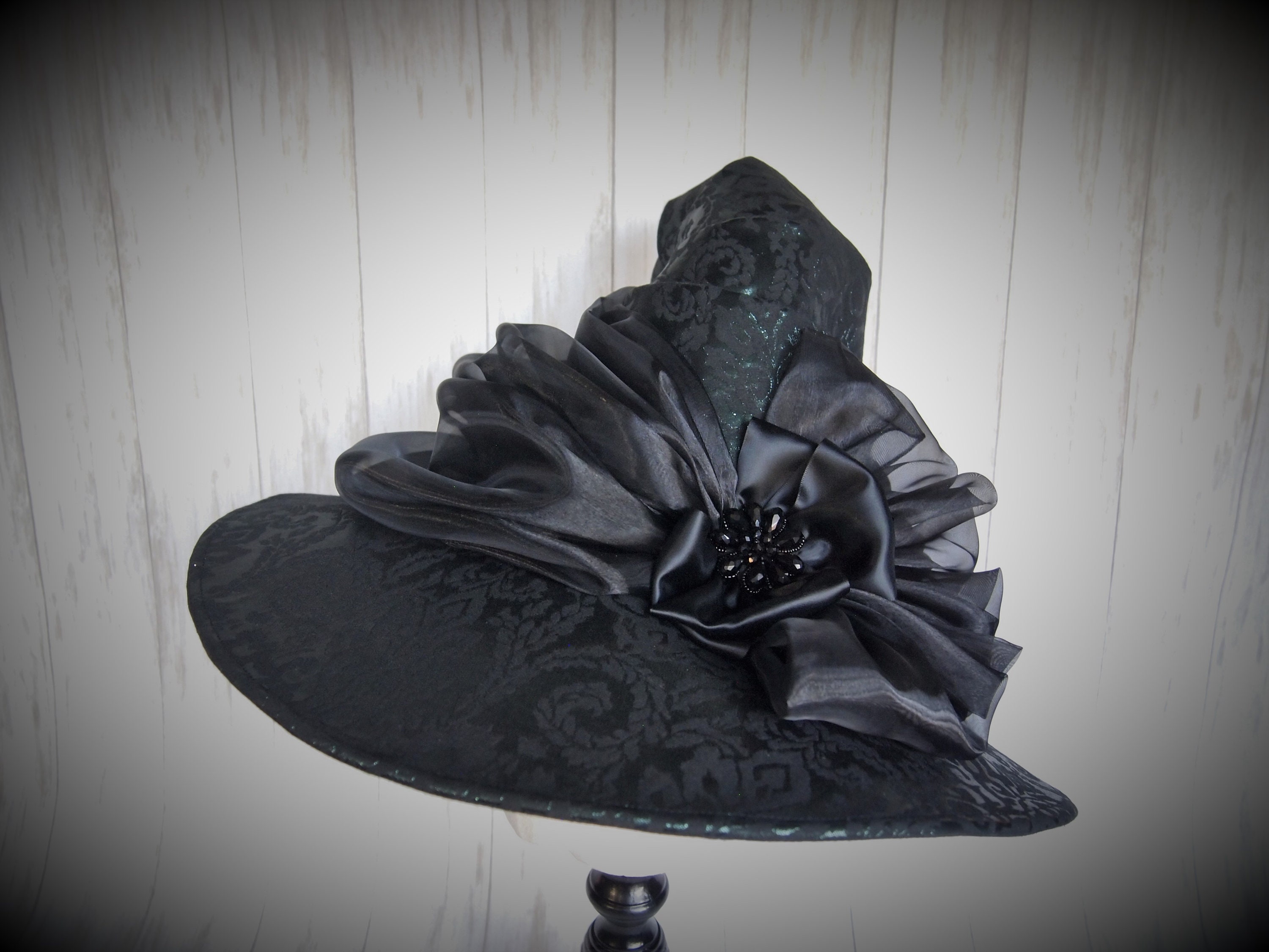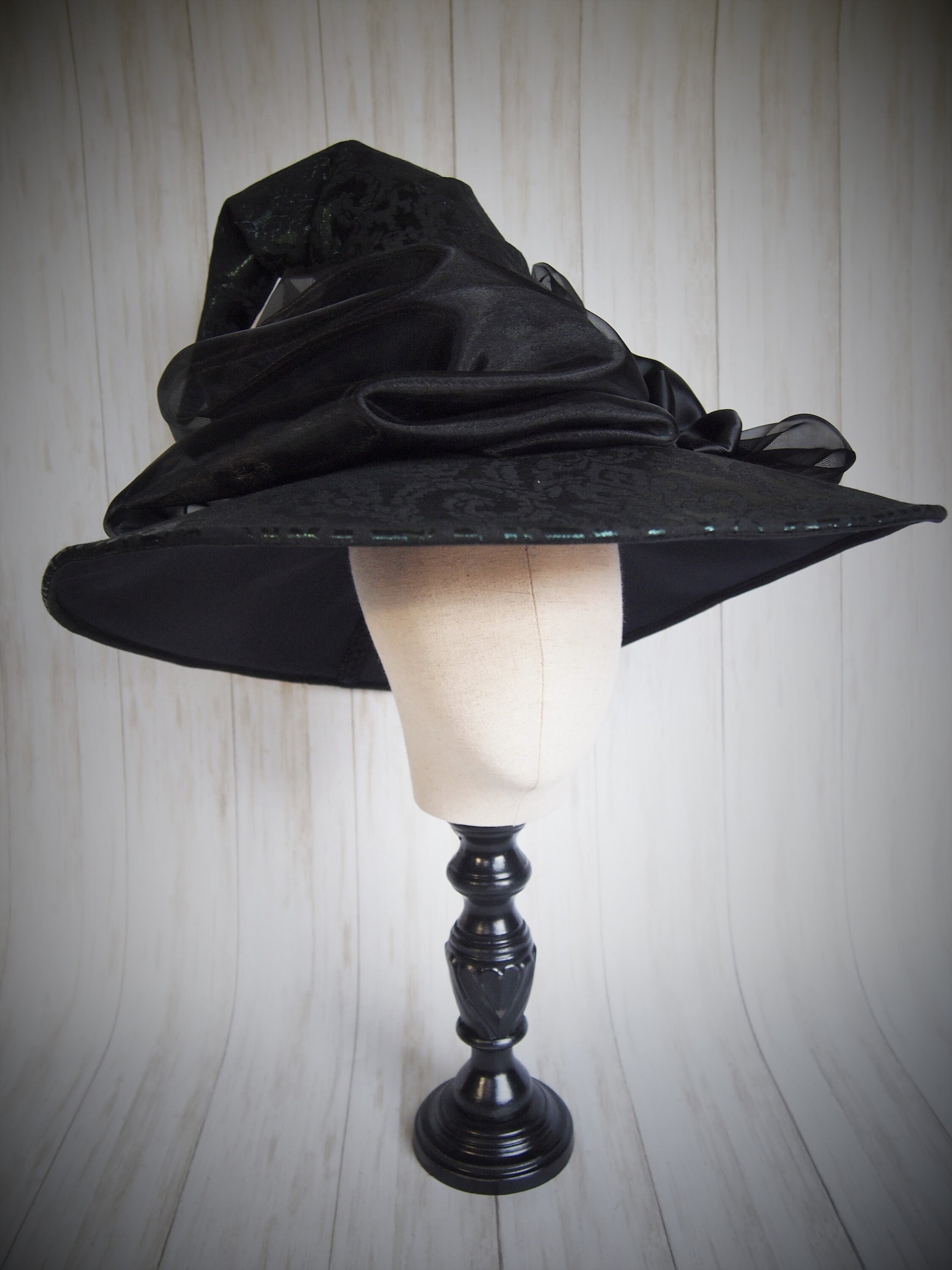 Simply said, Quality. Don't be fooled by other hand made witch hats, my husband and I are fully trained Milliners and every hat we offer is made by us in our workshop. Our hat bases are designed and made (again, by us) completely from scratch with industrial level equipment and supplies to ensure the base hat is the highest quality and structure available. Our hats are sturdy, structured and keep their shape. Yep! NO FLIMSY HAT BASES! We then decorate each and every one into a work of art as unique as the Witch who wears it. We take pride in our work and create every piece with the love, care. We hope you enjoy our hats as much as we do!