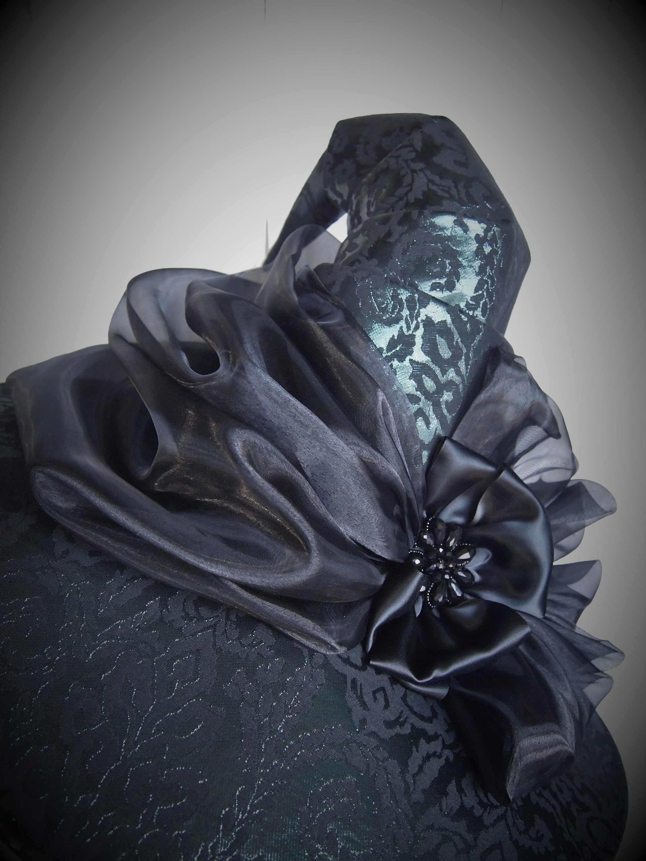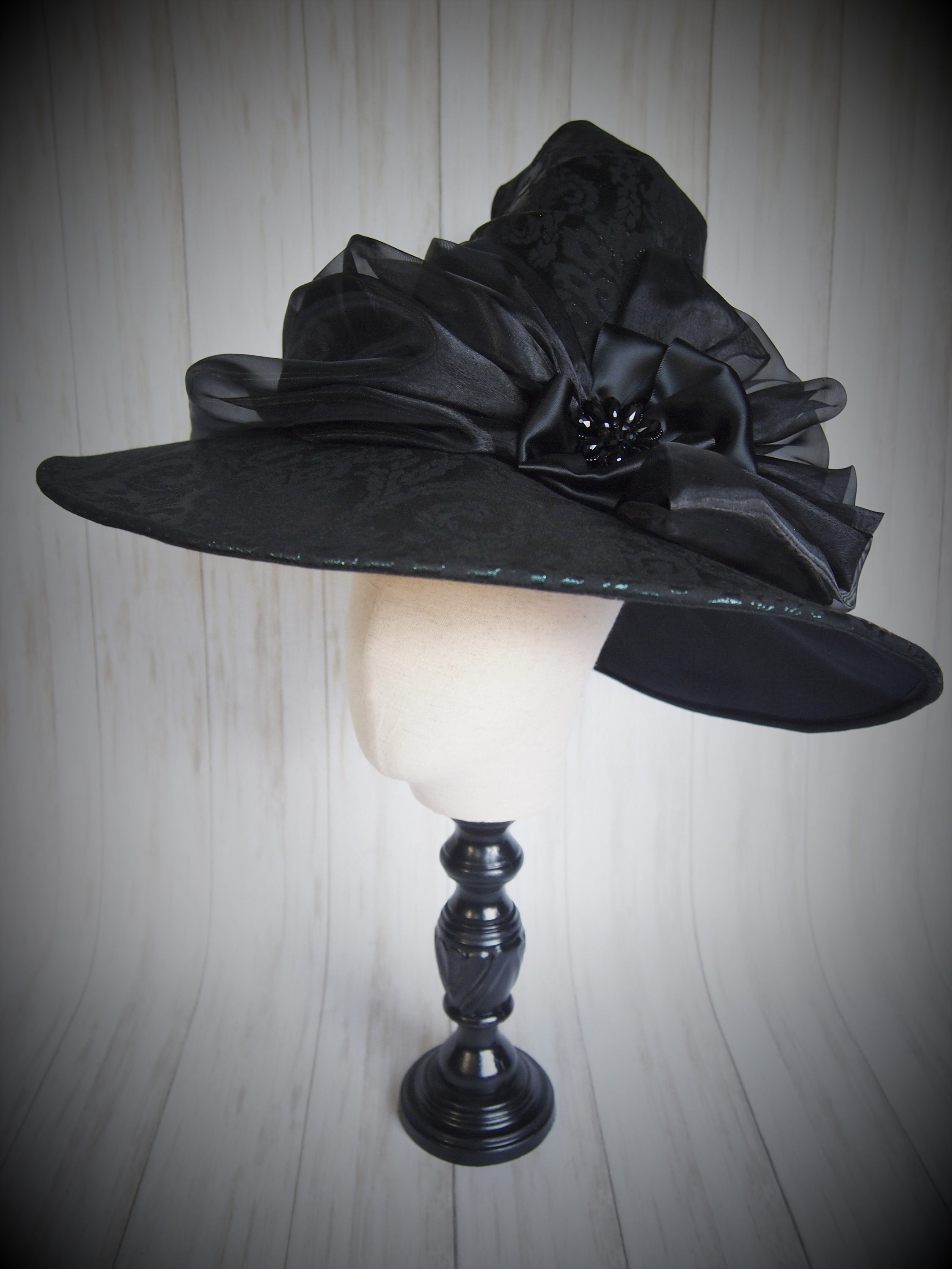 The brim is adorned with a beautiful black organza sash ending in a soft satin bow cradling a jet black beaded centerpiece!
