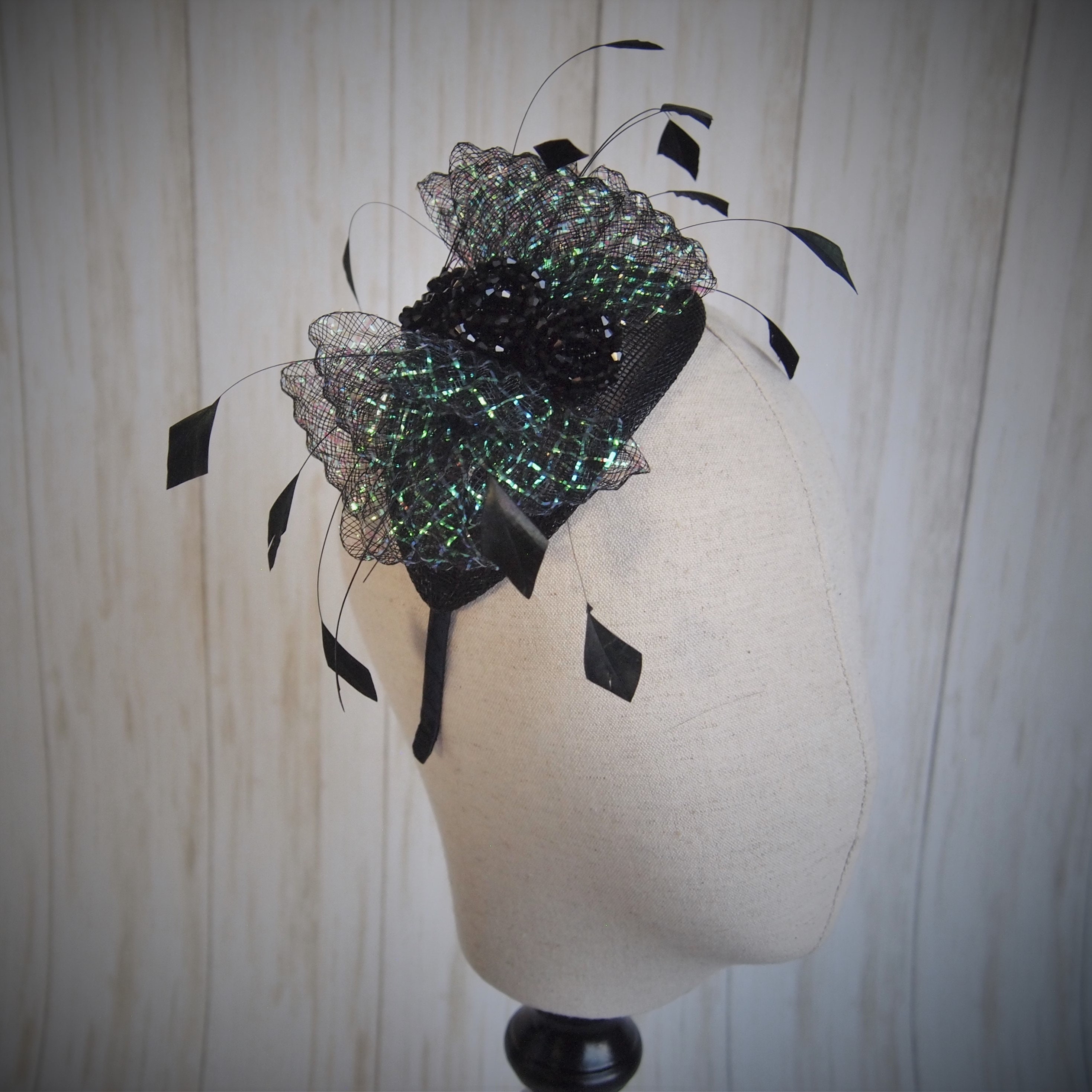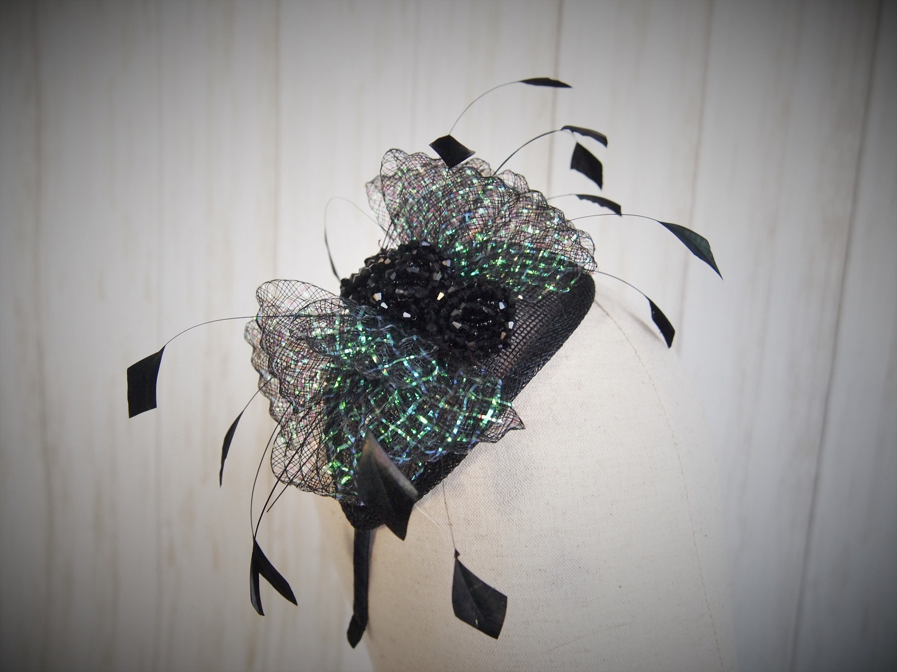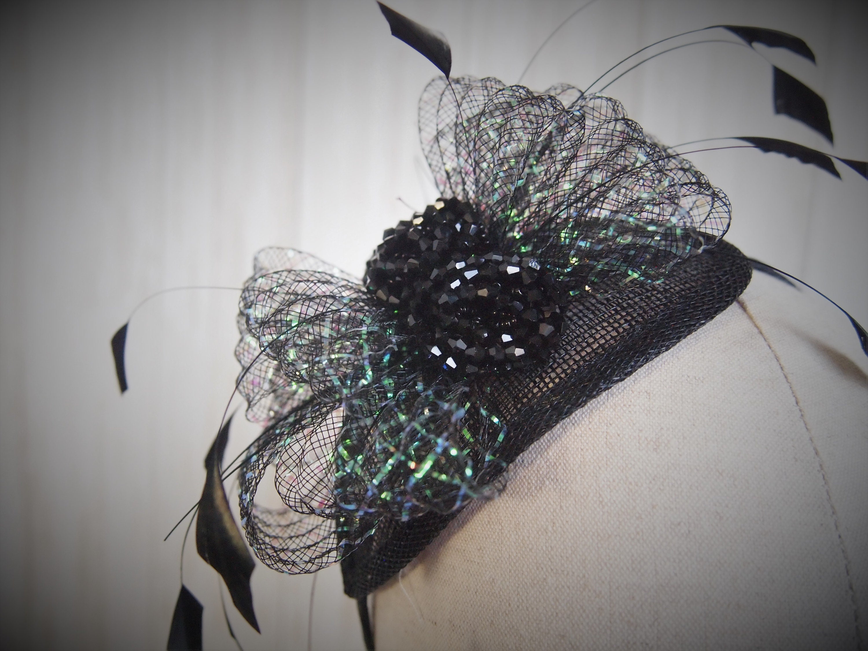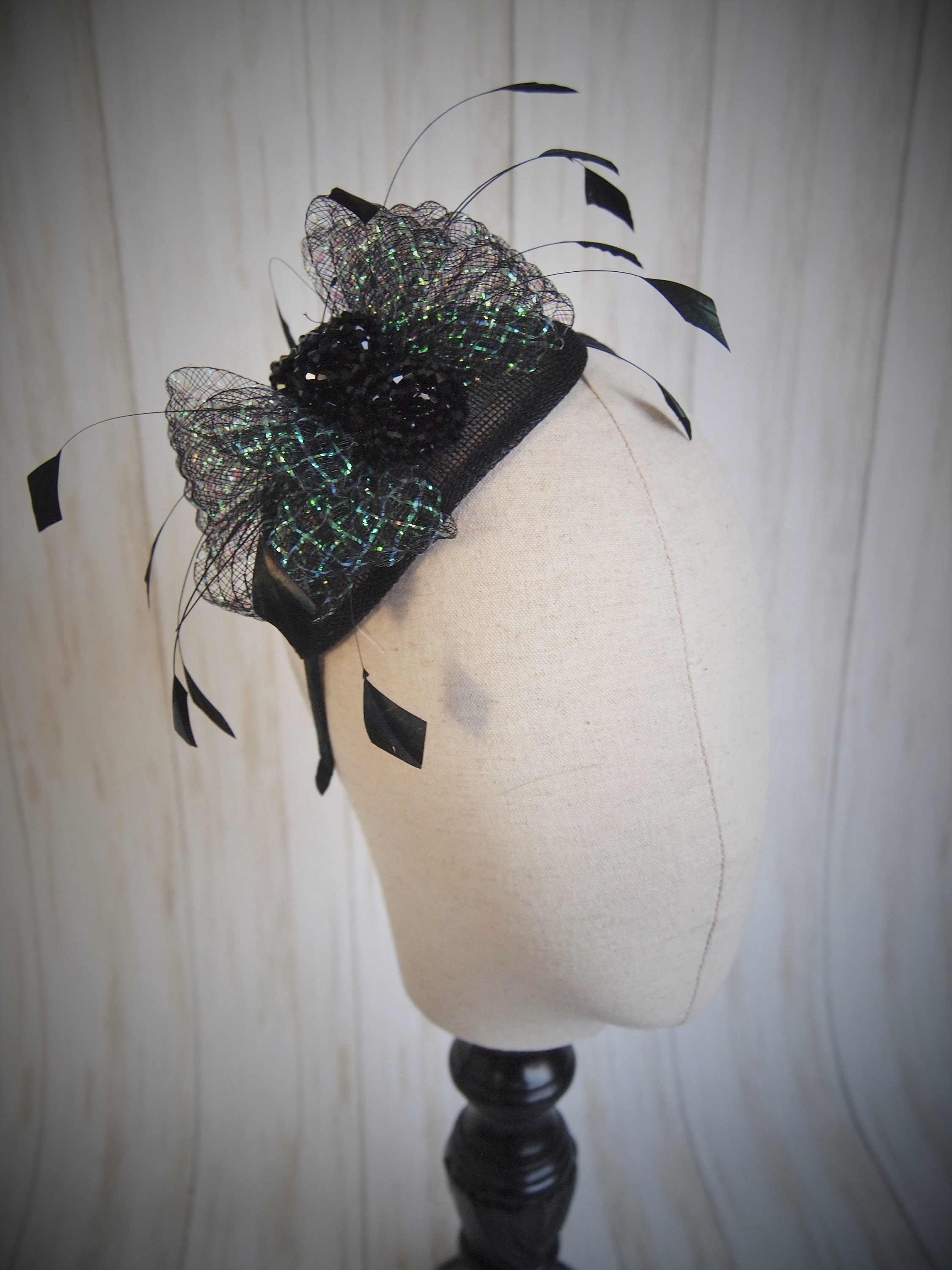 This piece is easy to wear. Handcrafted, with a sinamay straw base, sheer black and iridescent bow, hand cut feather accents and a beaded center. How could it be better?