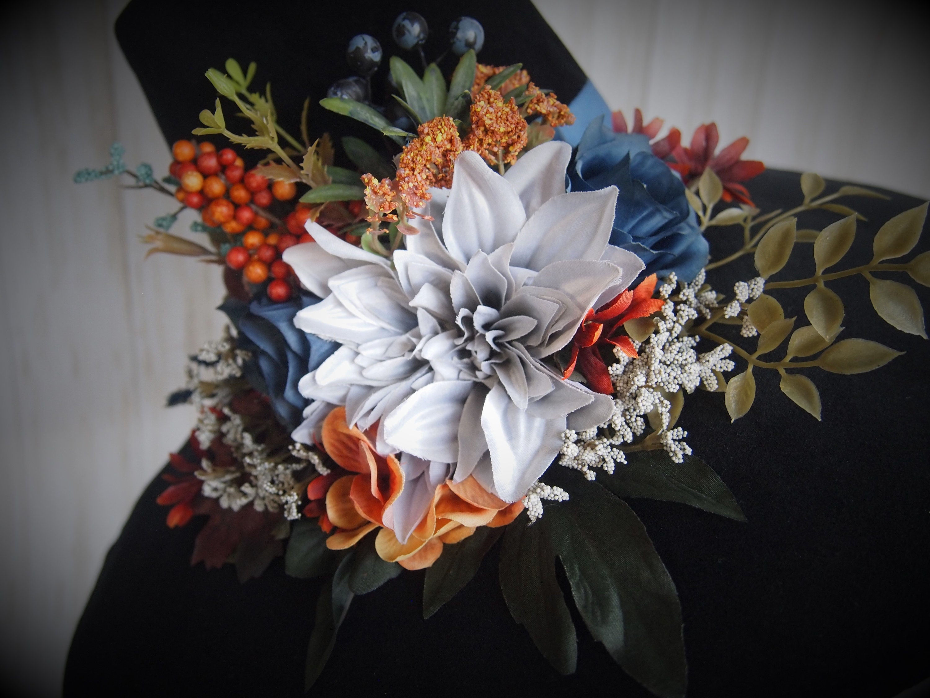The brim is adorned with a grosgrain band ending in a cluster of beautiful flowers and foliage in Blues and oranges!