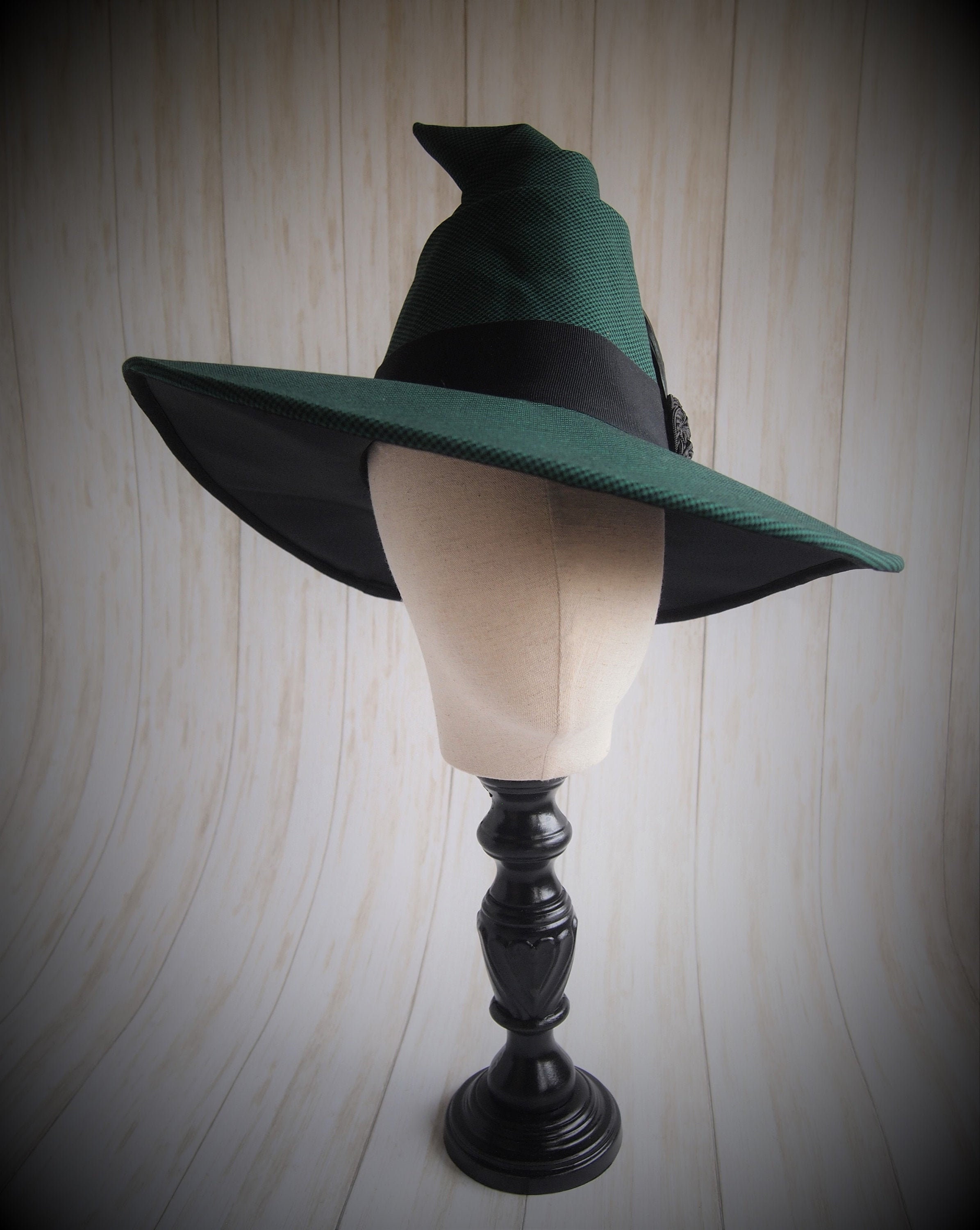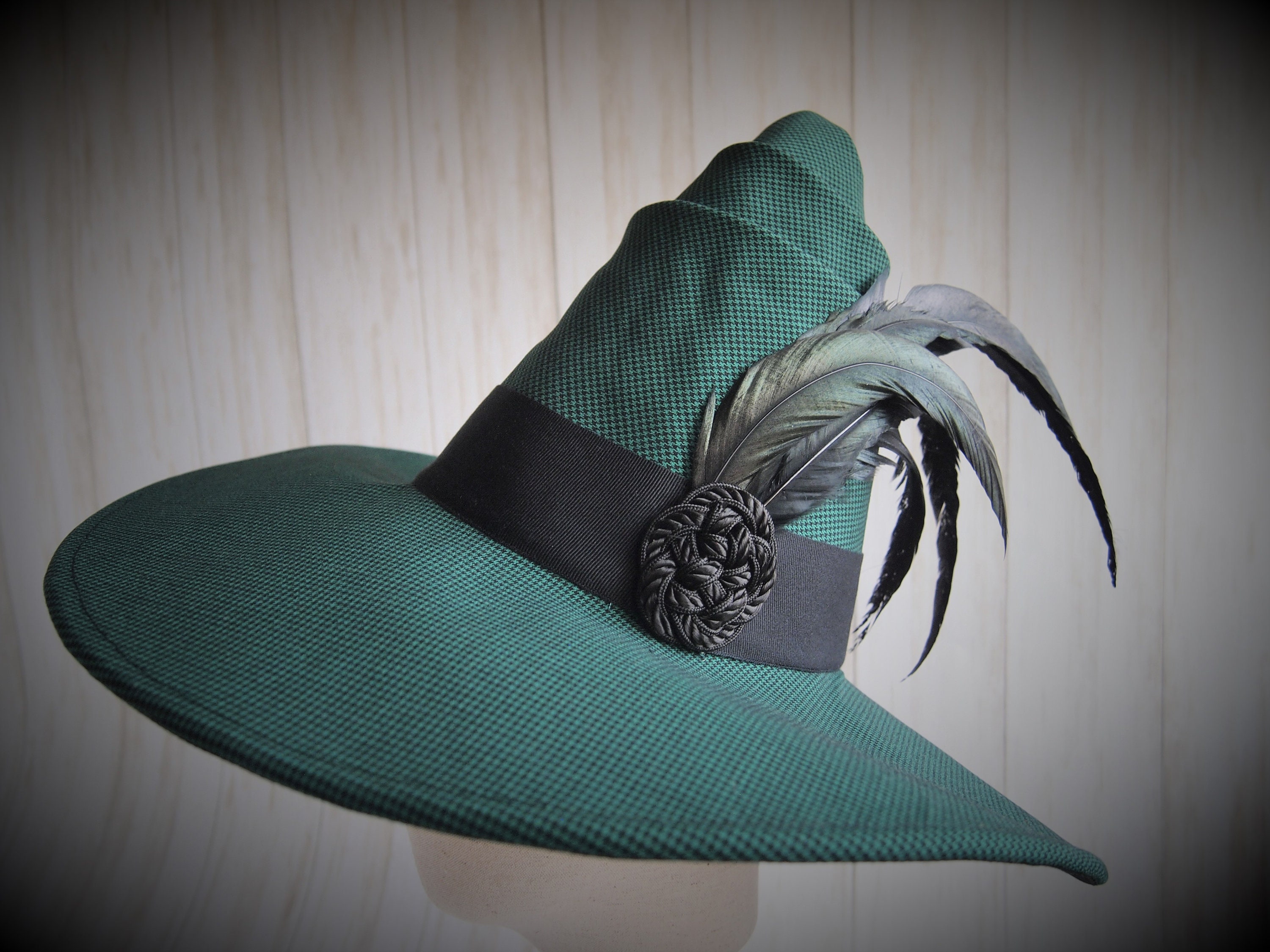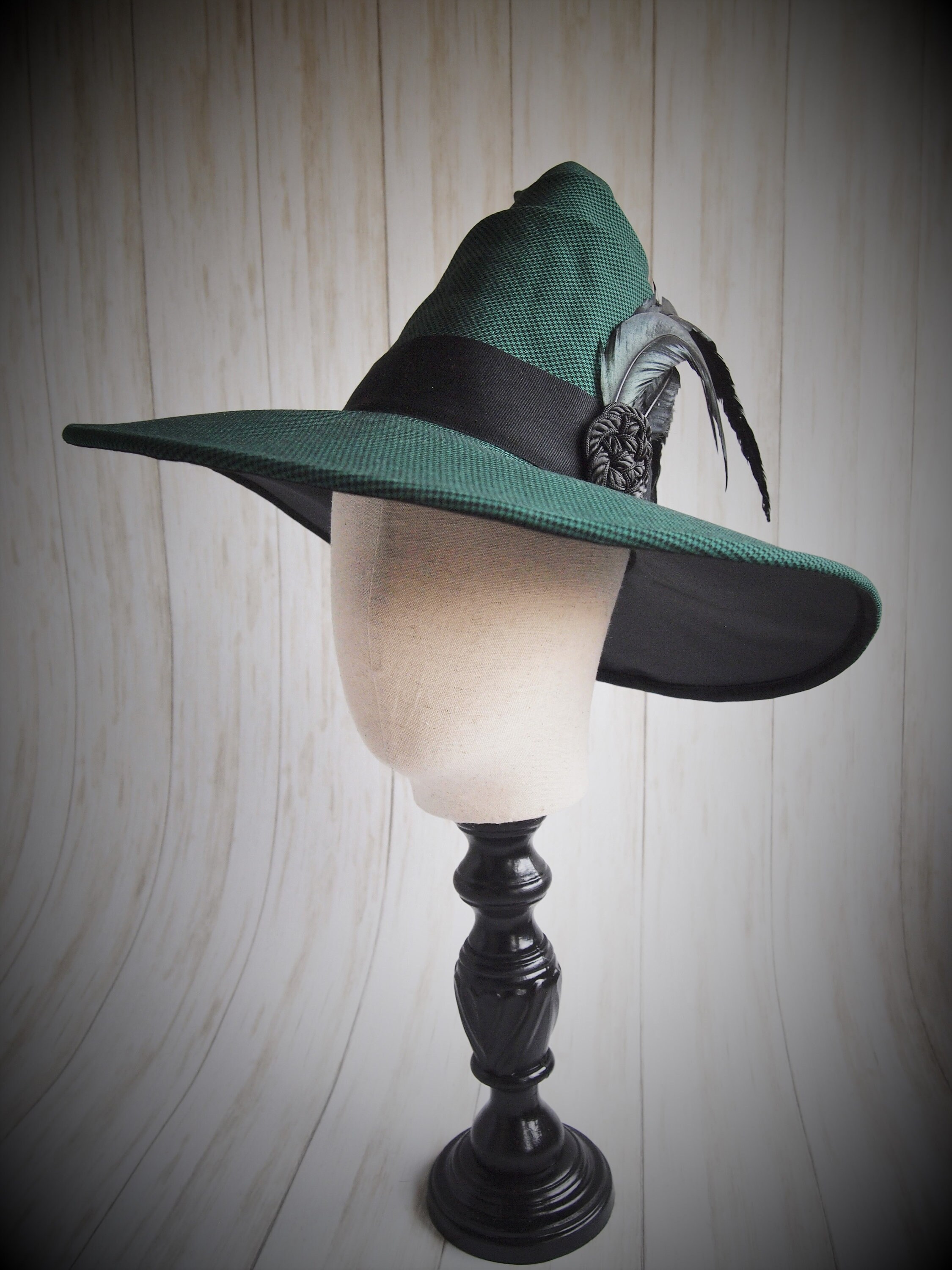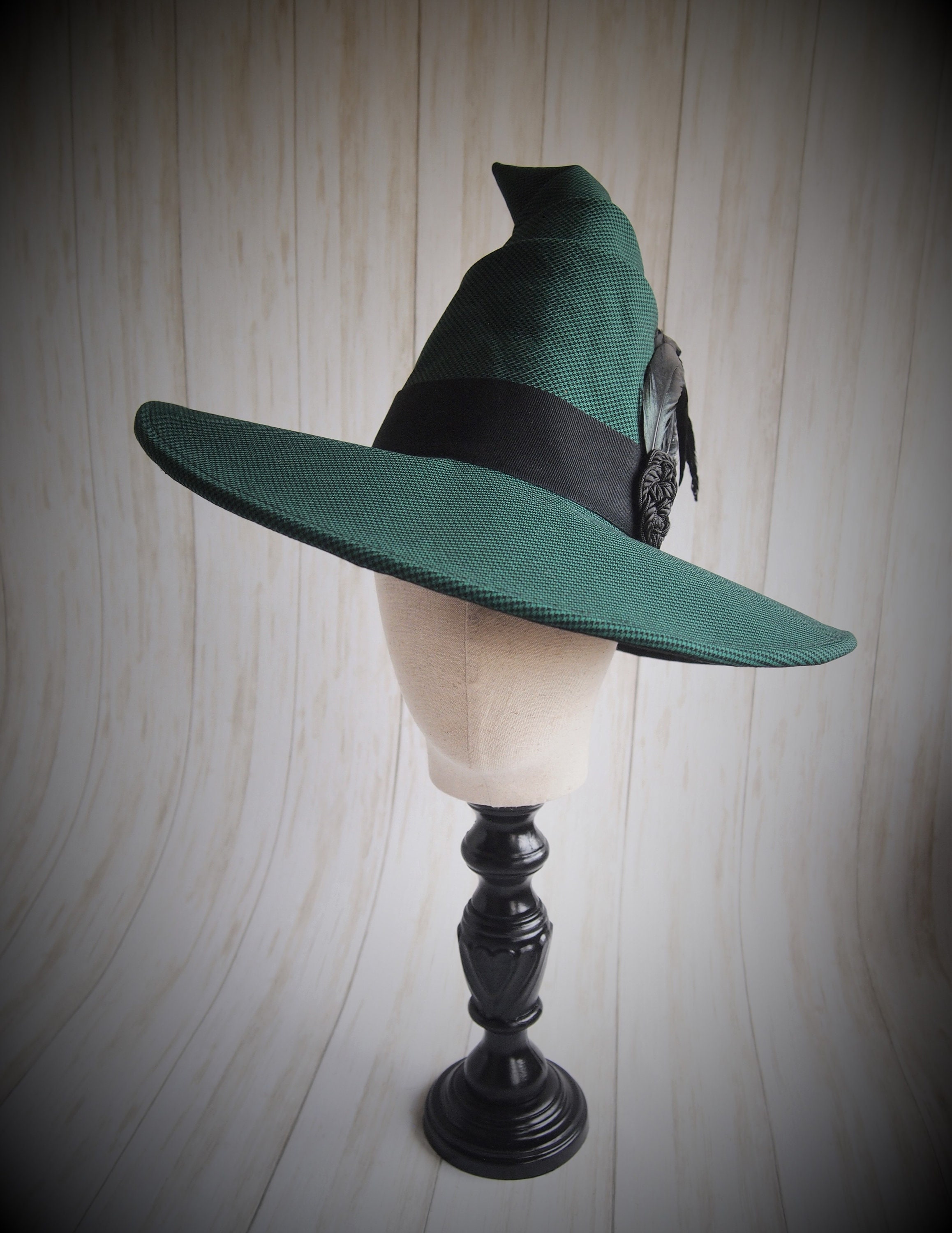One of a kind emerald green houndstooth Witch Hat with black grosgrain band, feathers and knotted detail.