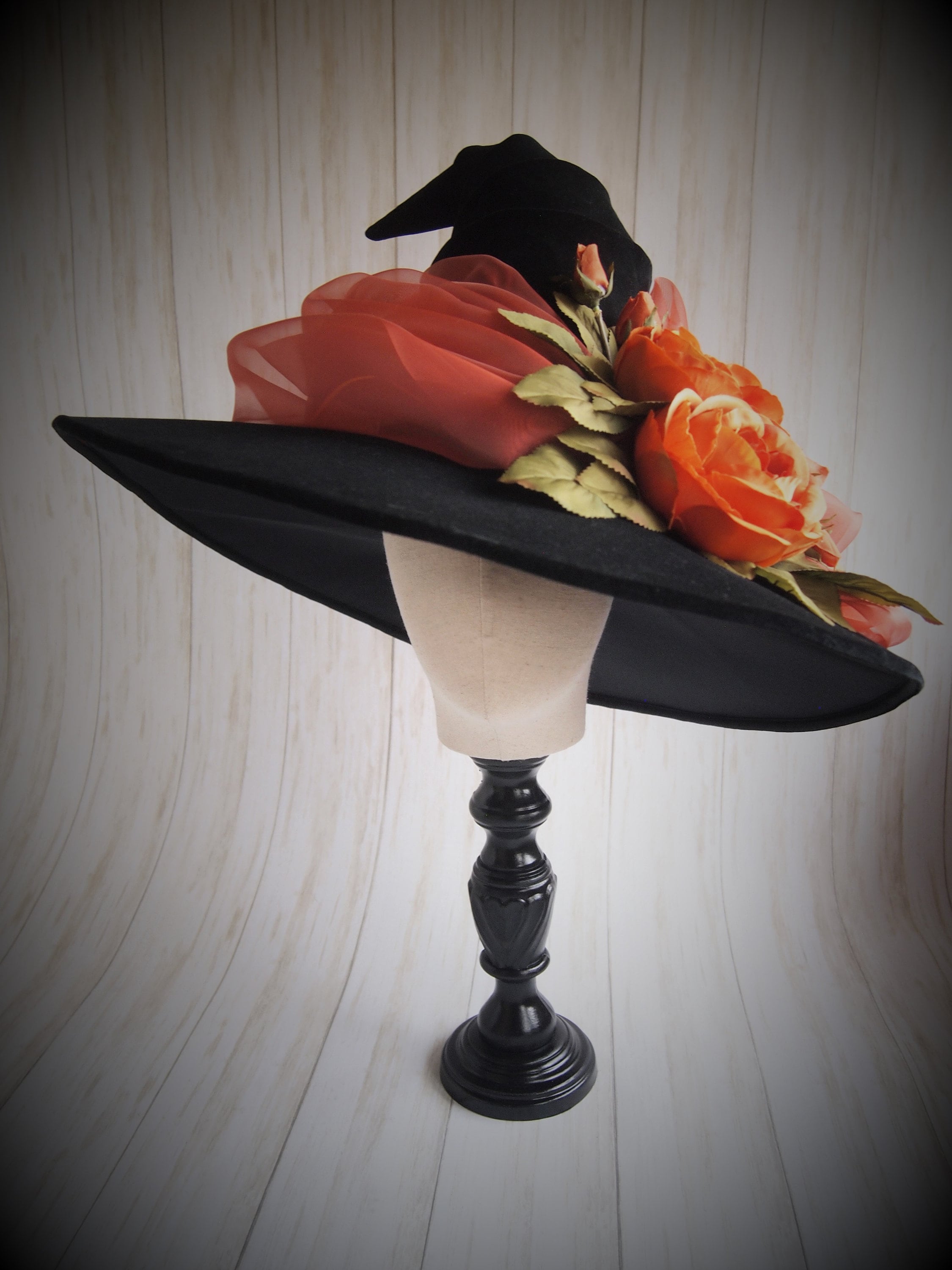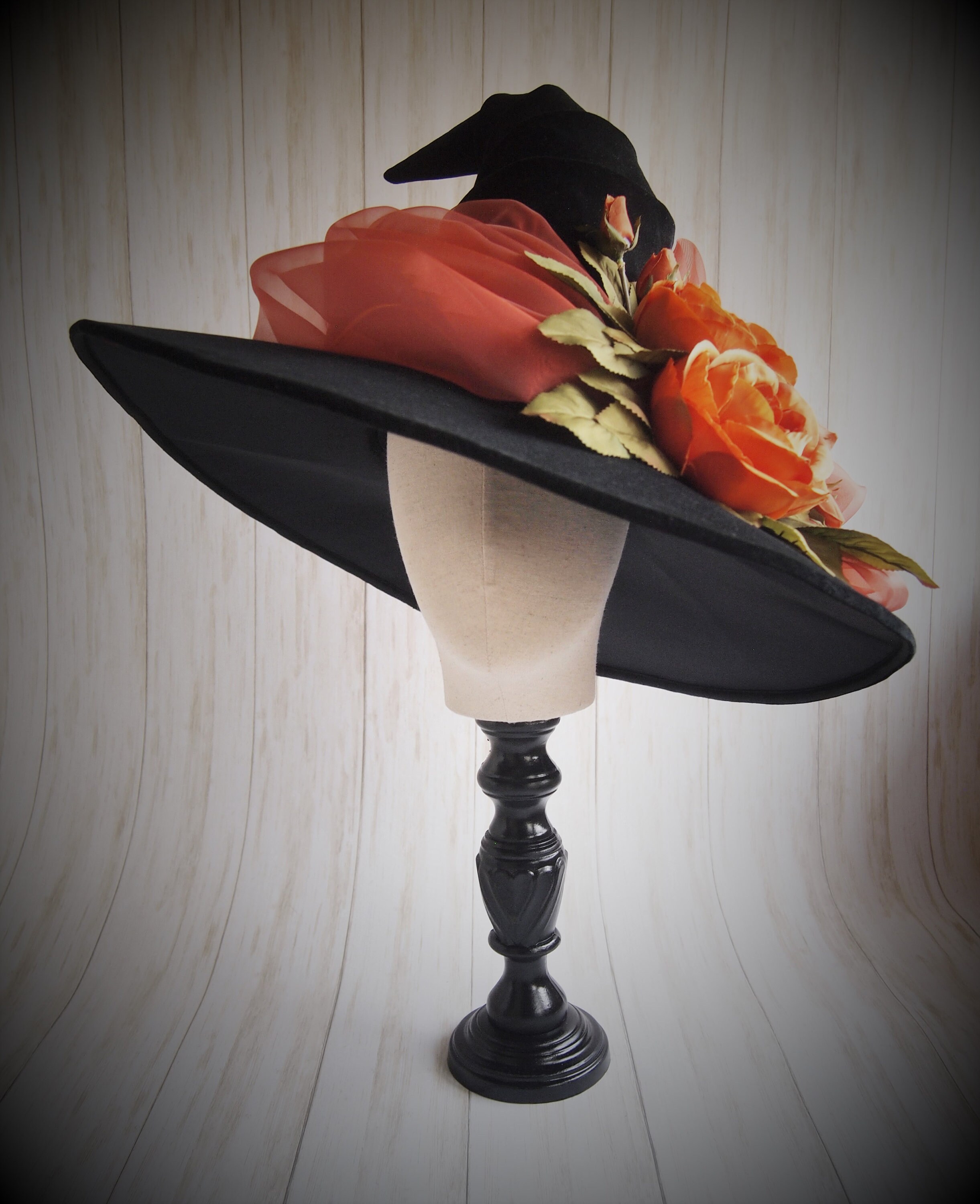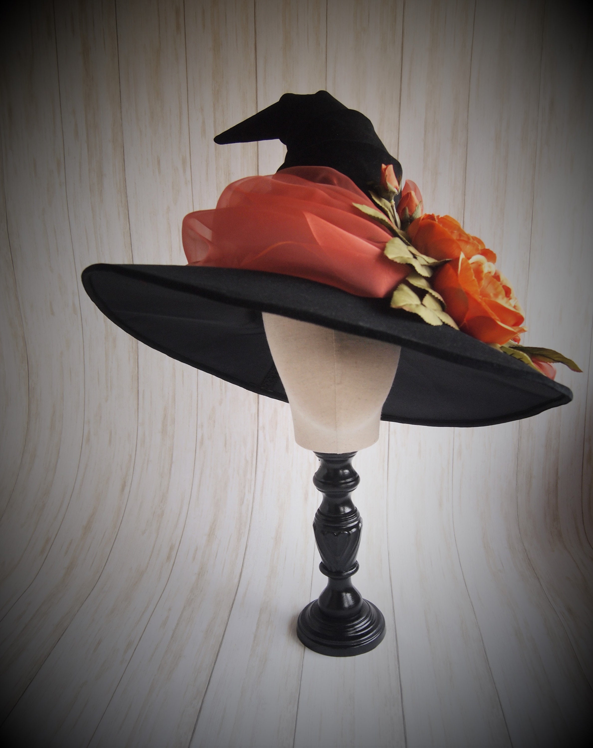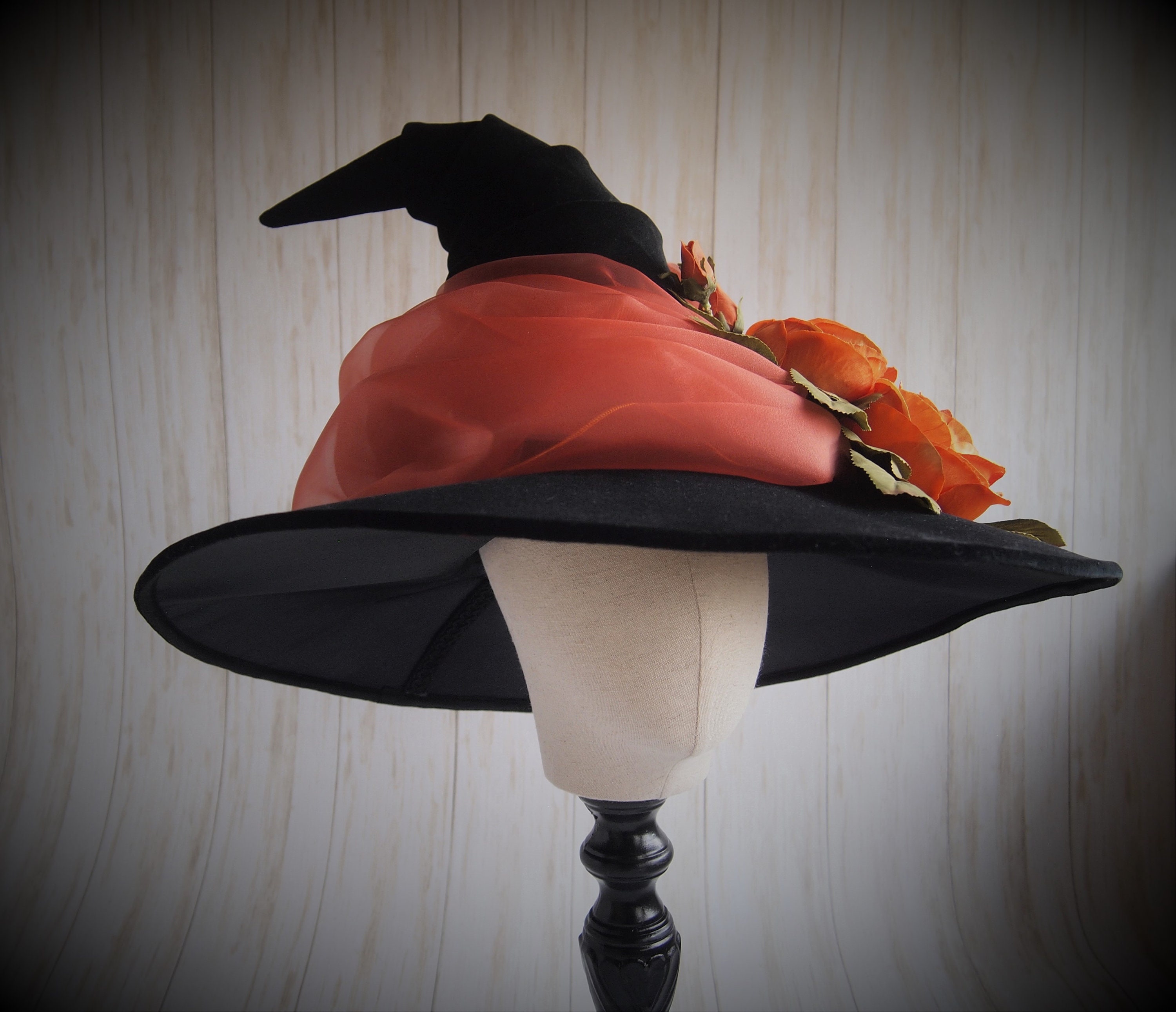 One of a Kind Black velveteen Witch Hat with orange organza sash, and orange silk flower detail.