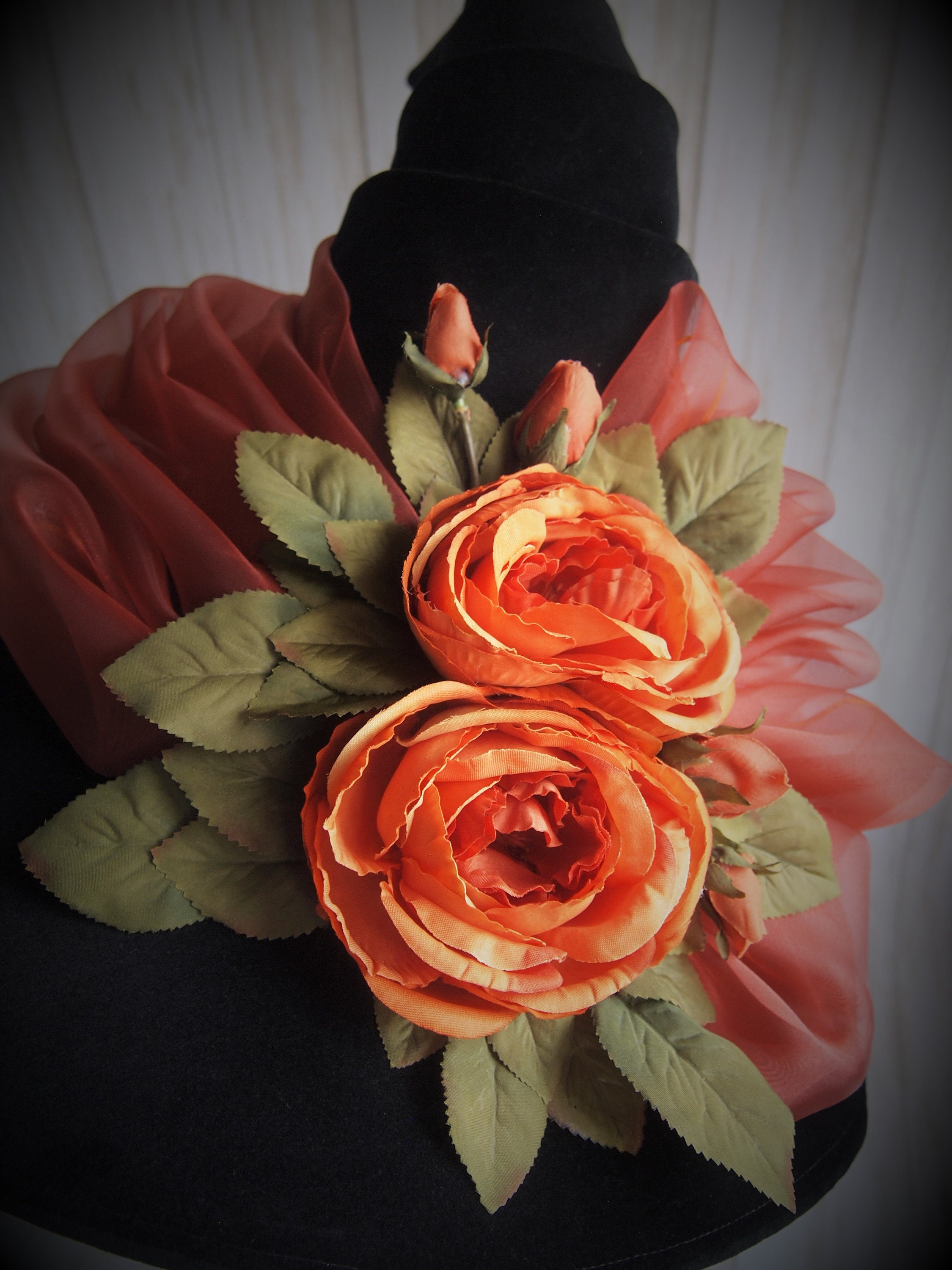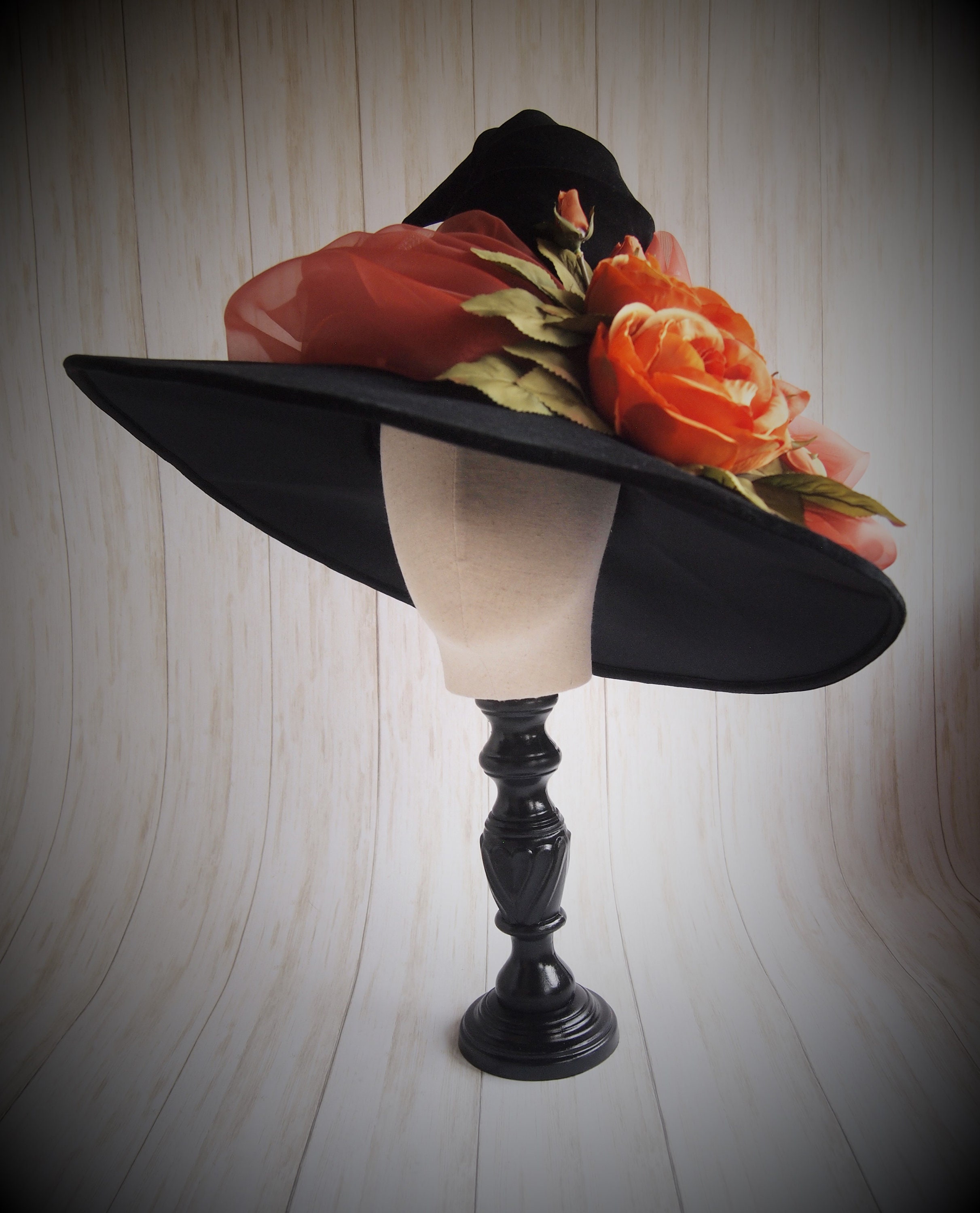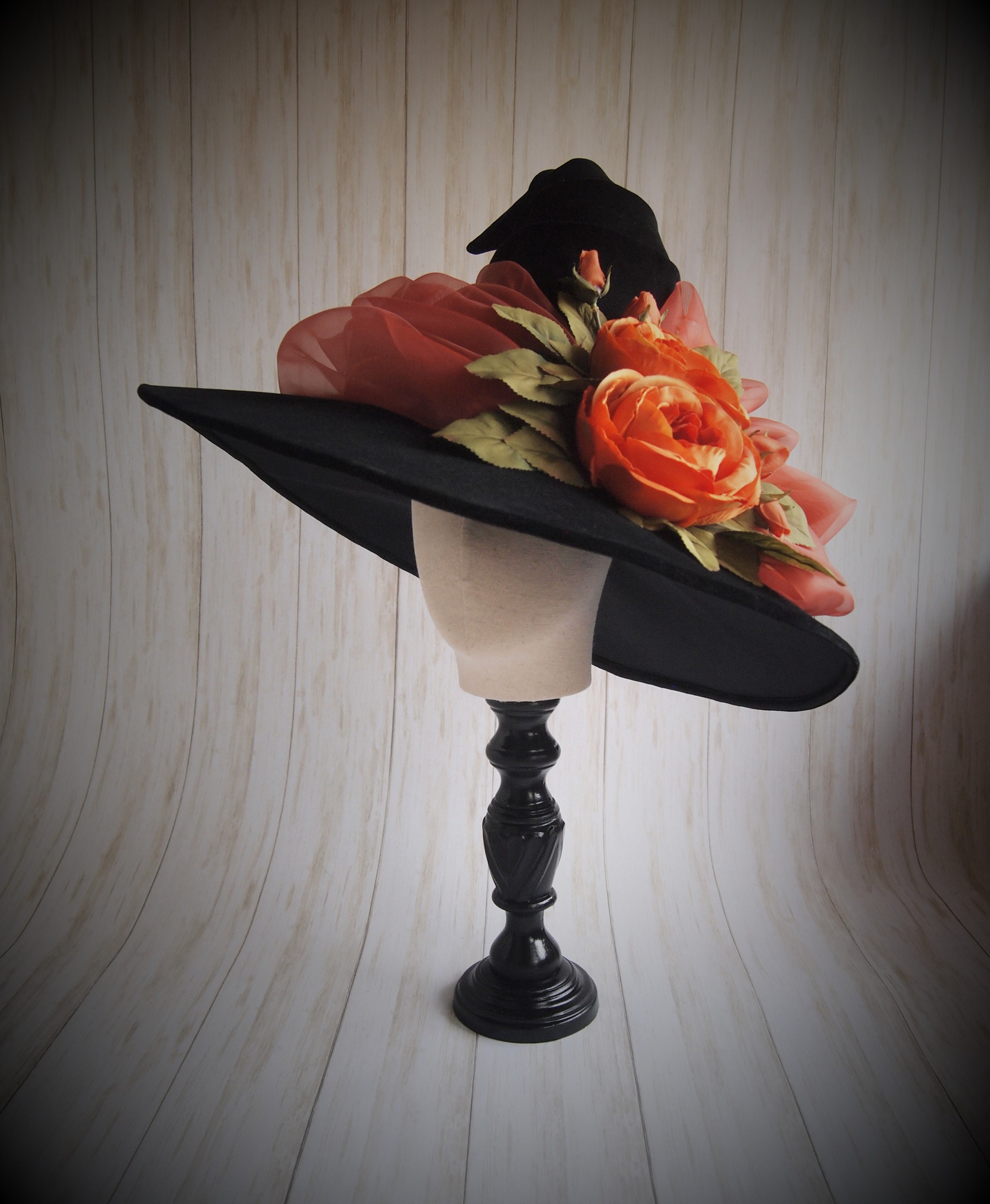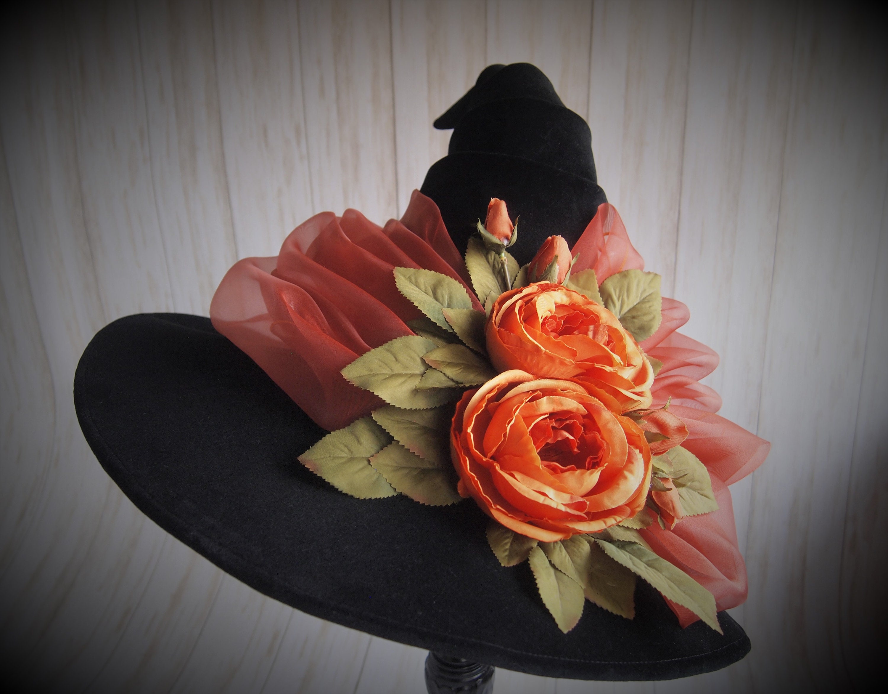 One of a Kind Black velveteen Witch Hat with orange organza sash, and orange silk flower detail.