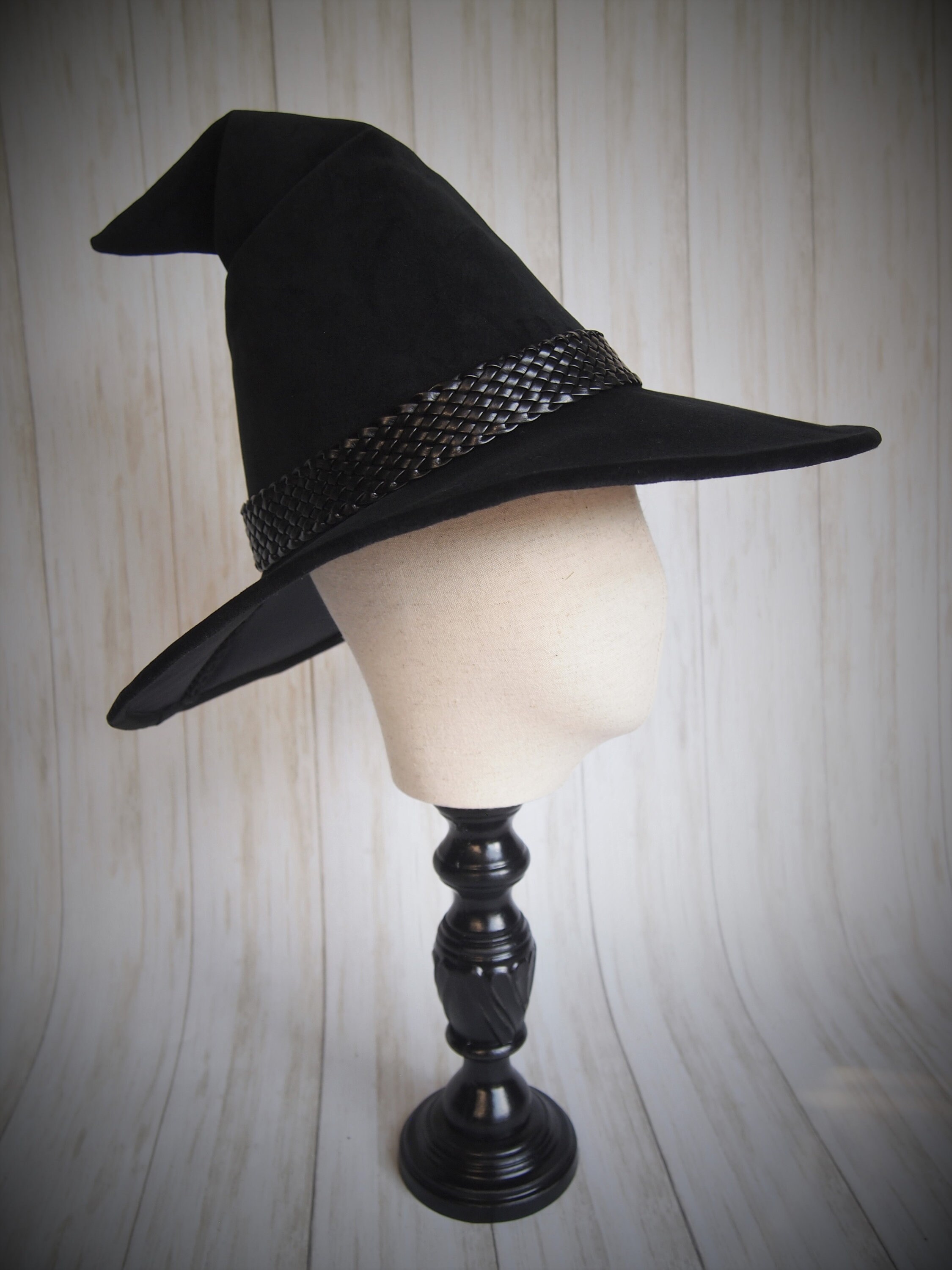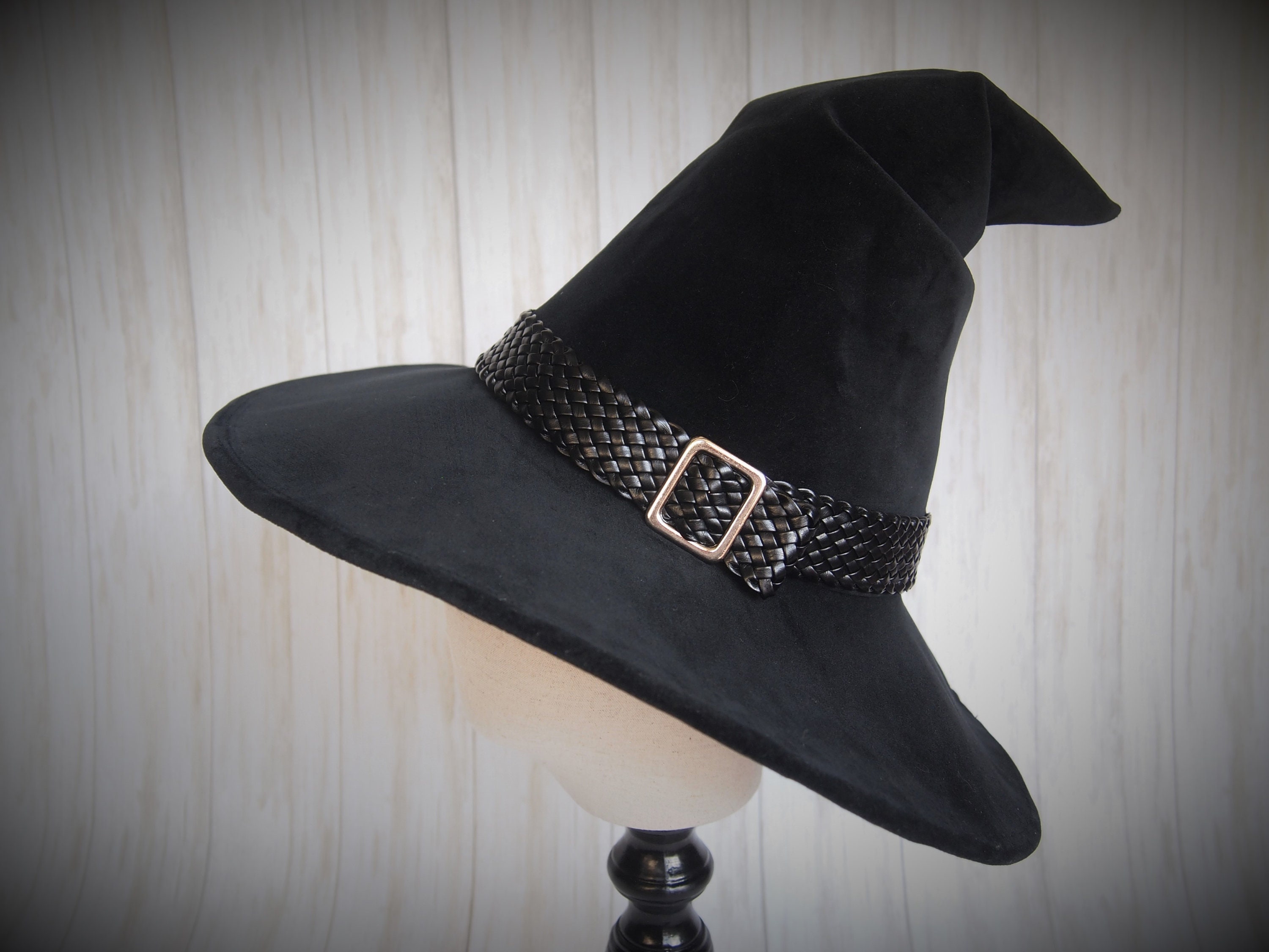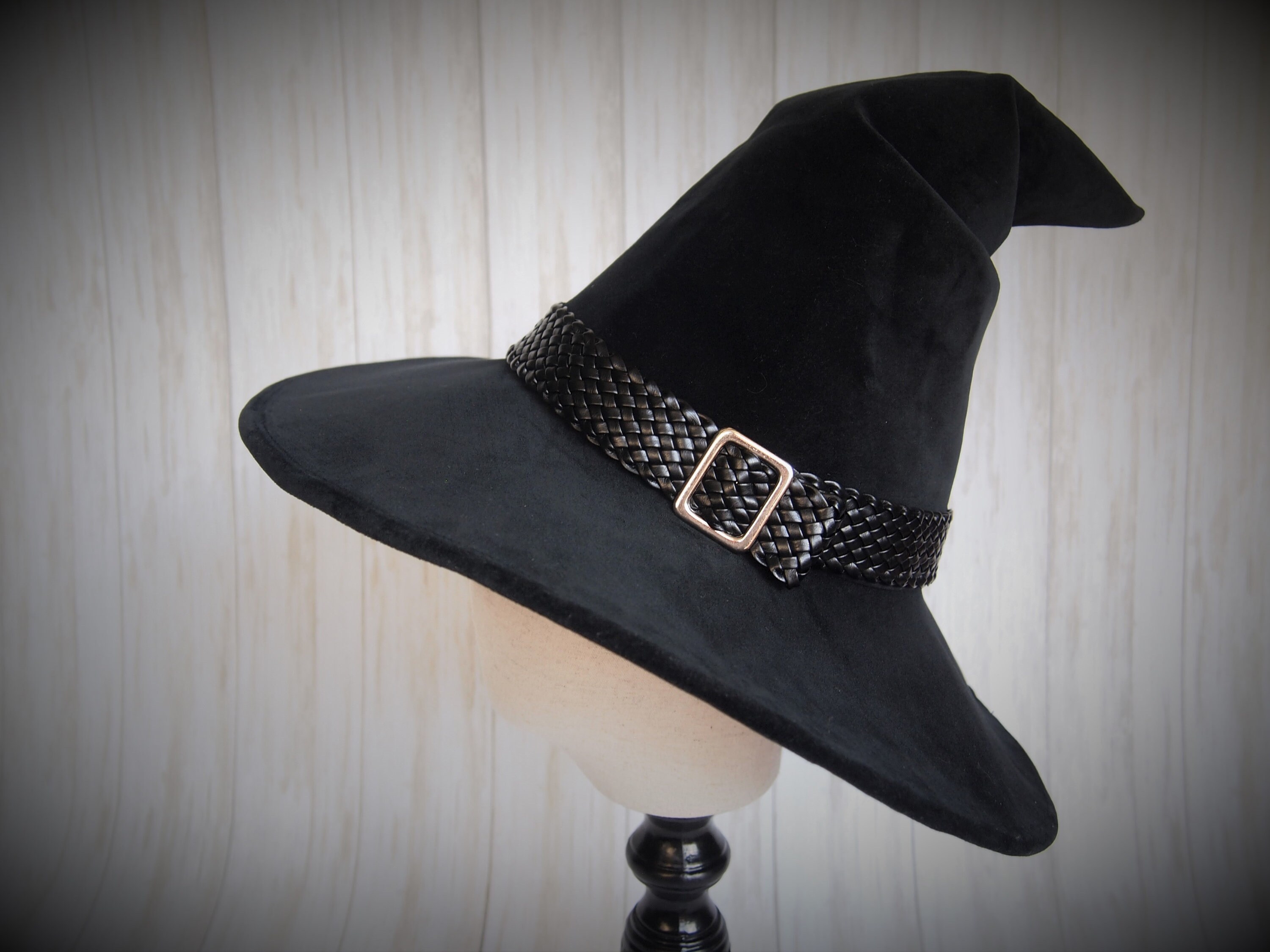 Hand crafted black velveteen Wizard Hat with braided faux leather band and silver buckle detail.