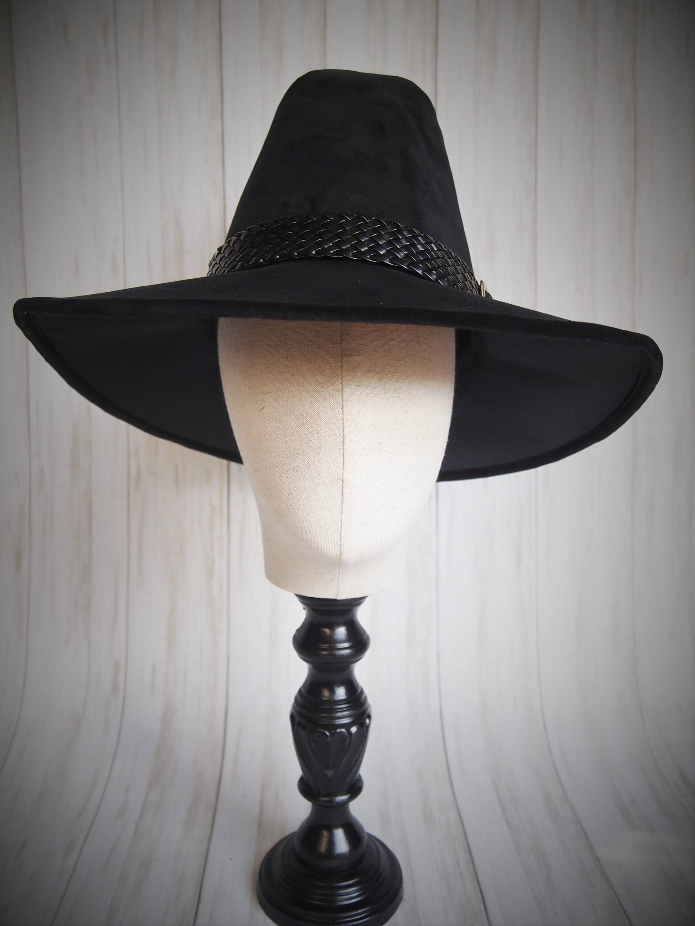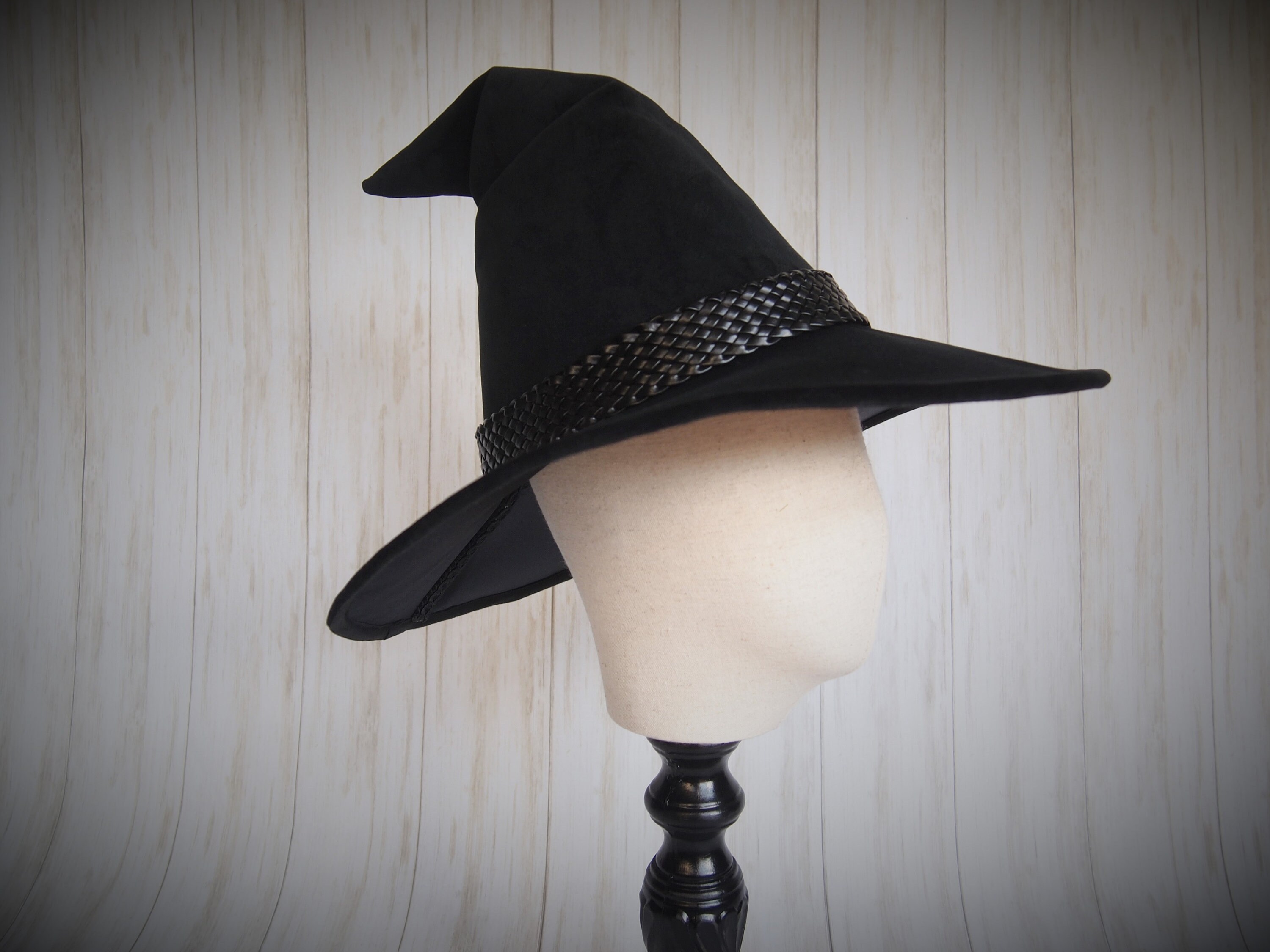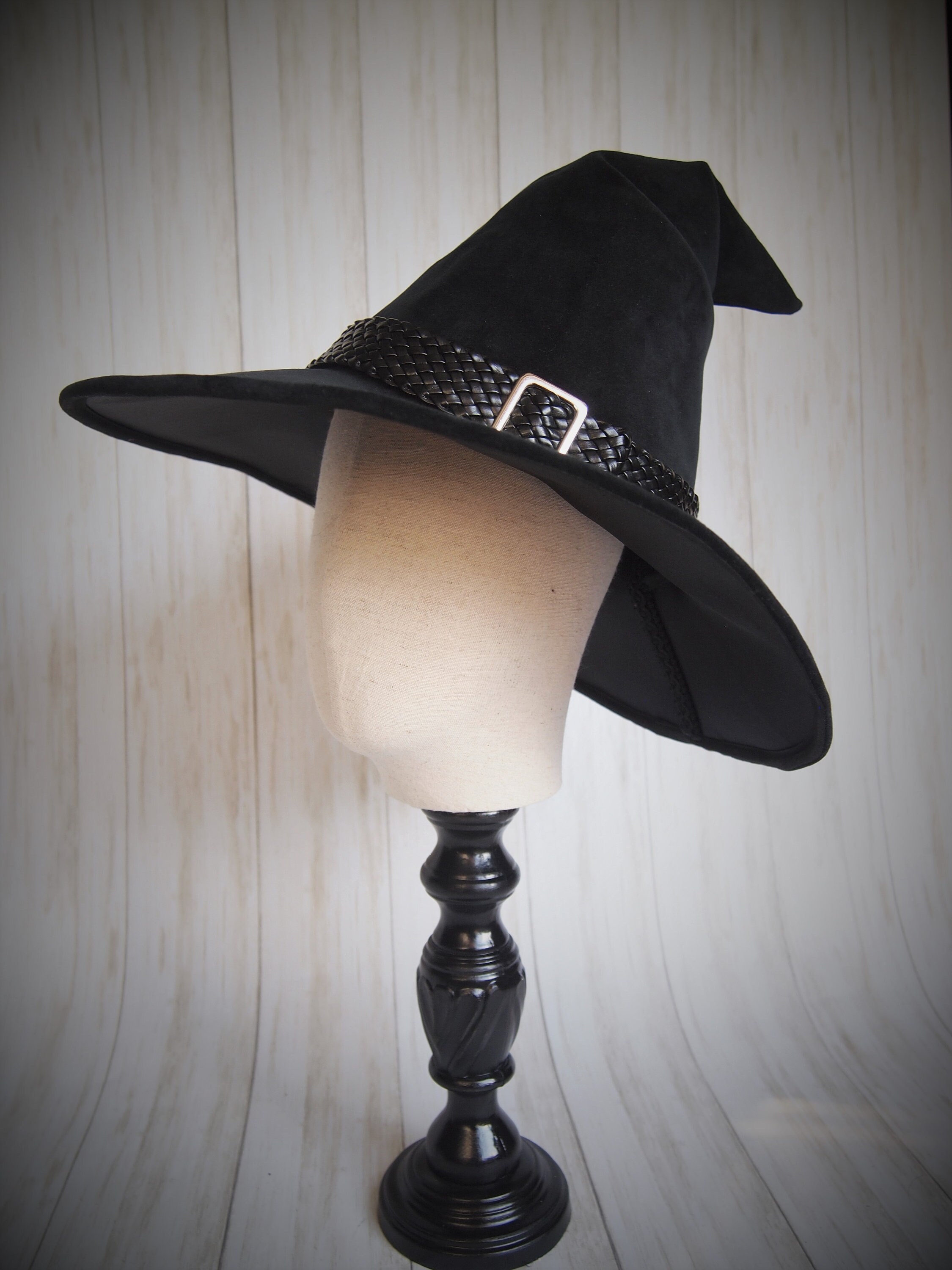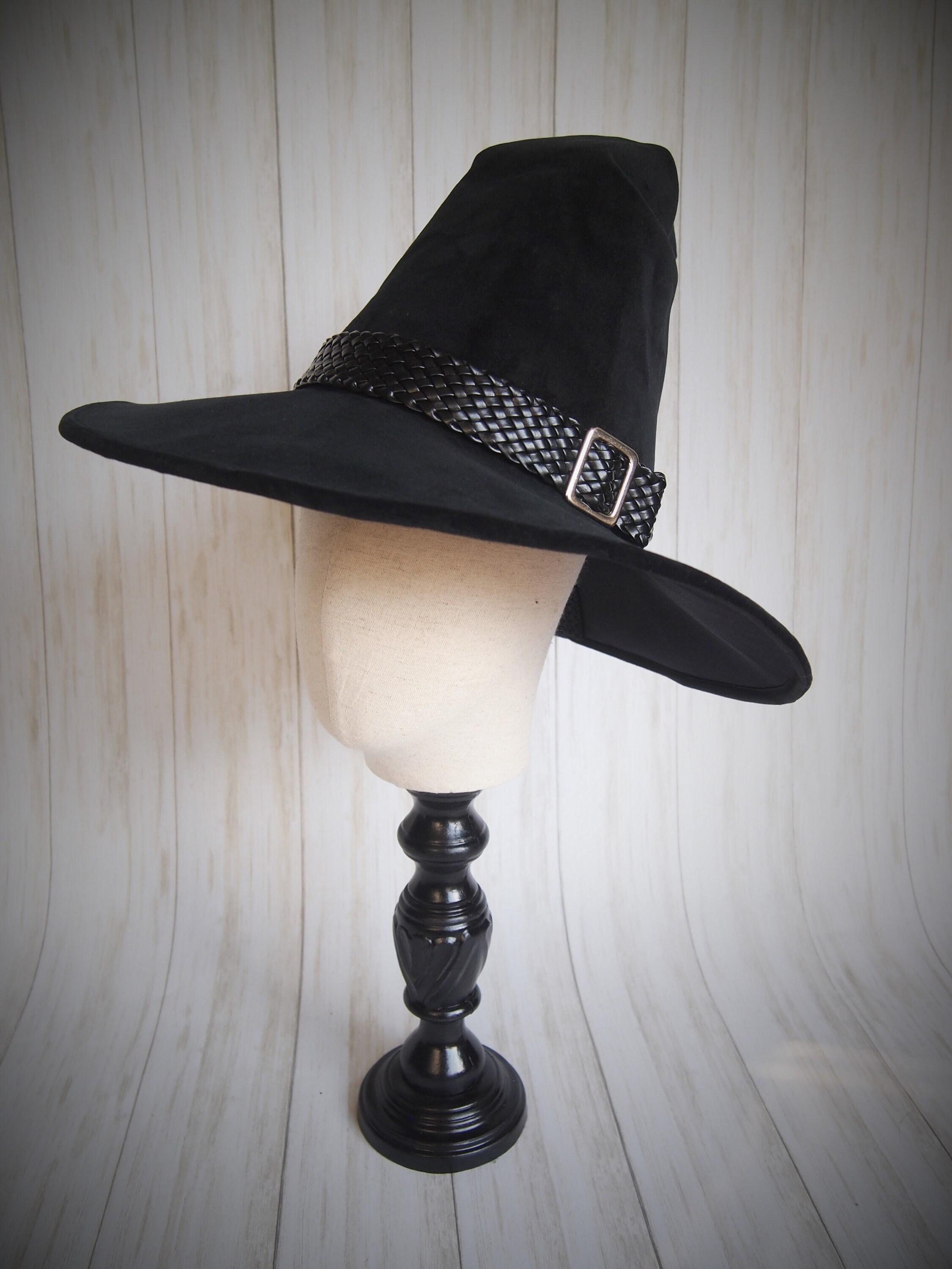 Hand crafted black velveteen Wizard Hat with braided faux leather band and silver buckle detail.